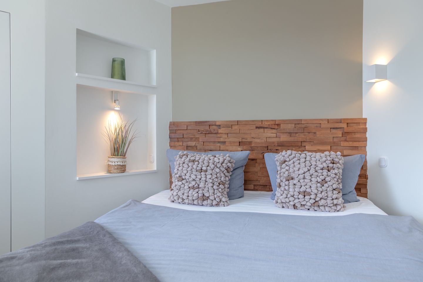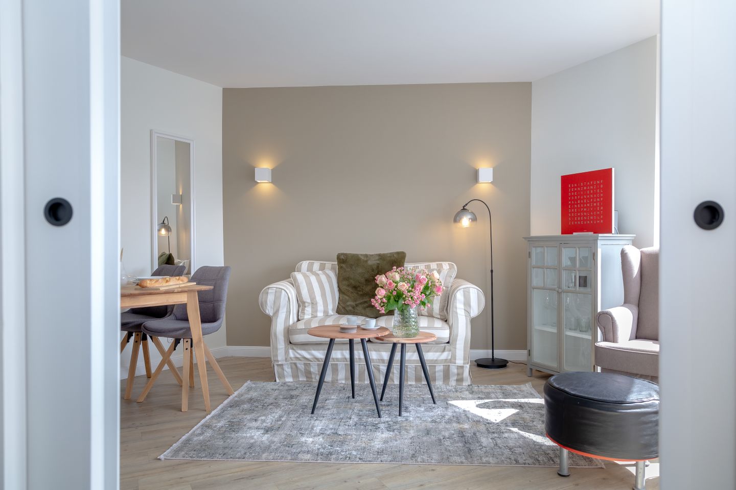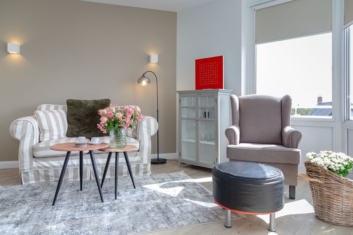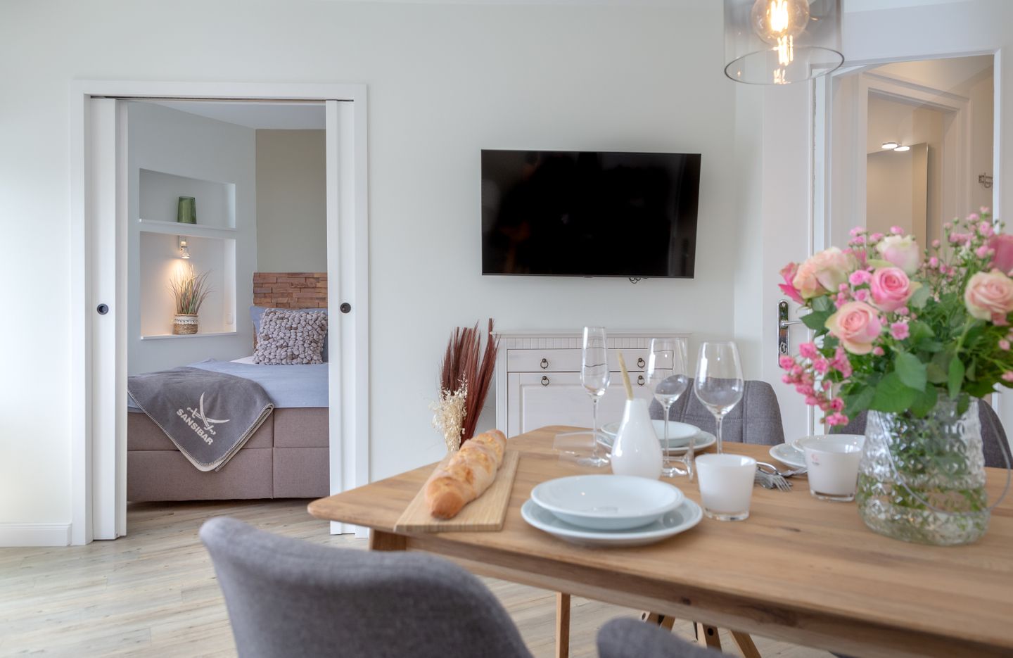 Das Herzstück der Wohnung bildet der helle und elegant gestaltete Wohn- und Schlafbereich, in dem sich sowohl ein komfortables Boxspringbett, als auch ein behagliches Sofa befinden.