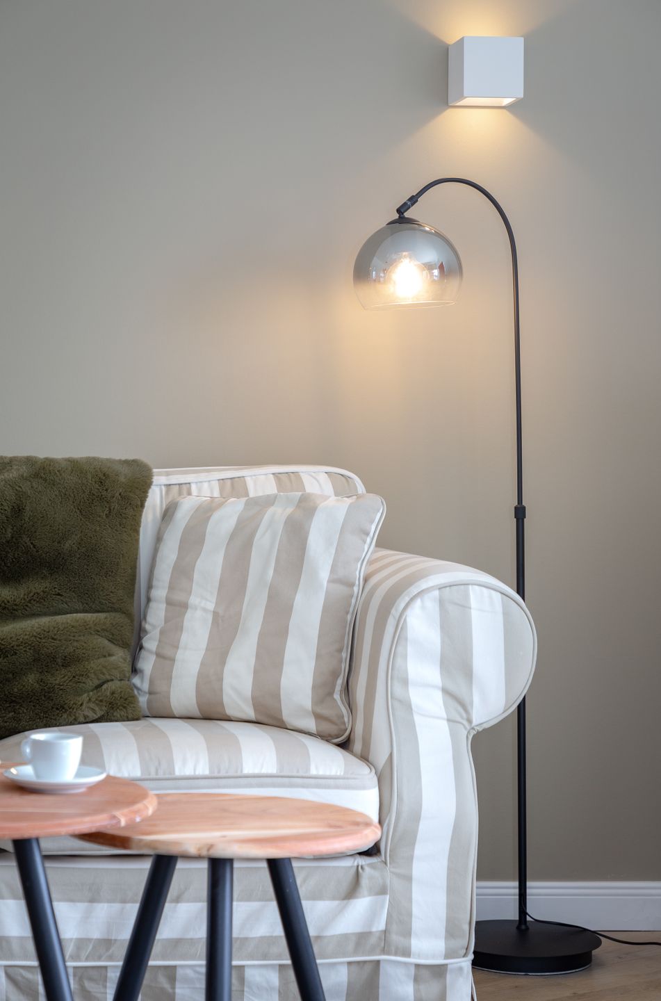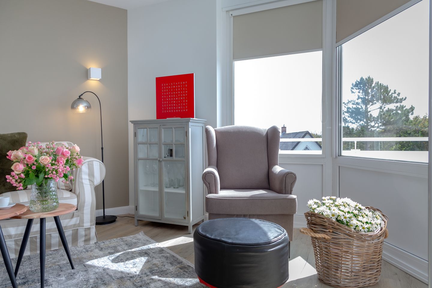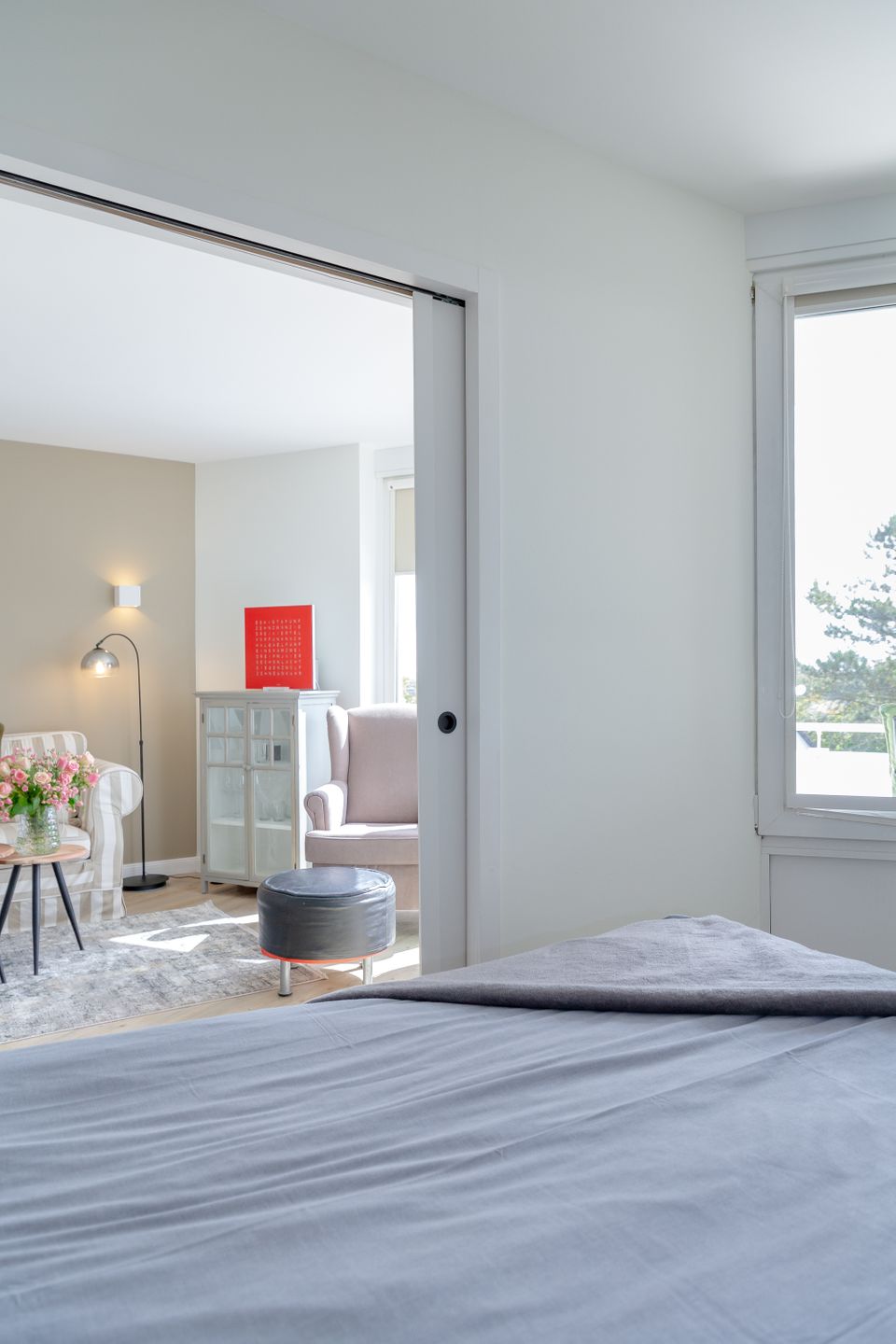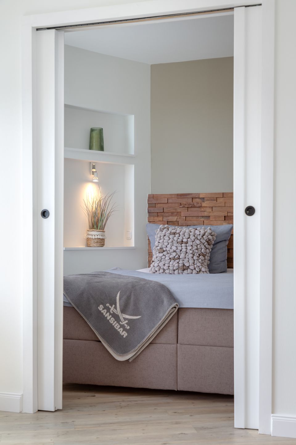 Das Herzstück der Wohnung bildet der helle und elegant gestaltete Wohn- und Schlafbereich, in dem sich sowohl ein komfortables Boxspringbett, als auch ein behagliches Sofa befinden.