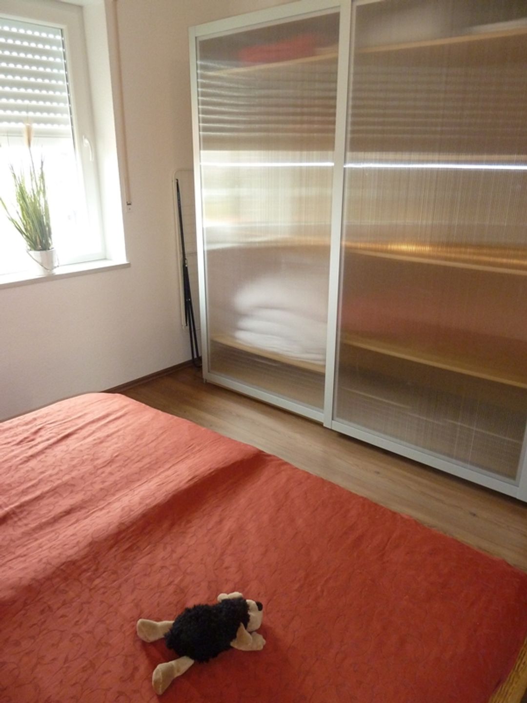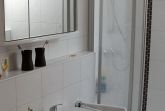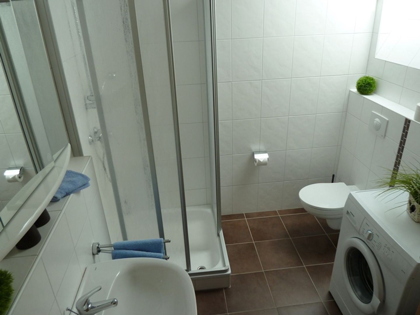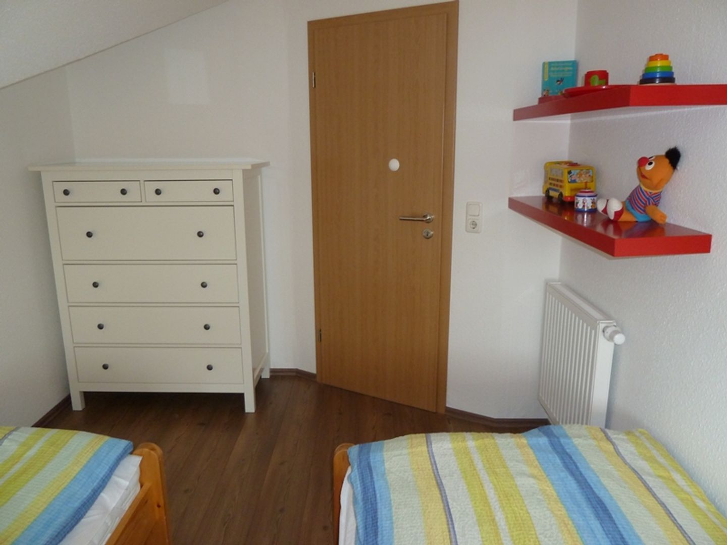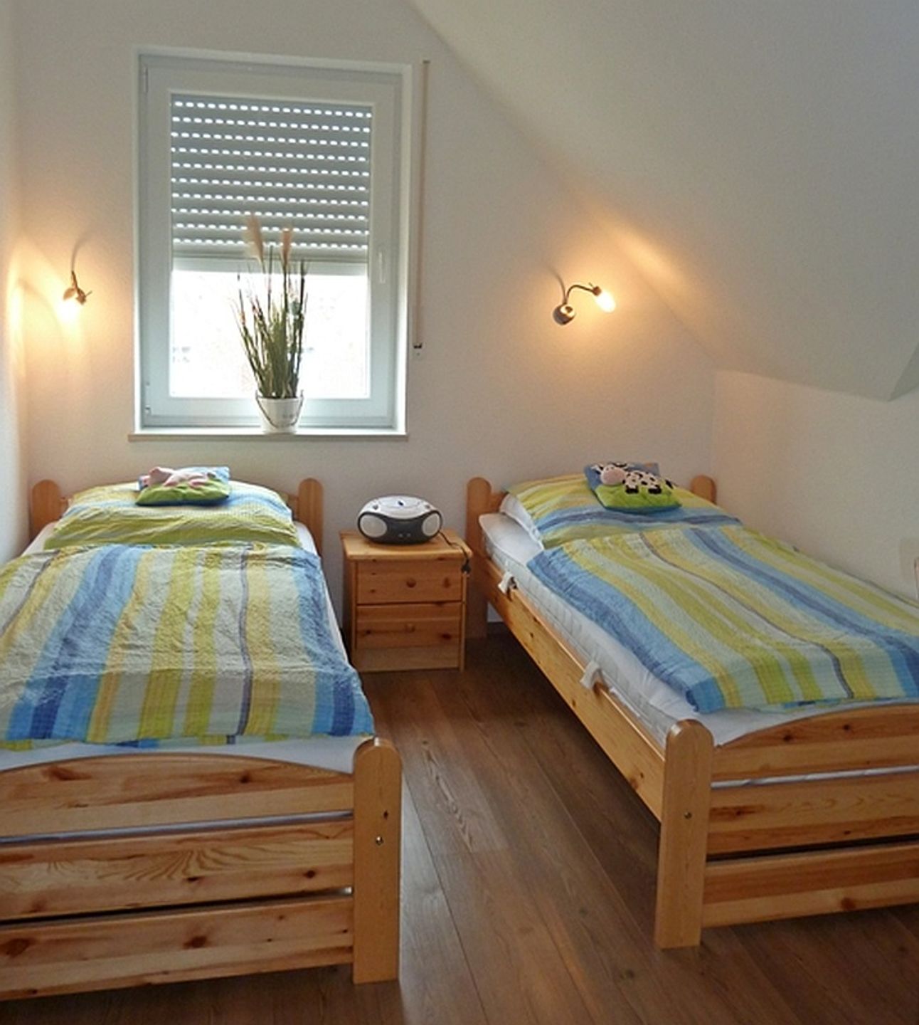 Es gibt zwei gemütliche Schlafräume mit Landhausdielenlaminat und Außenrollläden, eines mit Doppelbett (2x 90cm Matratzen) und eines mit zwei Einzelbetten (90cm Matratzen). Das Tageslicht-Badezimmer verfügt über Dusche, Waschbecken, Waschmaschine, Fön und WC.