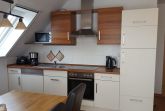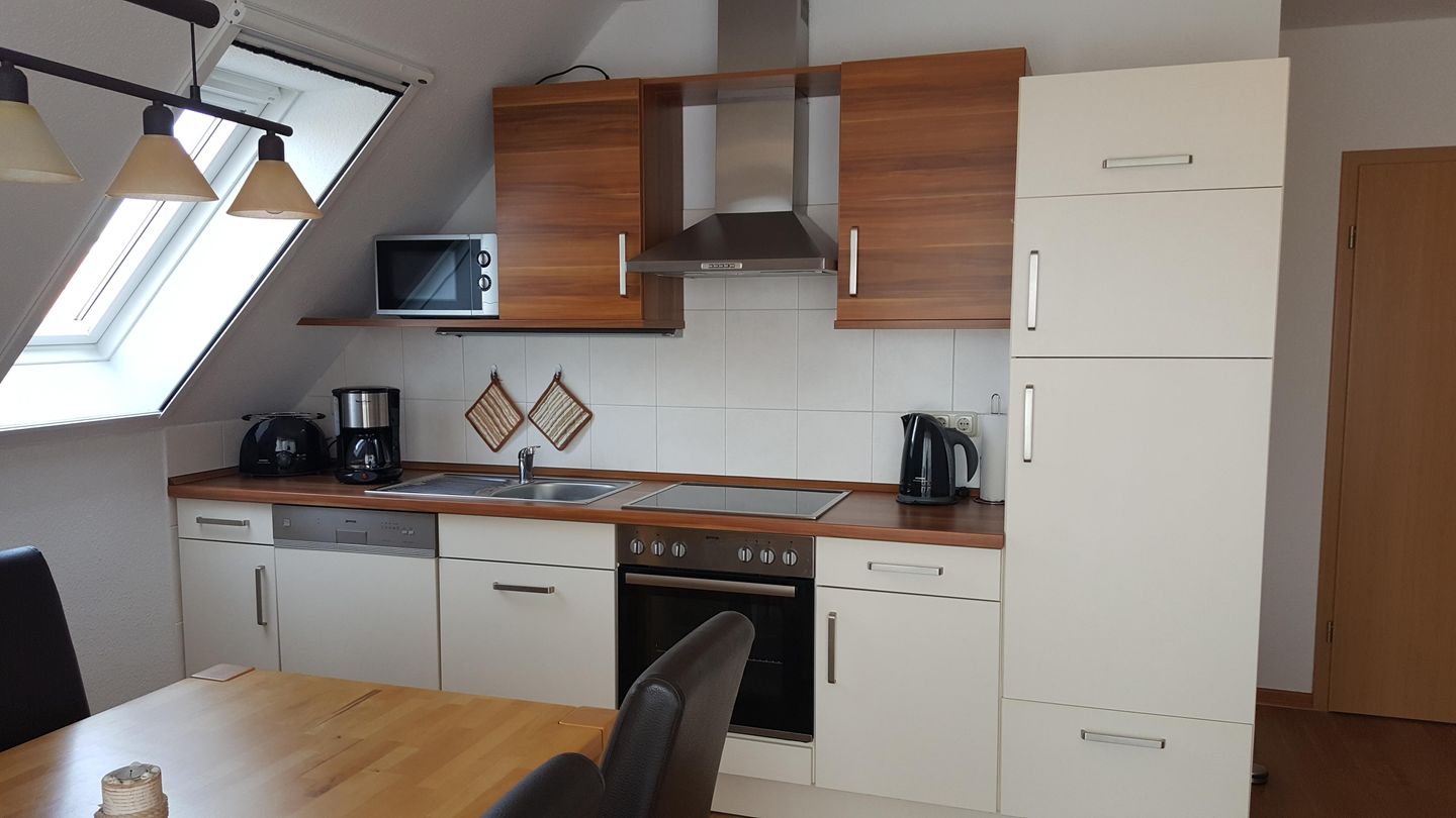 Großer Wohn- Essbereich mit voll ausgestatteter Küche mit Cerankochfeld, Kühl-Gefrierkombination, Geschirrspüler, Mikrowelle, Wasserkocher, Kaffeemaschine und Toaster.