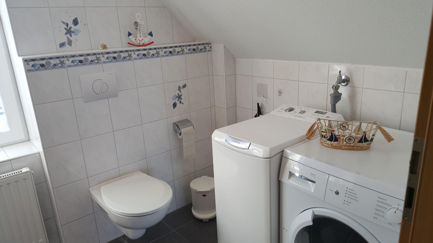Das schöne Duschbad ist mit einer Wasch- und Trockenmaschine ausgestattet.