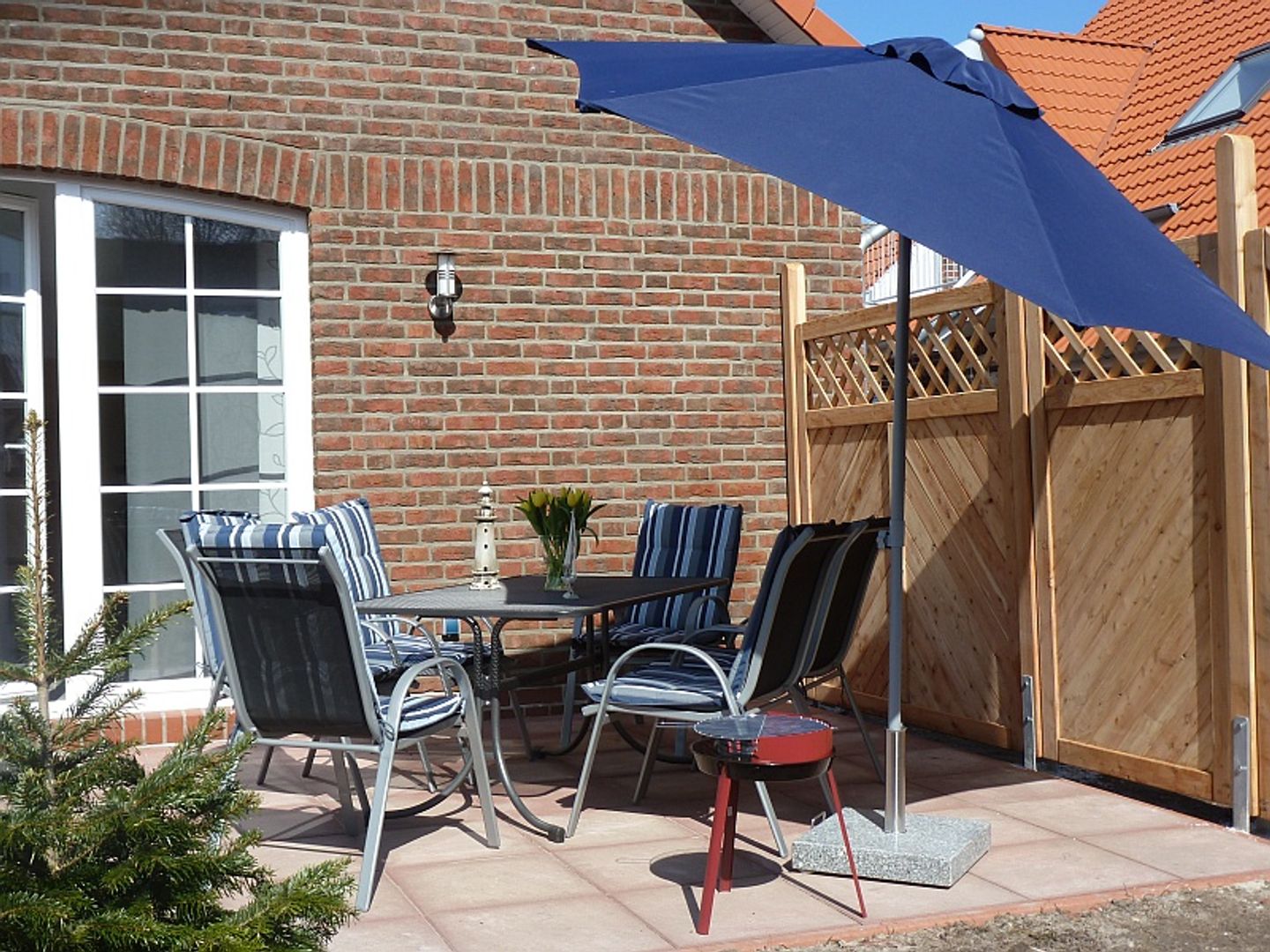 Eine schöne, große und möblierte Terrasse mit Strandkorb und zwei Gartenliegen lädt zum Verweilen ein. Es gibt ein Gartenhaus mit Platz zum Abstellen mitgebrachter Fahrräder und einen Stromanschluss.