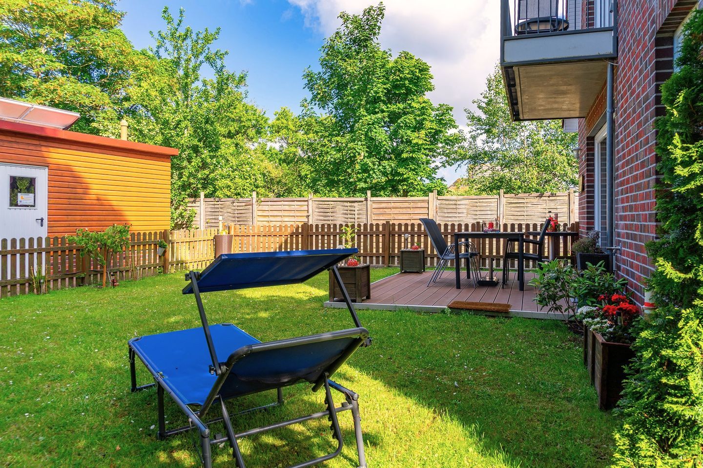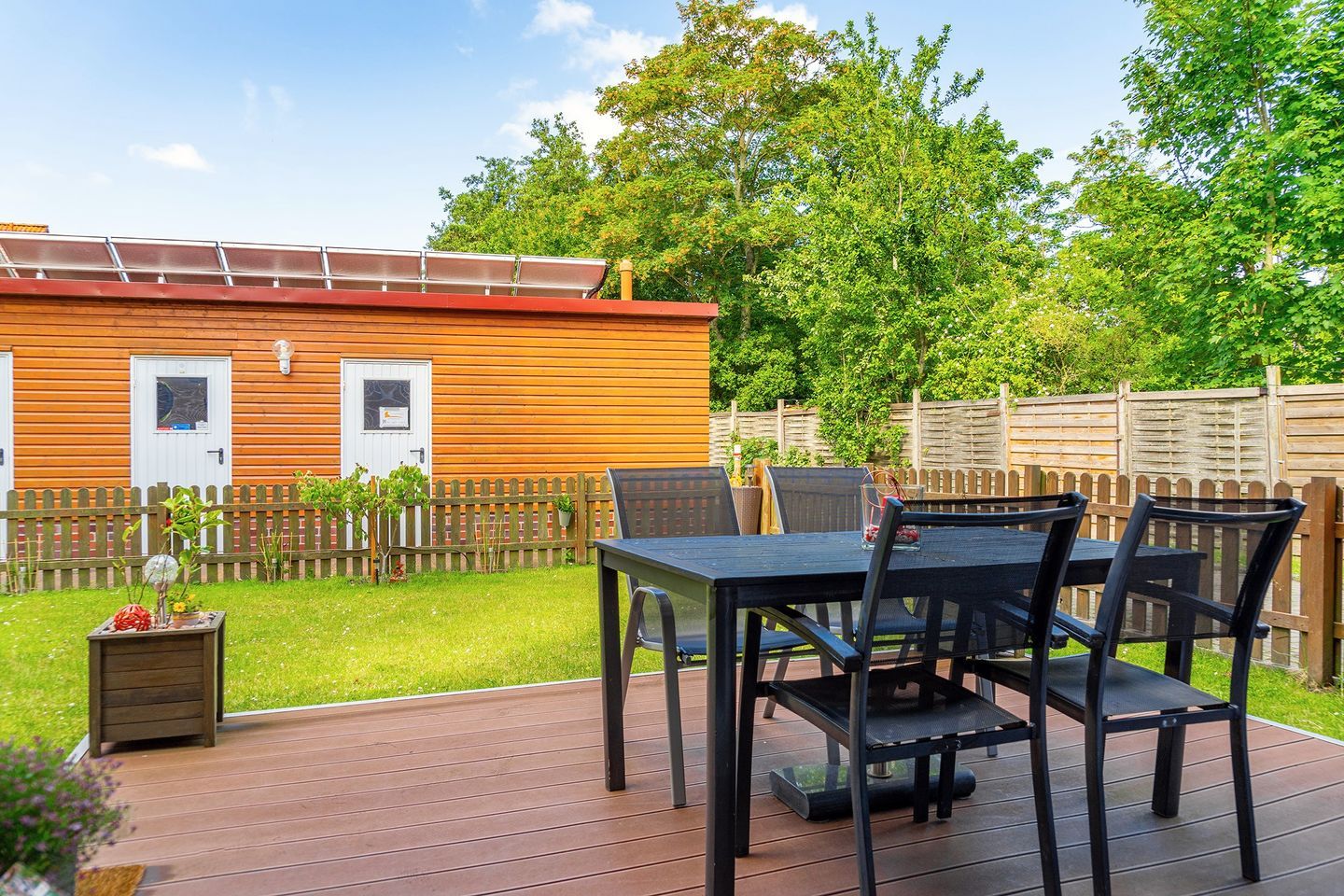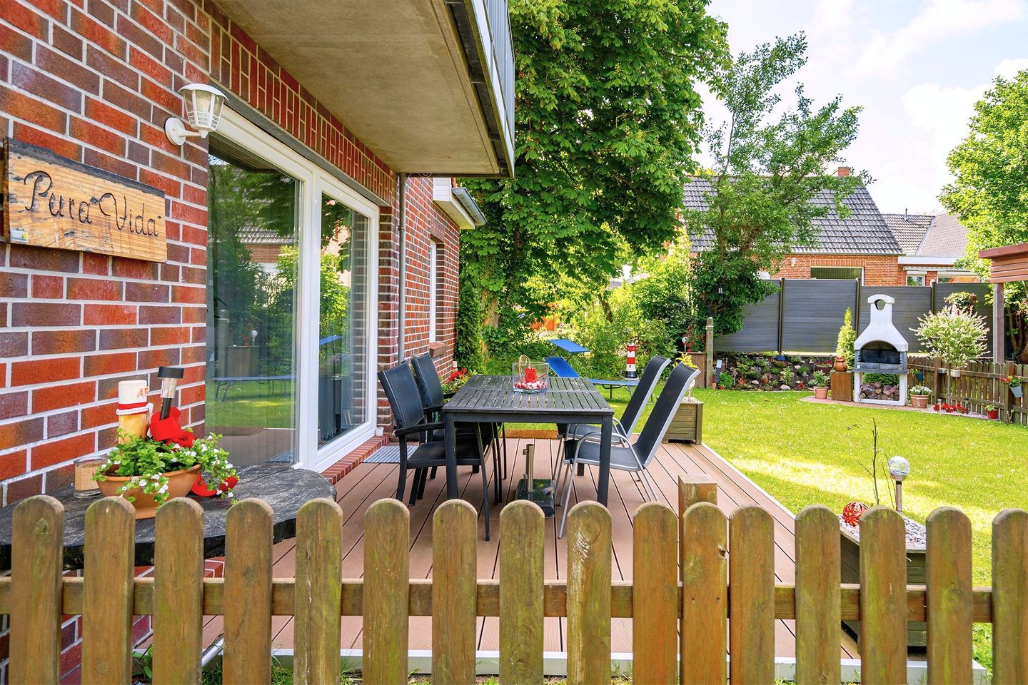 Vom Wohn- Essbereich kommen Sie auf die schöne Holz Terrasse aus Bambus und in den schönen kleinen geschützten Garten. Dort gibt es Mobiliar und einen festen Grill für gemütliche Stunden.