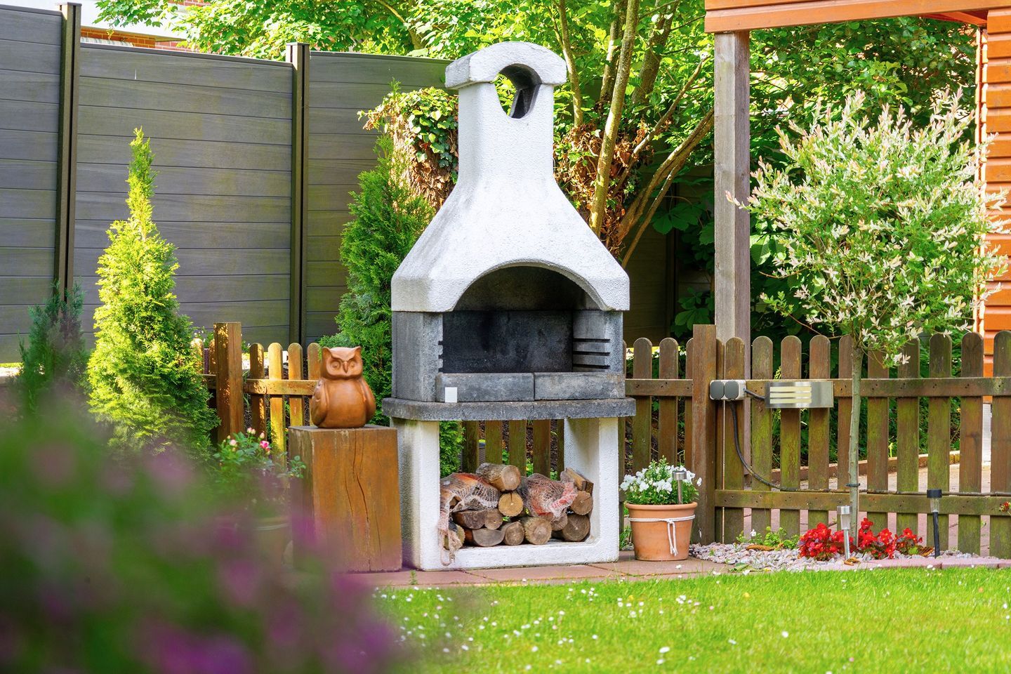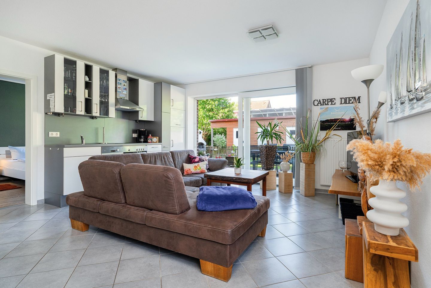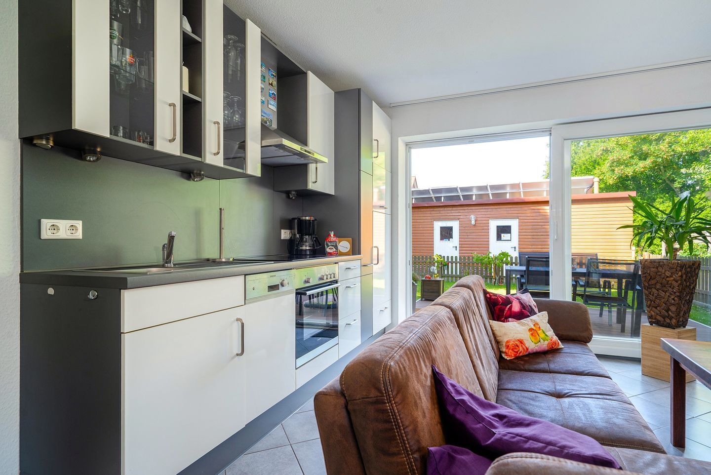 Vom Wohn- Essbereich kommen Sie auf die schöne Holz Terrasse aus Bambus und in den schönen kleinen geschützten Garten. Dort gibt es Mobiliar und einen festen Grill für gemütliche Stunden.