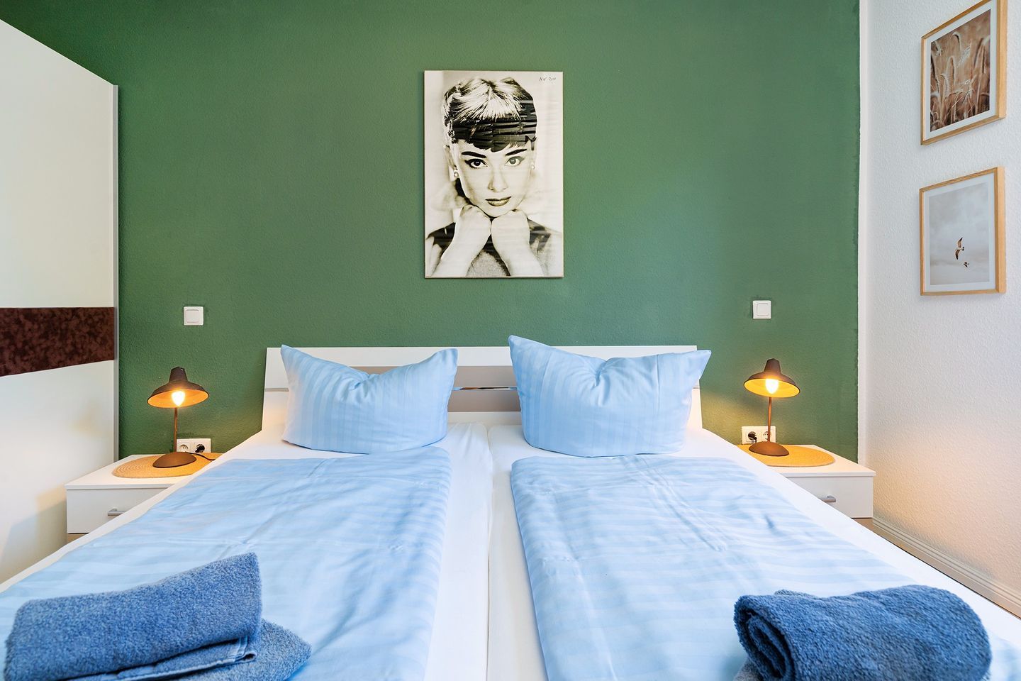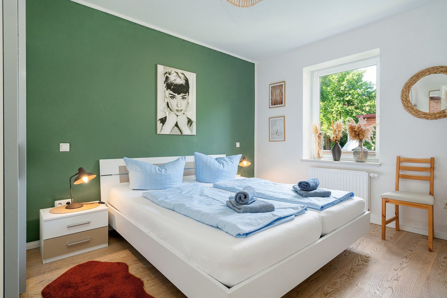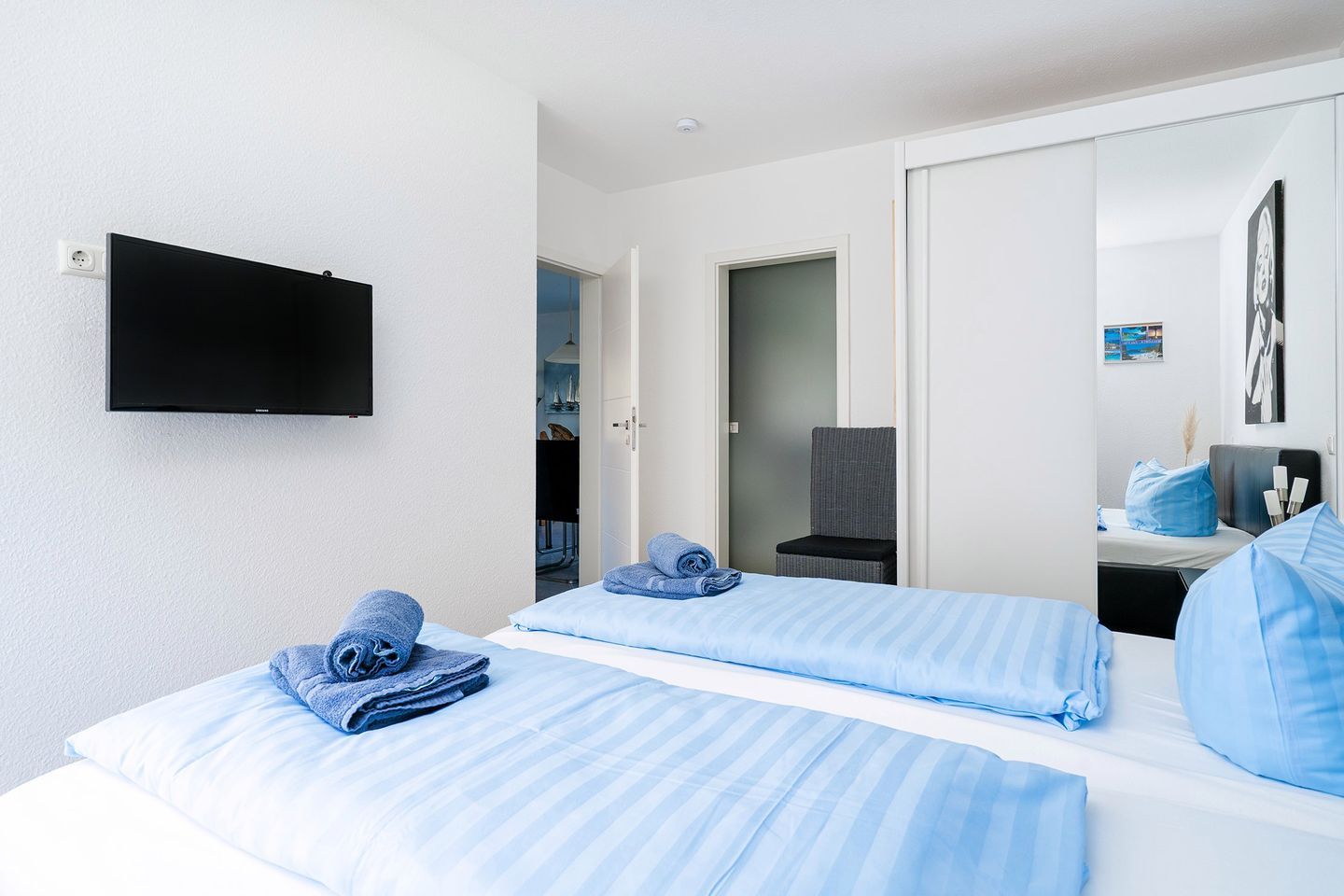 Zwei schöne Schlafräume jeweils mit einem Doppelbett und Sat-TV ausgestattet. Ein Schlafraum ist mit einem großzügigen begehbarem Kleiderschrank ausgestattet.