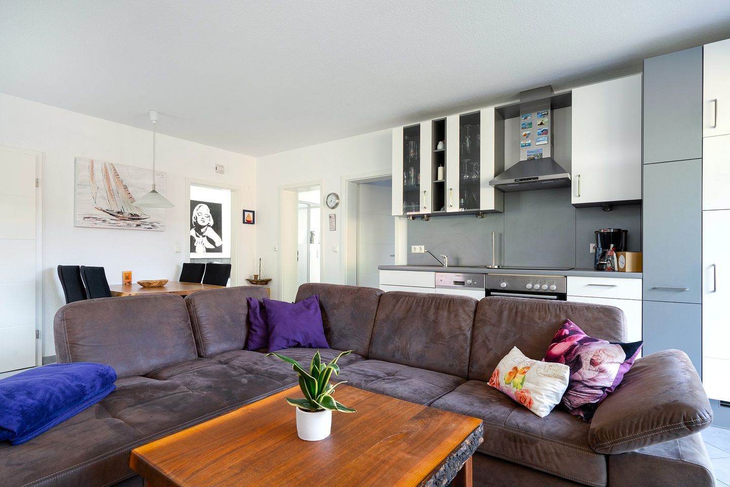 Die Einbauküche ist voll ausgestattet mit Cerankochfeld, Backofen, Mikrowelle, Geschirrspülmaschine, Kühlschrank mit Gefrierfach, Kaffeemaschine, Toaster, Wasserkocher u. v. m.