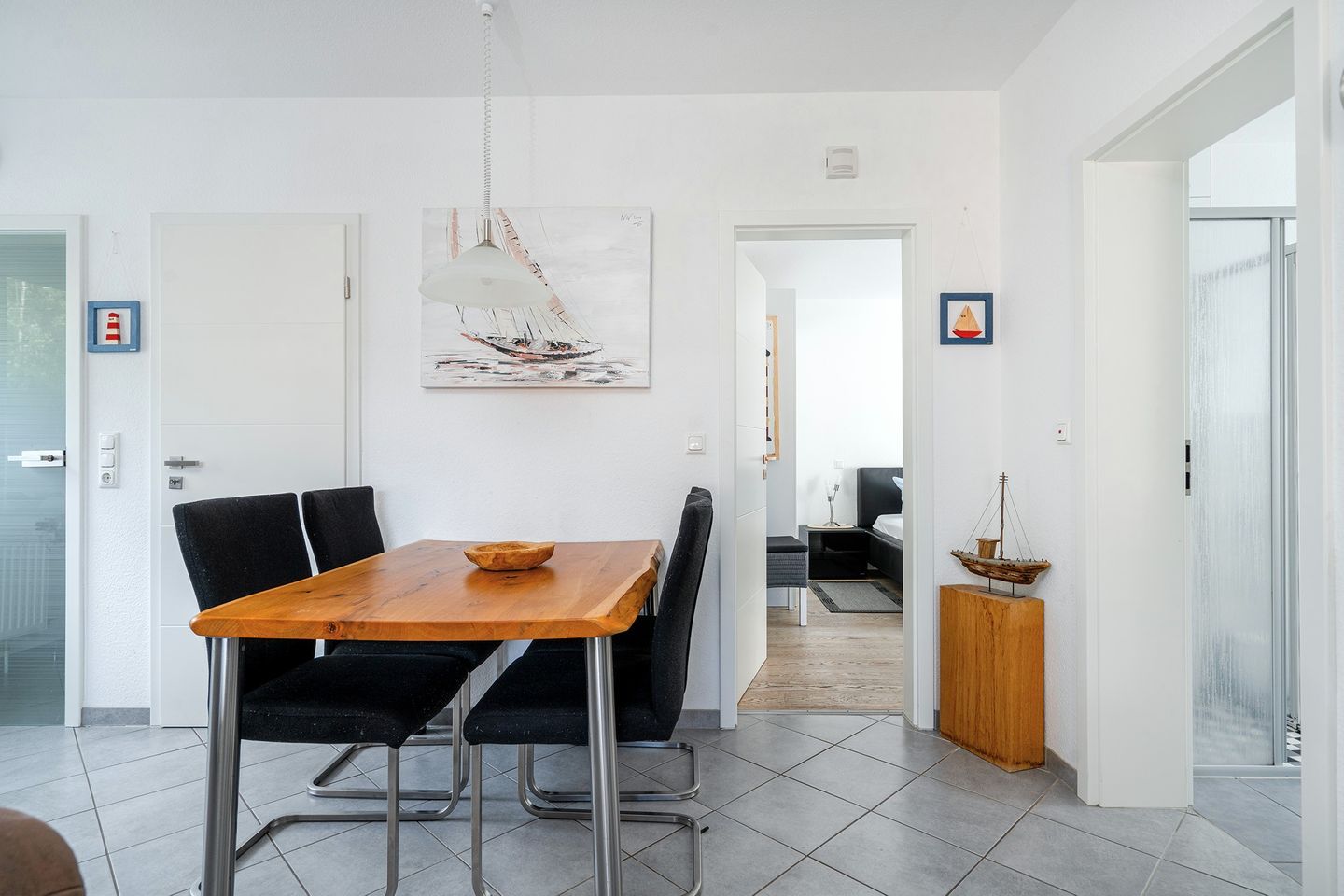 Die Fußböden sind im Wohn- Essbereich sowie im Bad gefliest. Die Schlafräume sind mit Eiche geöltem Parkett ausgelegt.