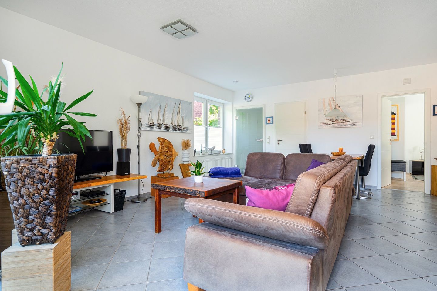 Großer lichtdurchfluteter Wohn- Essbereich mit schöner Sitzecke, SAT-TV und HiFi-Anlage.