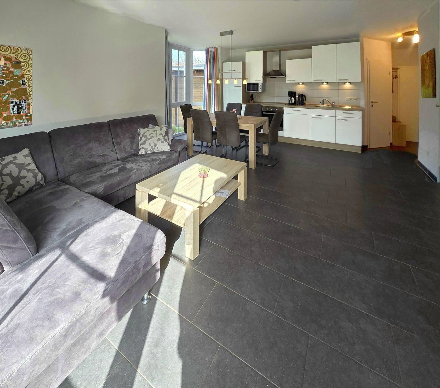 Ein großzügiger Wohn- Essbereich mit schöner, reichhaltig ausgestatteter Küche, z. B. Backofen, Mikrowelle, Geschirrspülmaschine, Kühlschrank mit Gefrierfach, Kaffeemaschine, Wasserkocher, Toaster, Mixer u.v.m., steht Ihnen zur Verfügung, ebenso eine gemütliche Sitzecke mit LCD-TV , Radio und CD.