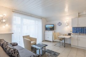 Die Ferienwohnung mit einer Größe von ca. 35m² Wohnfläche ist ideal für 2 Personen ausgestattet (3 Personen finden hier auch platz). 1 Wohnzimmer mit Essplatz, Sofa-/Schlafsofa, Sessel, 1 Flachbildfernseher, Küchenzeile (Cerankochfeld, Backofen, Kühlschrank, Mikrowelle, Kaffeemaschine, Wasserkocher und Toaster) und Zugang zum kleinen Balkon, 1 Schlafzimmer im Obergeschoss (über eine schmalere Treppe erreichbar) mit 2 Einzelbetten und Schrank, Flur, Bad mit Dusche, WC, Waschbecken, Spiegel und Fenster, Nichtraucherwohnung, keine Haustiere, PKW Stellplatz am Haus.