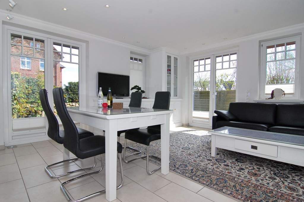 Exklusiver Endhausteil mit Südostterrasse und Strandkorb. Ca. 95m². Nichtraucher. EG: Wohnzimmer mit 2 Couchen und Essplatz, TV, Stereoanlage, Internet, Flat-Rate ins dt. Festnetz. Separate Küche mit Geschirrspüler, Backofen, Mikrowelle und Gefrierfach. Gäste-WC mit Waschmaschine und Trockner ( Münzautomat). OG: 2 Schlafzimmer mit Doppelbetten (200x220) und TV. Bad mit Wanne/ Dusche und Bidet. DG: Sauna (Münzautomat) und Duschbad/ WC. Stellplatz am Haus. Tierhaltung ist nicht gestattet. Allergiker freundlich! Alle Räume gefliest. Schallschutzfenster zur Maybachstraße. Gartenhaus. Kostenpflichtige Wallbox/E-Ladestation) für Autos vorhanden (Euro 5,-/Tag). Bettwäsche und Handtücher sind zur Anreise aufgezogen.