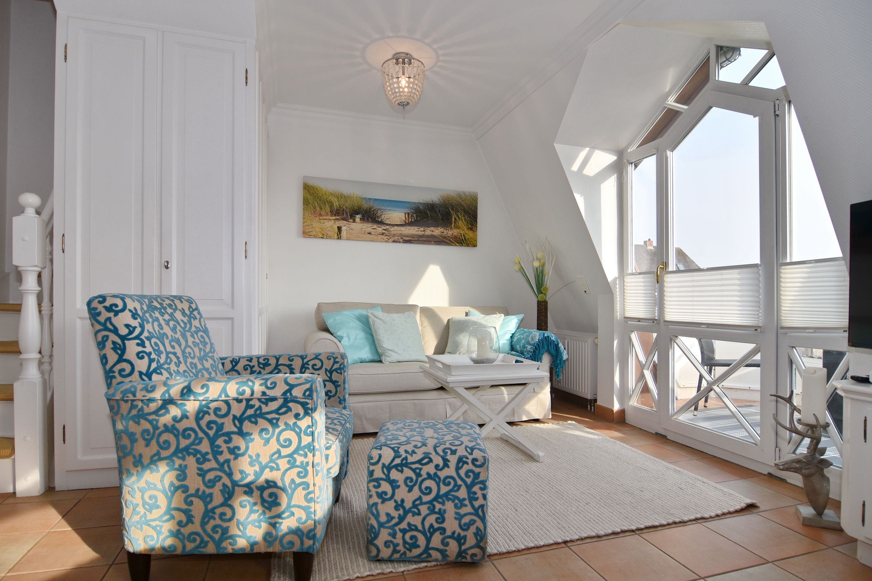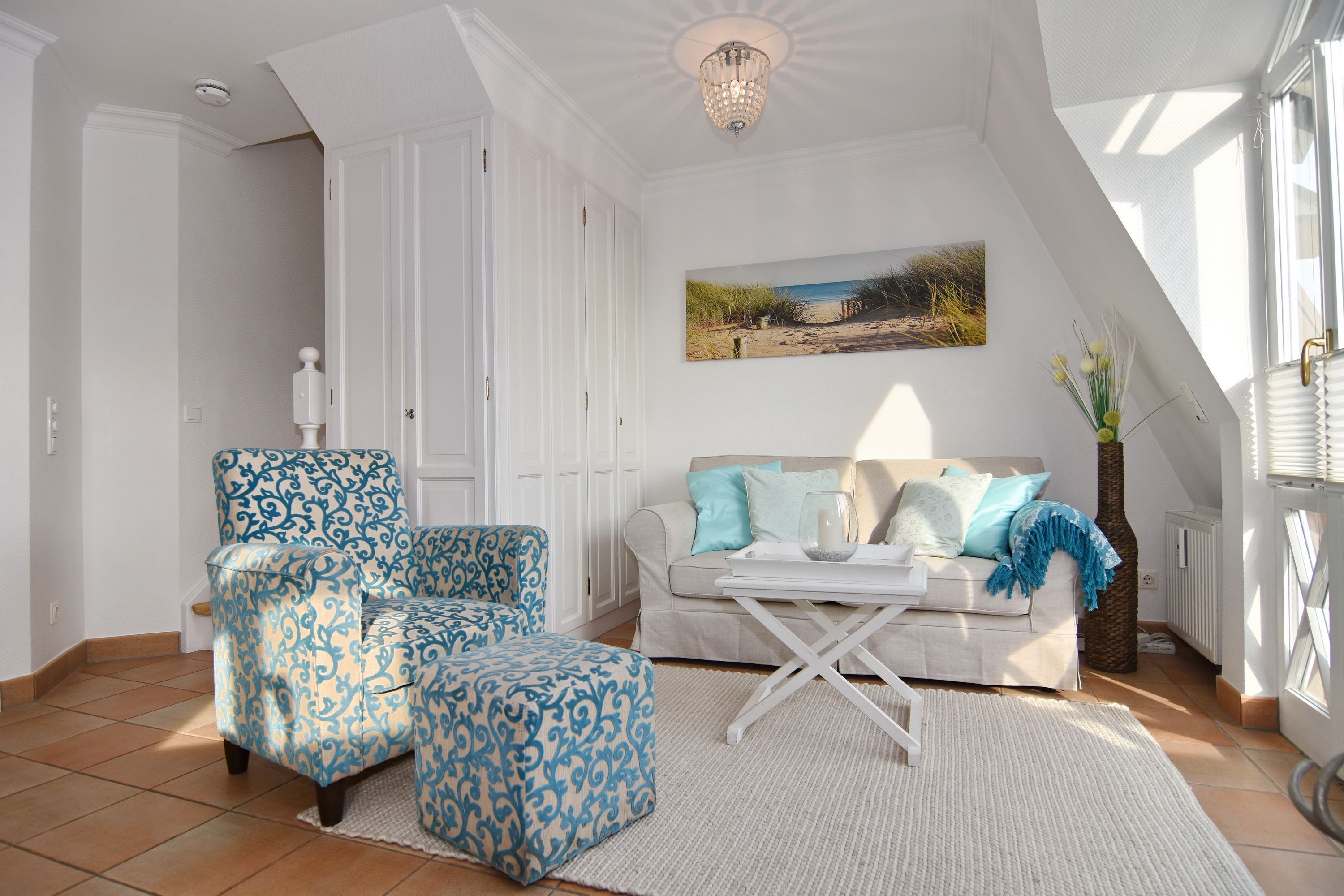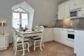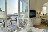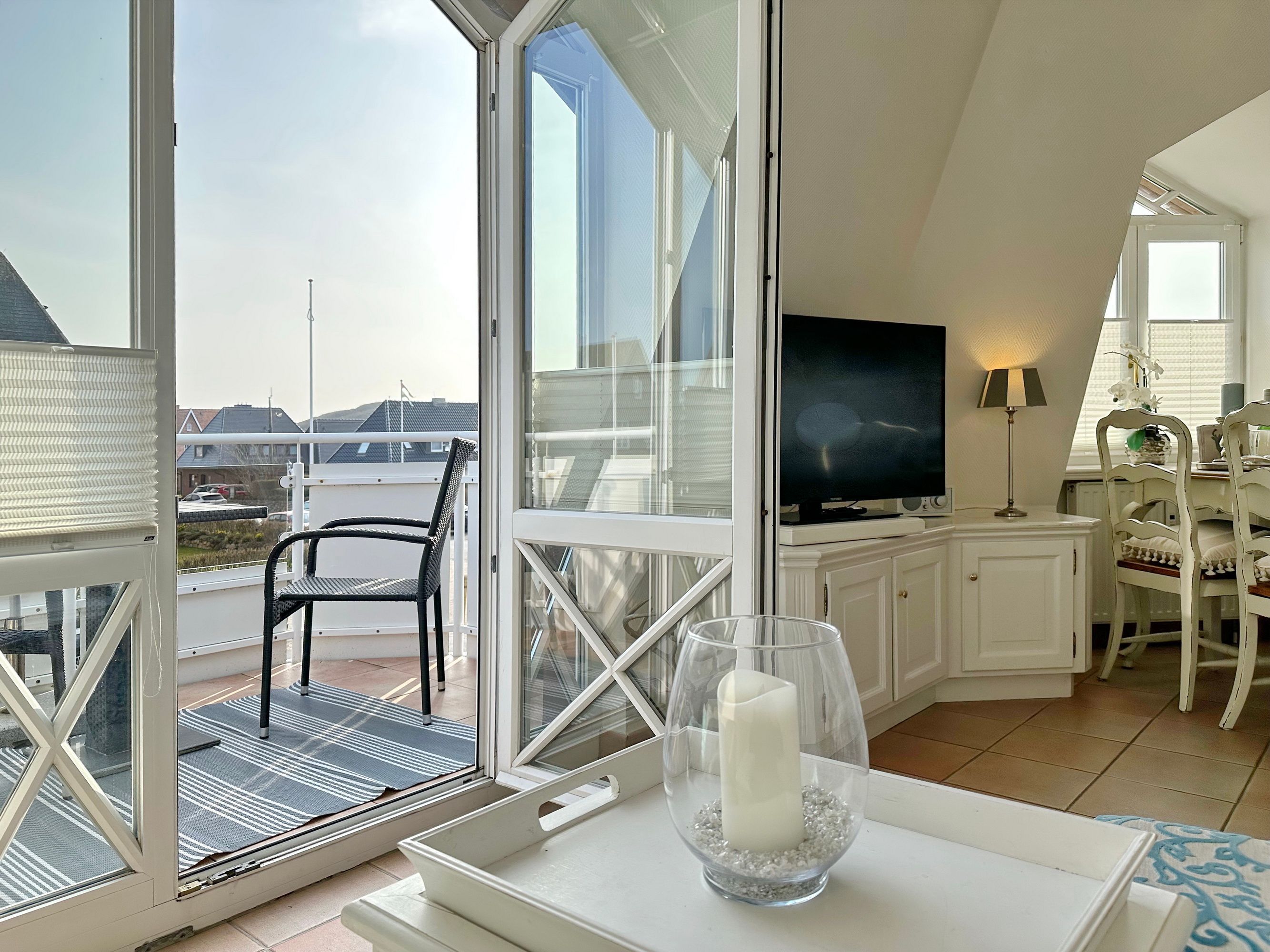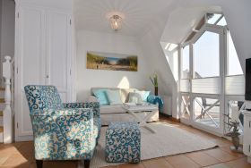 Sie betreten die Wohnung im 1. Obergeschoss und gelangen vom Flur in den Wohnbereich sowie ins Badezimmer mit Wanne und Duschvorrichtung. In einer kleinen Abseite befindet sich ein Wasch-/Trockner. Der Wohnraum bietet Ihnen eine gemütliche Sitzecke bestehend aus Sofa und Sessel, einen Essplatz für 4 Personen und die offene Küche mit Geschirrspüler, Mikrowelle, Backofen, Nespresso-Maschine und kompletter Küchenausstattung. Vom Wohnzimmer gelangen Sie auf den möblierten Südbalkon. Eine Treppe führt Sie in das darüberliegende Schlafzimmer mit Doppelbett (2 Matratzen + 1 Topper 1,60 x 2,00m), Einbauschrank und Flat-TV. Das Schlafzimmer hat eine Tür. Bettwäsche und Handtücher sind zur Anreise aufgezogen.