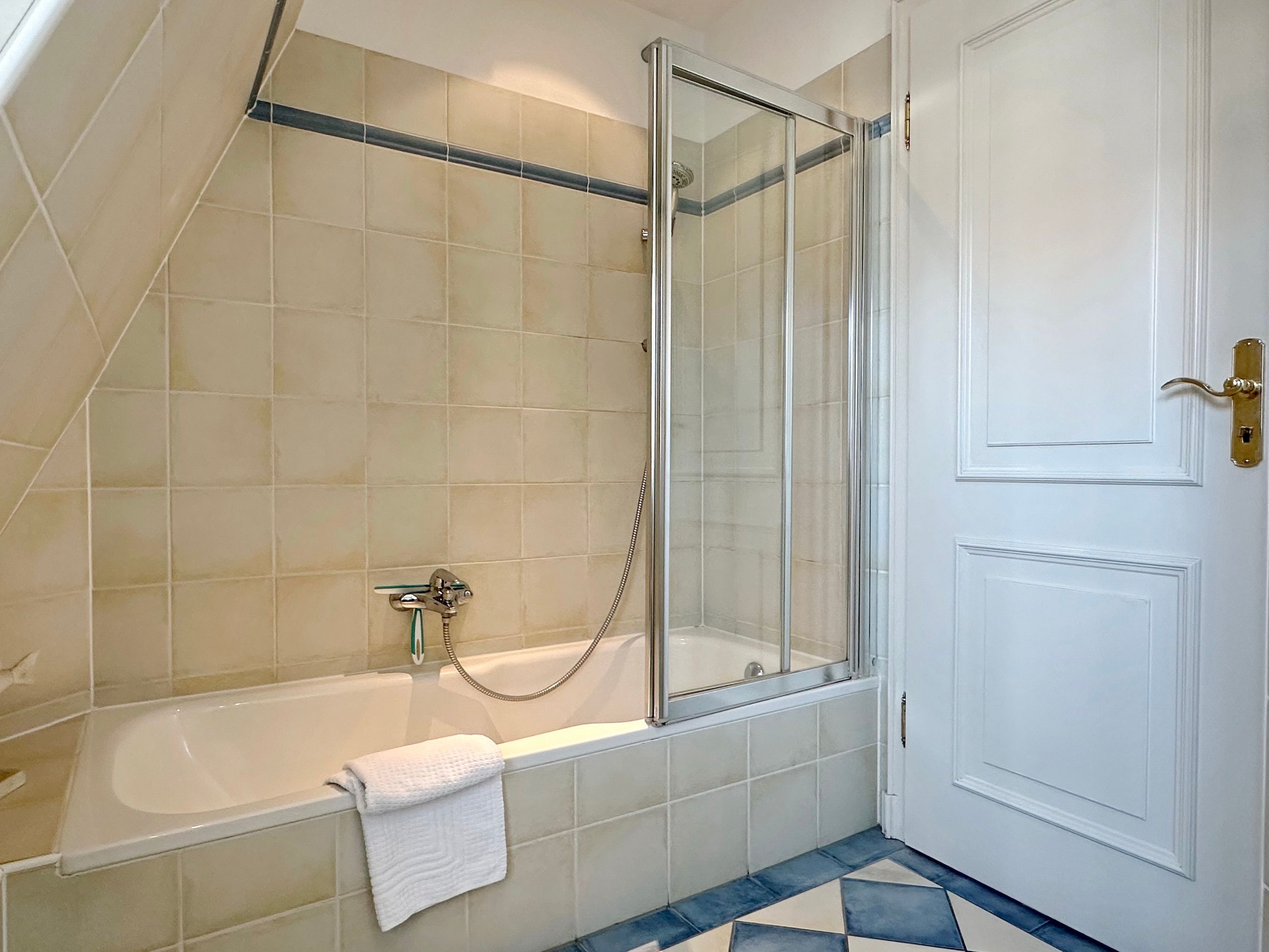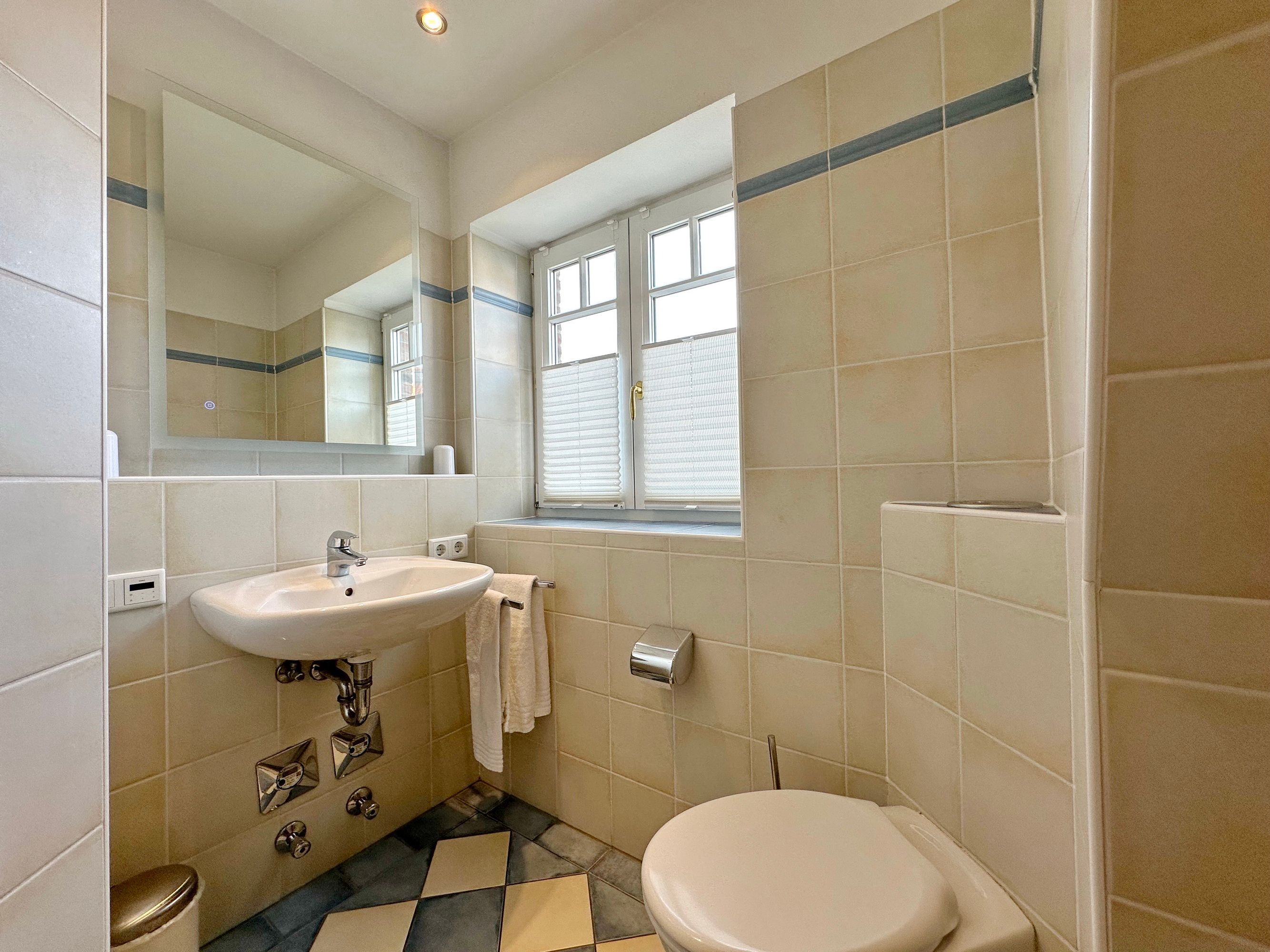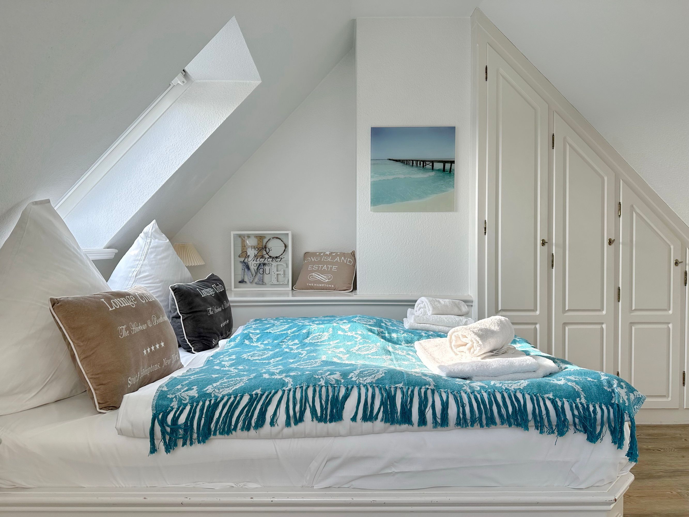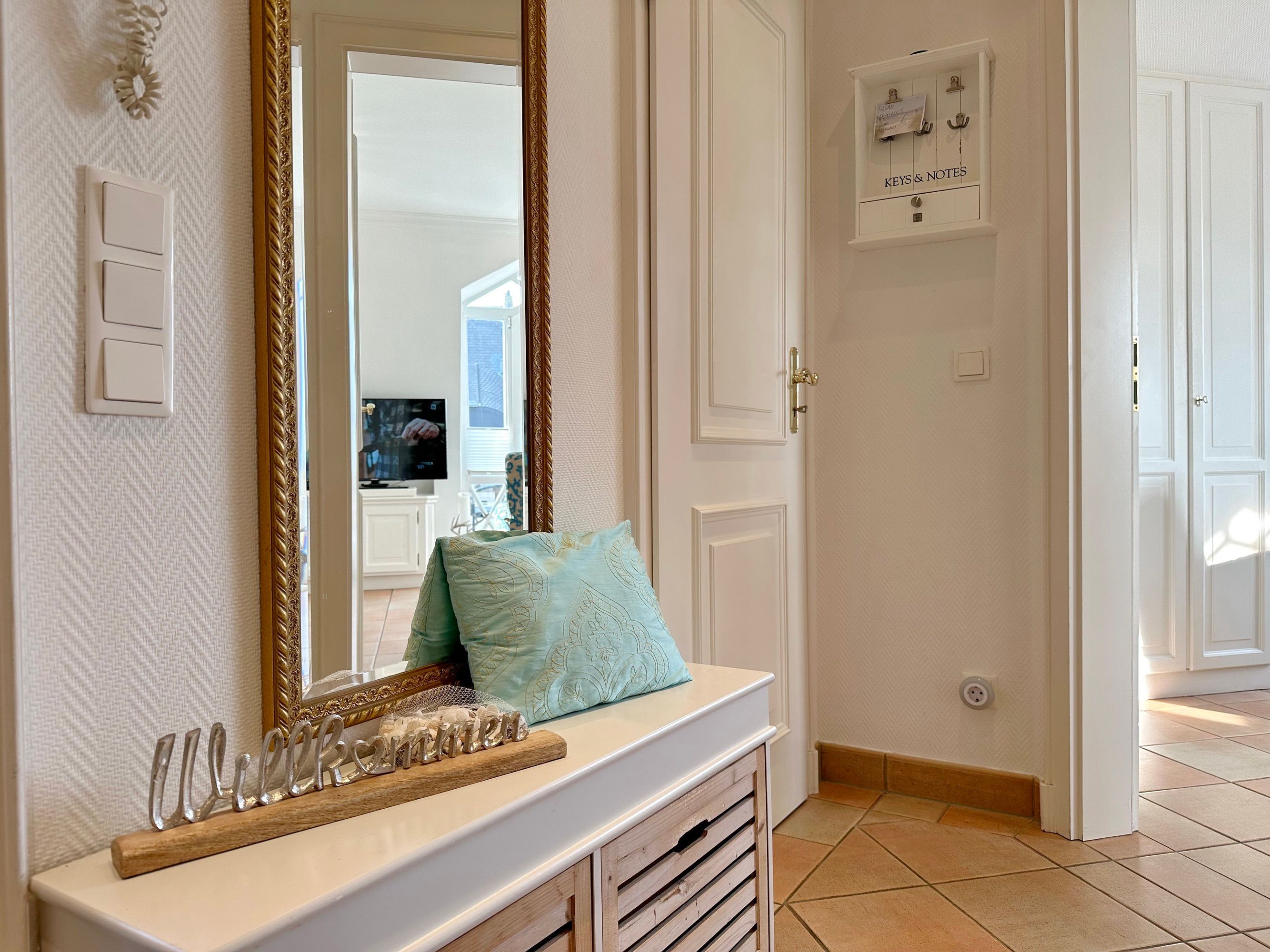Sie betreten die Wohnung im 1. Obergeschoss und gelangen vom Flur in den Wohnbereich sowie ins Badezimmer mit Wanne und Duschvorrichtung. In einer kleinen Abseite befindet sich ein Wasch-/Trockner. Der Wohnraum bietet Ihnen eine gemütliche Sitzecke bestehend aus Sofa und Sessel, einen Essplatz für 4 Personen und die offene Küche mit Geschirrspüler, Mikrowelle, Backofen, Nespresso-Maschine und kompletter Küchenausstattung. Vom Wohnzimmer gelangen Sie auf den möblierten Südbalkon. Eine Treppe führt Sie in das darüberliegende Schlafzimmer mit Doppelbett (2 Matratzen + 1 Topper 1,60 x 2,00m), Einbauschrank und Flat-TV. Das Schlafzimmer hat eine Tür. Bettwäsche und Handtücher sind zur Anreise aufgezogen.