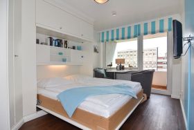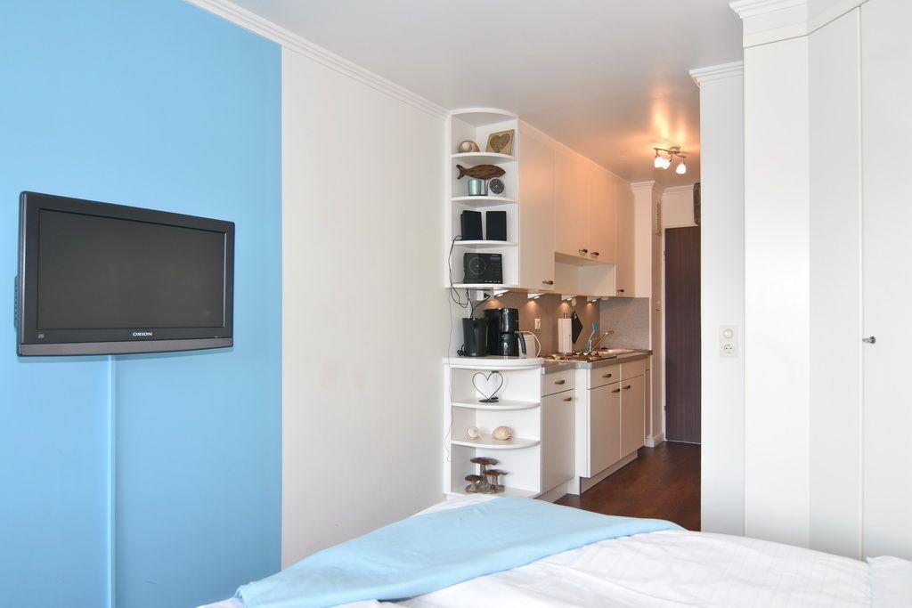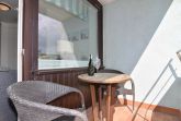 Modernes 1- Zimmer- Apartment ca. 23 m² im 1. OG, im Haus Metropol ,  Nichtraucher. Wohn-/ Schlafraum mit Doppelschrankbett, 2 Sessel und Esstisch am Fenster, TV, Radio, W-Lan (ohne Gewähr), Ostbalkon mit Balkonmöbeln, Küchenzeile im Flurbereich, Duschbad/ WC. Tierhaltung und Rauchen sind nicht gestattet. Bettwäsche und Handtücher sind zur Anreise aufgezogen. Ein PKW-Stellplatz kann kostenpflichtig zugebucht werden.