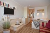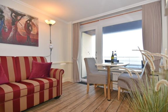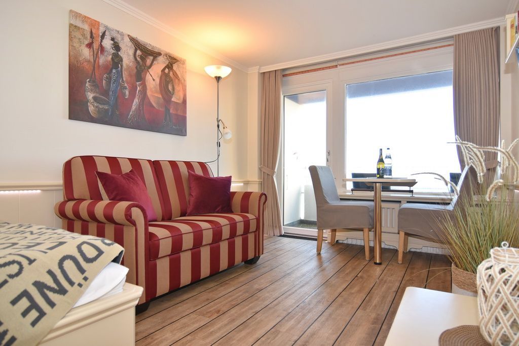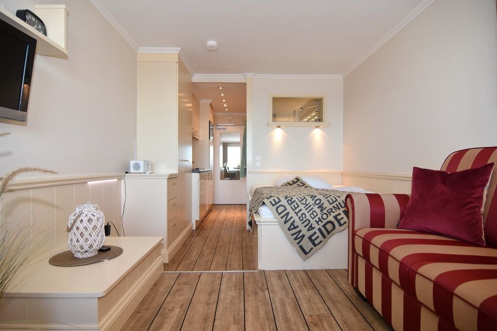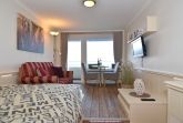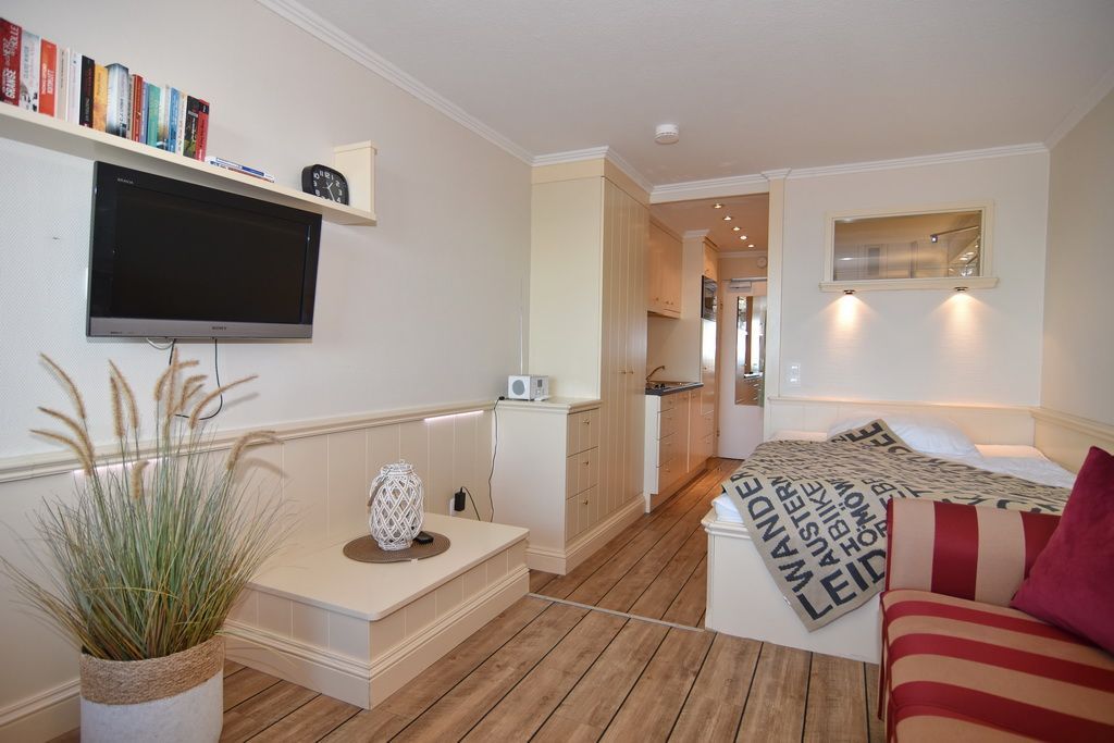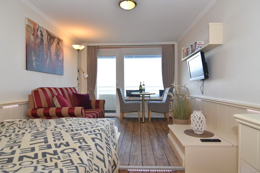 Exklusive 1-Zimmer-Ferienwohnung im Haus am Meer, 4.OG, ca. 25 qm; Nichtraucher-Whg.! Uneingeschränkter Meeresblick. Hübscher Wohn-/Schlafraum mit Doppelbett (140*200) und Westbalkon zur Seeseite, erhöhter Essplatz (Achtung Stufe!) mit herrlichem Meeresblick, 2-Sitzer-Couch, Flat-TV, Radio, Duschbad / WC, hübsche Küchenzeile mit Geschirrspüler und Mikrowelle. W-LAN ( ohne Gewähr ). Bettwäsche und Handtücher sind zur Anreise aufgezogen. Ein PKW-Stellplatz kann kostenpflichtig zugebucht werden. Tierhaltung ist nicht gestattet. Beginnend vom 15.10.2025 bis 5.4.2026 (Ostern) findet die Fassandensanierung der Landseite (Osten) sowie des Südgiebels statt. Mit Baulärm ist in dieser Zeit zu rechnen.