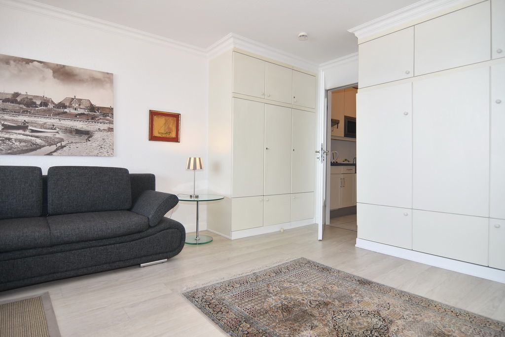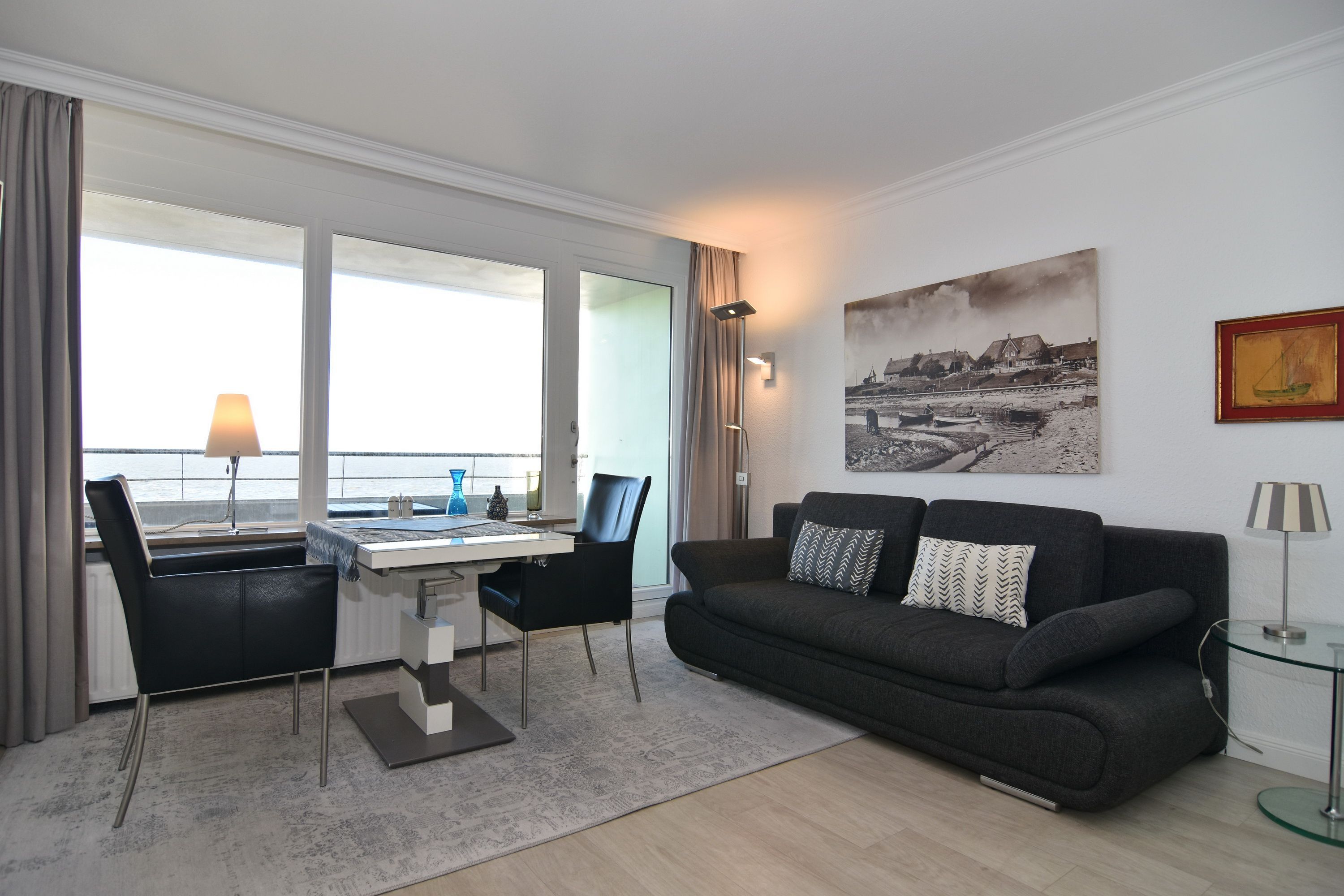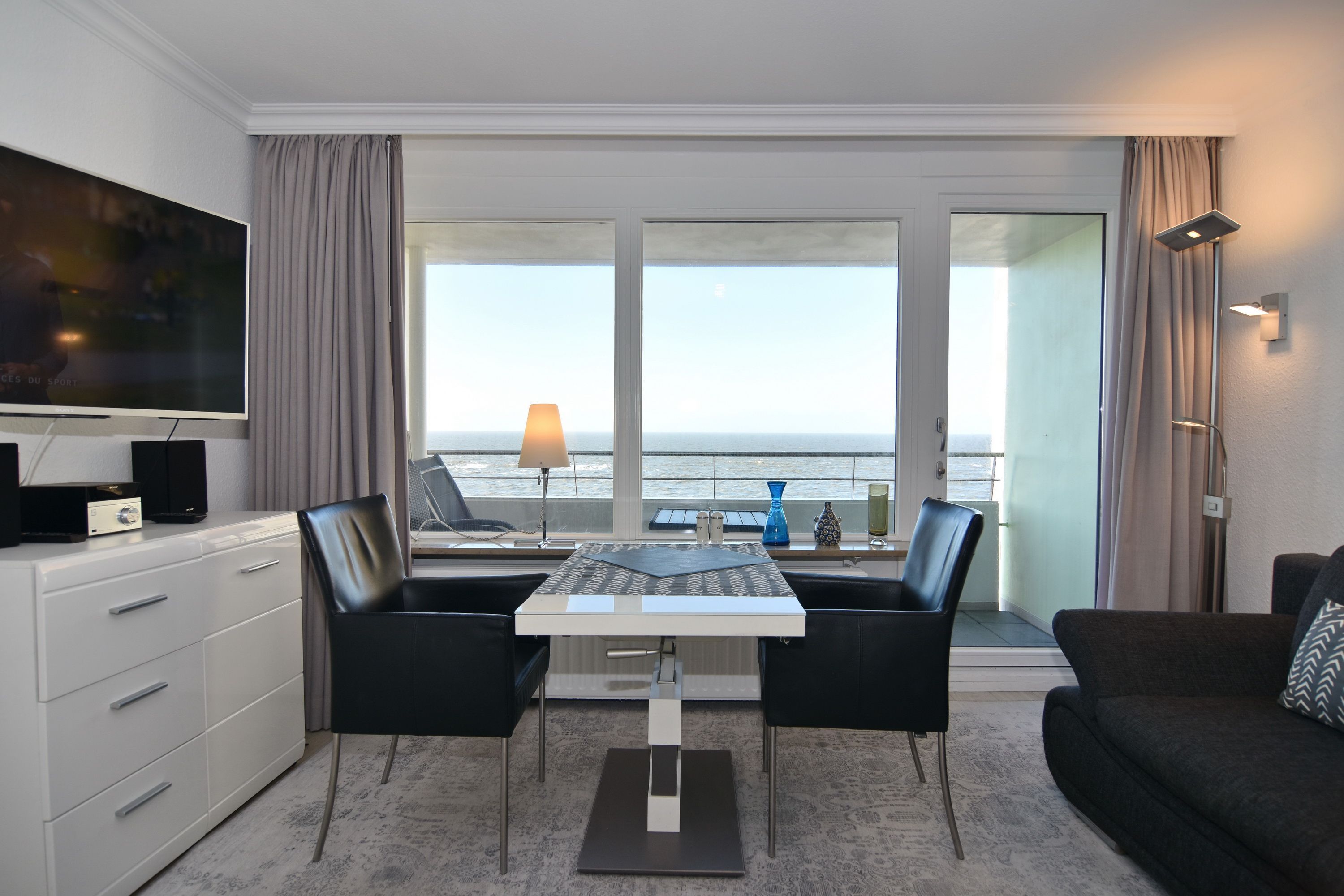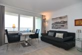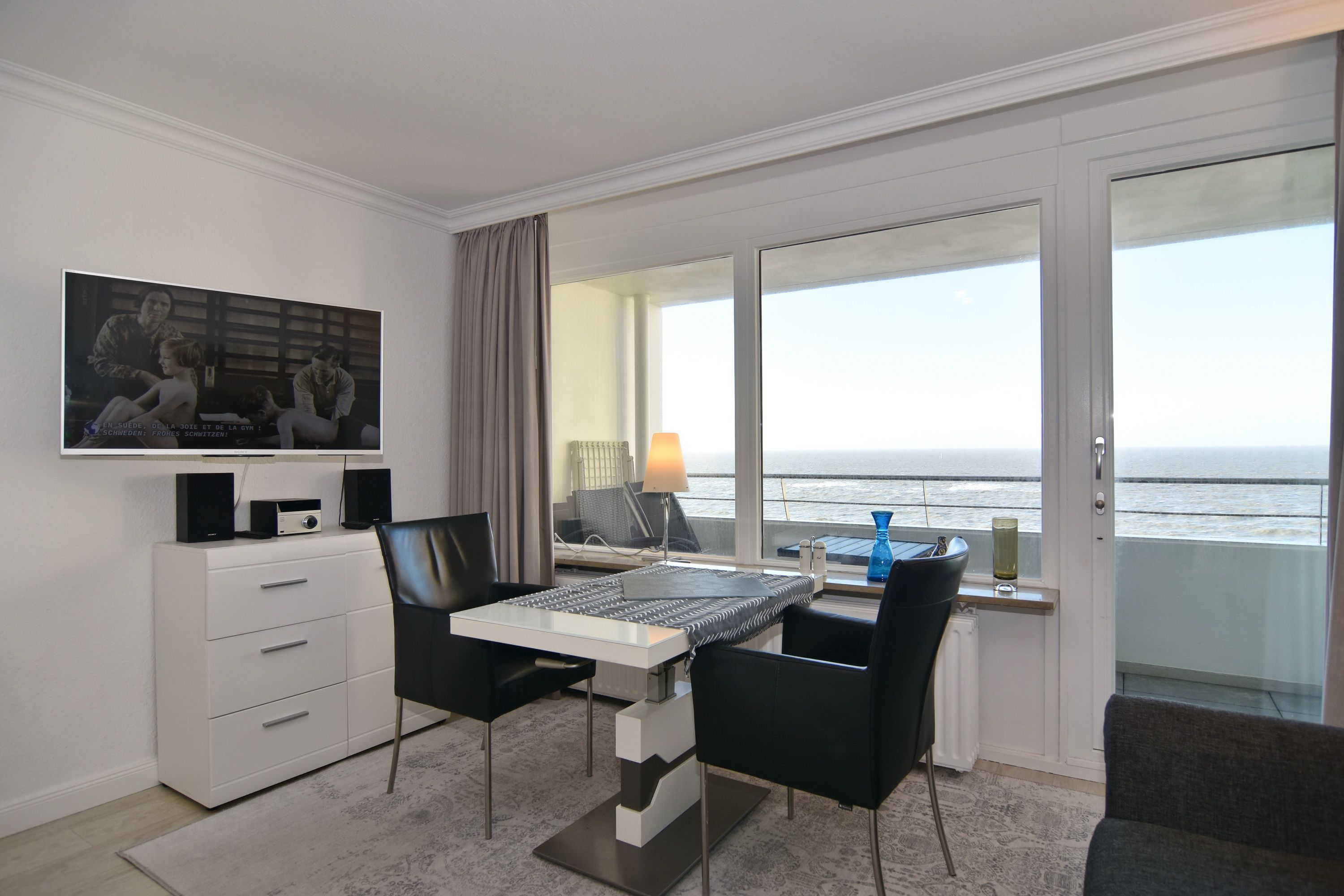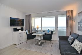 1-Zimmer-Ferienwohnung. ca. 34 m², 6.OG, Haus am Meer. Nichtraucher-Whg.! Wohn-/ Schlafraum mit Doppelschrankbett (2 Matratzen), Eßtisch am Fenster mit Blick auf das Meer, Zweisitzercouch, Flat-TV, Radio, Telefon, W-LAN (ohne Gewähr), Westbalkon mit Meeresblick und Balkonmöbeln, Küchenzeile im Flur m.Geschirrspüler u. Mikrowelle, Duschbad/WC. Tierhaltung ist nicht gestattet. Das App. ist mit Design-Fußboden ausgelegt. Bettwäsche und Handtücher sind zur Anreise aufgezogen. Ein PKW-Stellplatz kann kostenpflichtig zugebucht werden.Beginnend vom 15.10.2025 bis 5.4.2026 (Ostern) findet die Fassandensanierung der Landseite (Osten) sowie des Südgiebels statt. Mit Baulärm ist in dieser Zeit zu rechnen.