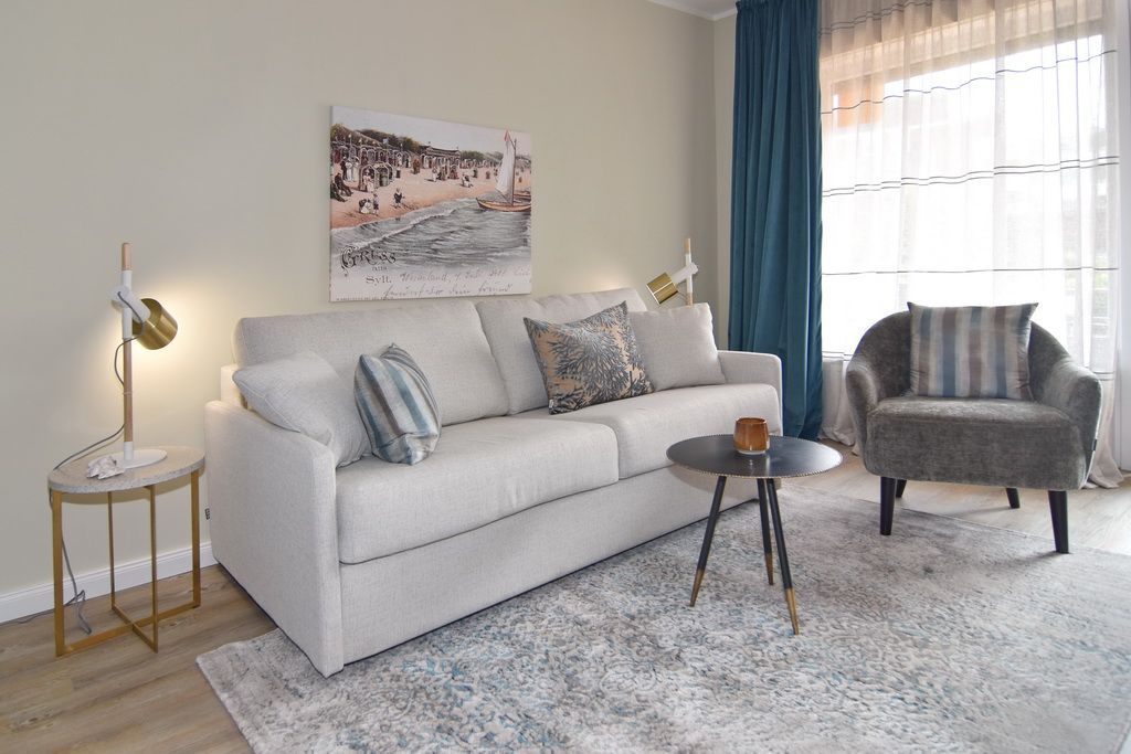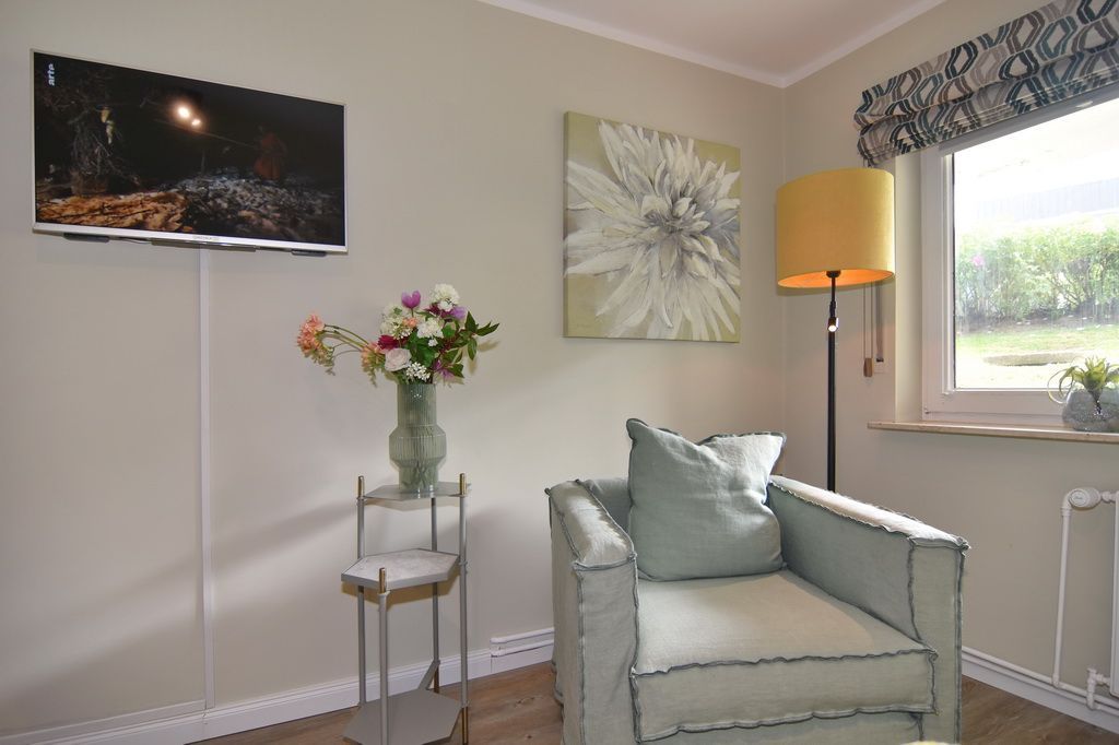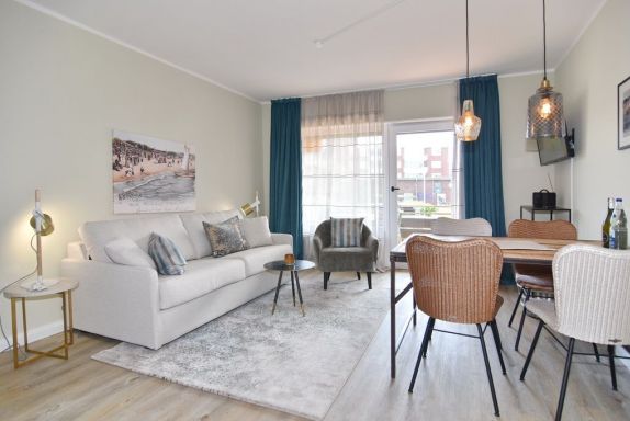 Moderne 2-Zimmer-Ferienwohnung mit Südbalkon für max. 2 Personen in Strandnähe. Ca. 57 m² im Haus Störtebeker. EG: Sonniges Wohnzimmer mit Schlafcouch, kleinem Sessel und Esstisch für 4 Personen, Flat-TV, Radio, Südbalkon mit Balkonmöbeln, separate, kleine Küche mit Mikrowelle und Geschirrspüler, UG: großes Schlafzimmer mit Boxspringbett (Liegeflächen je 90 x 200), Flat-TV, Duschbad/WC. PKW-Freistellplatz Nr. 2. Bettwäsche und Handtücher auf Bestellung. Tierhaltung verboten/Nichtraucherwohnung.