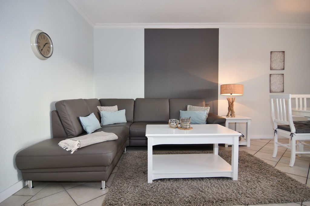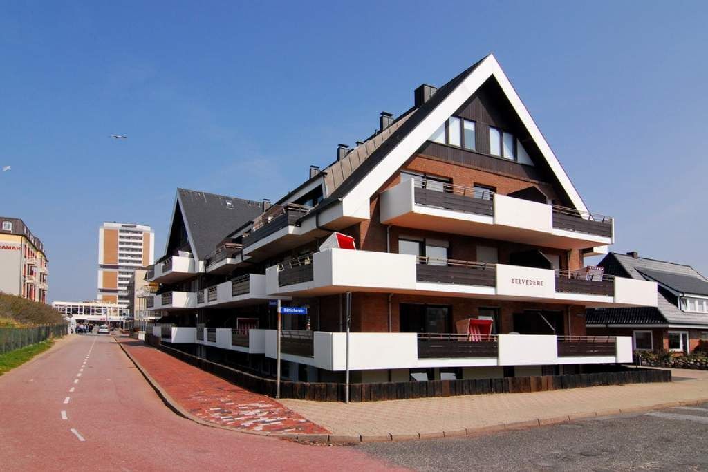 3 Zimmer Ferienwohnung, direkt hinter den Dünen im Haus Belvedere. Ca. 68m² auf 2 Ebenen, Nichtraucher Wohnung mit großem Südbalkon. EG: Wohnzimmer mit Leder-Eckcouch, Smart TV (4K UHD) und Kabelanschluss, Radio, Telefon, WLAN (Code RR), Esstisch, kleiner Flur mit Garderobe und Spiegel, Schlafzimmer mit 2 Einzelbetten (90x200). Treppe vom EG ins UG. UG: offene Küche mit Desingerfußboden und Esstisch, Herd, Geschirrspüler, Microwelle, Kühlschrank mit kl. Gefrierfach, Schlafzimmer mit Doppelbett (2x90x200) und zusätzlichem Einzelbett (90x200) Duschbad/WC mit Föhn. Tierhaltung ist nicht gestattet. Zur Wohnung gehört der Duplex-Garagenstellplatz Nr. 11. Bettwäsche und Handtücher sind zur Anreise aufgezogen! Waschmaschine/Wäschetrockner im Keller vorhanden mit Münzautomaten.
