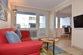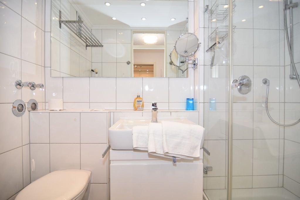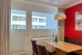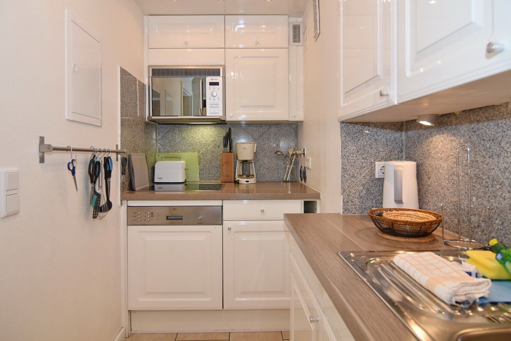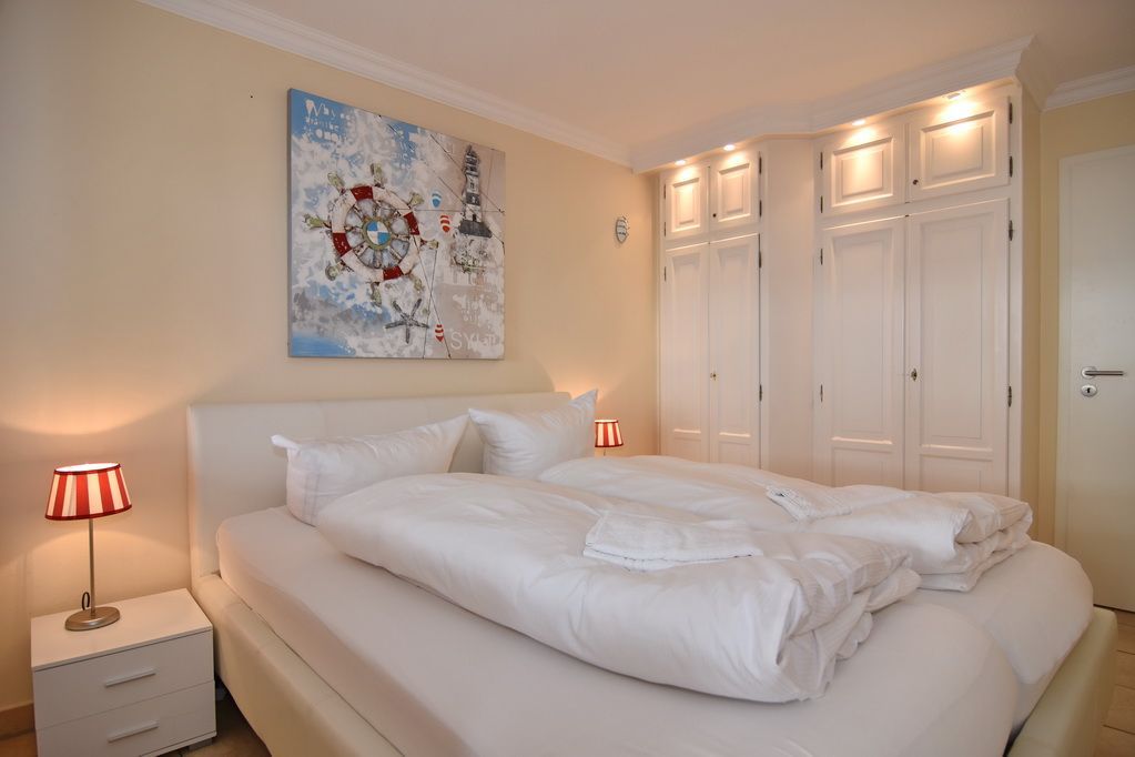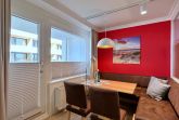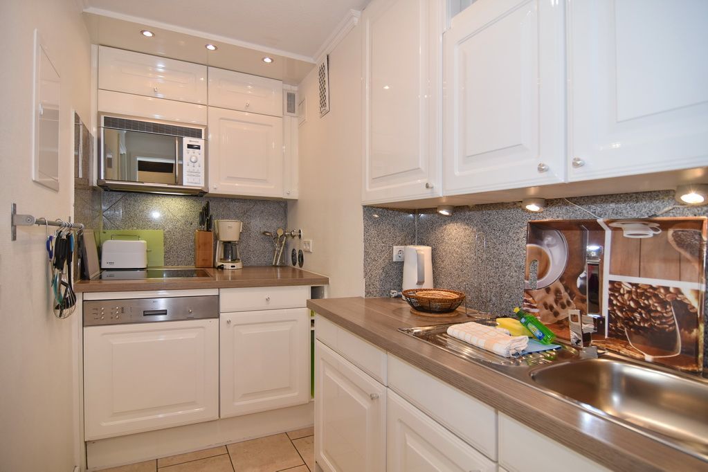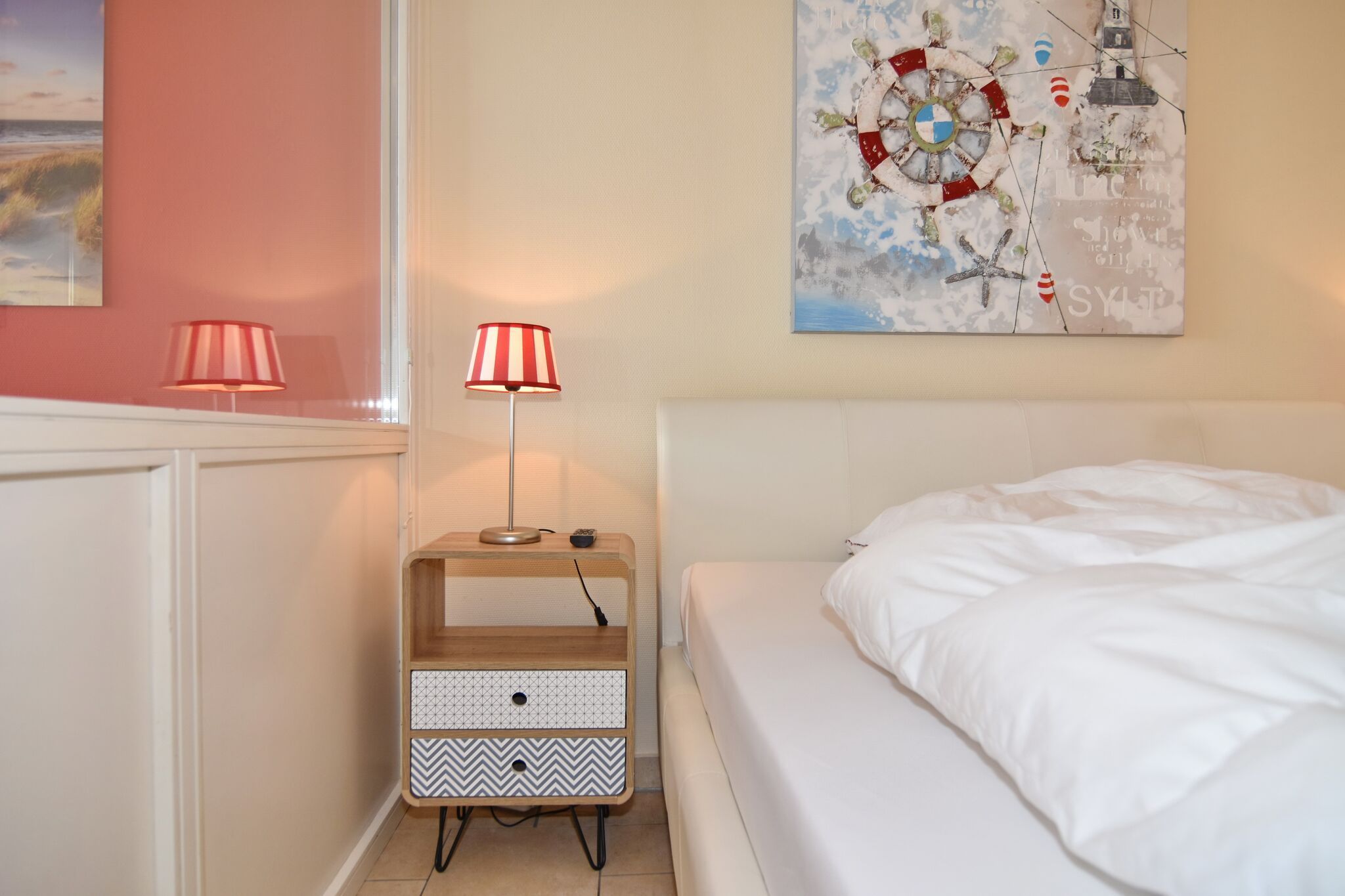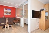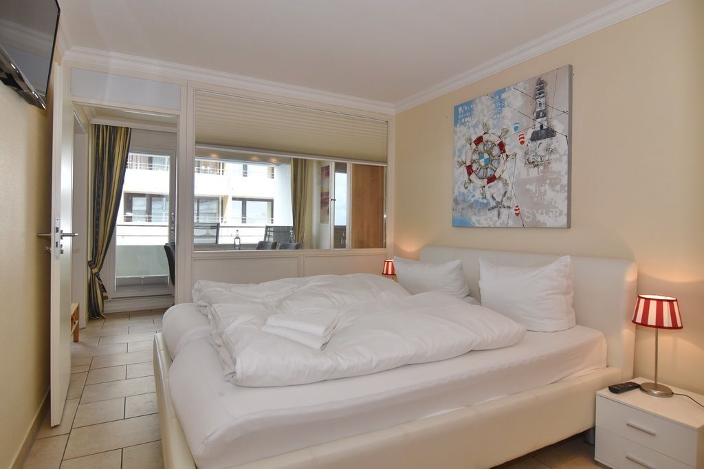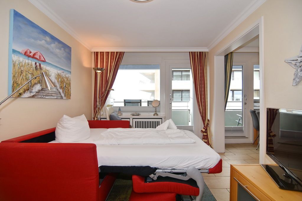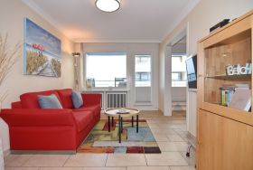 2-Zimmer-Wohnung im Haus am Meer mit Westbalkon und Meeresblick, ca. 50qm, 4. OG zur Seeseite - Nichtraucher-Whg.! Wohnzimmer mit Schlafcouch, Kleiderschrank, Flat-TV und Westbalkon. Von hier aus gelangt man zum Essplatz für 4 Personen - dieser ist dem separaten Schlafzimmer mit Doppelbett, Einbauschrank und Flat-TV vorgelagert. Der Essplatz besteht aus einer großzügigen Eckbank und 2 Stühlen, die wahlweise auch zum Sofa gestellt werden können. Im Flurbereich befindet sich die offene Küche mit Geschirrspüler, Ceranherd mit 4 Kochfeldern und Mikrowelle. Der Kühlschrank verfügt über ein Gefrierfach. Duschbad / WC. PKW-Stellplatz/Garage kann kostenpflichtig gebucht werden. Bettwäsche und Handtücher sind zur Anreise aufgezogen. Tierhaltung ist in der Wohnung nicht gestattet. Beginnend vom 15.10.2025 bis 5.4.2026 (Ostern) findet die Fassandensanierung der Landseite (Osten) sowie des Südgiebels statt. Mit Baulärm ist in dieser Zeit zu rechnen.