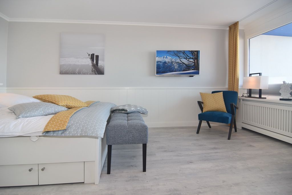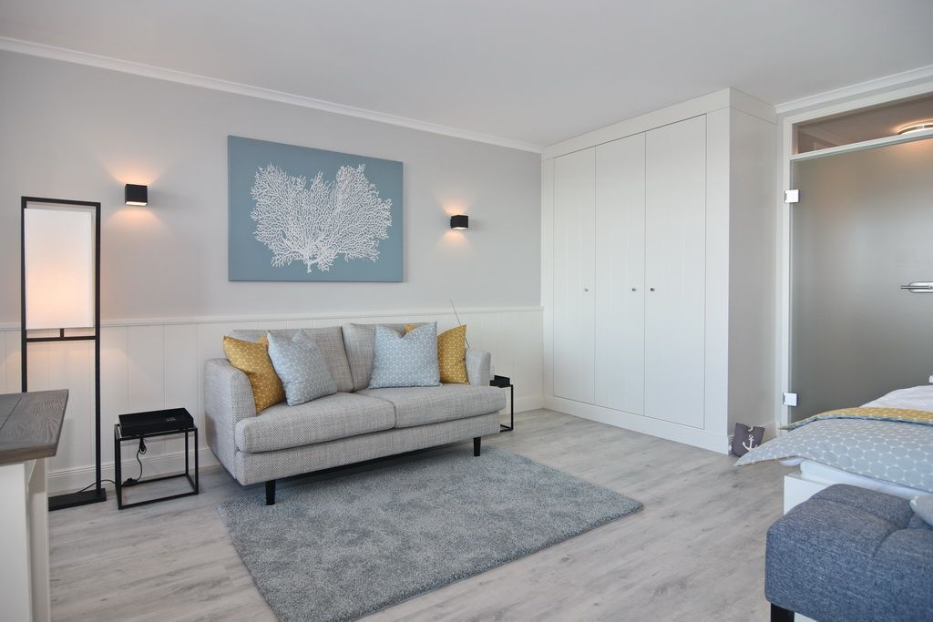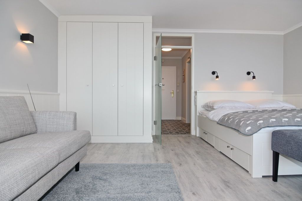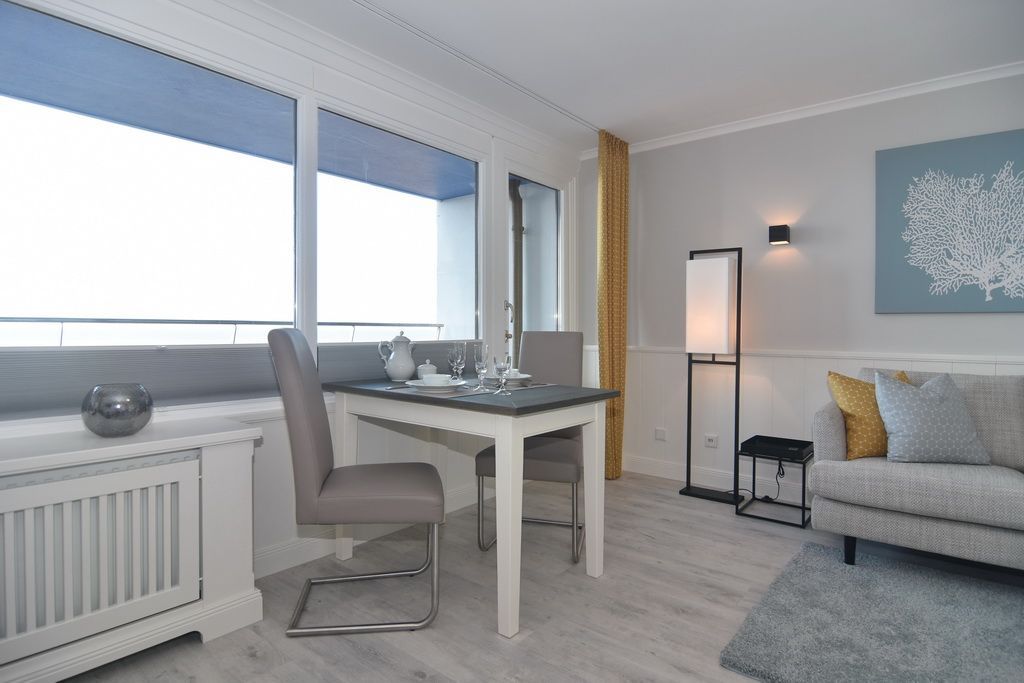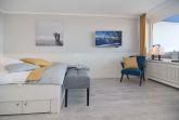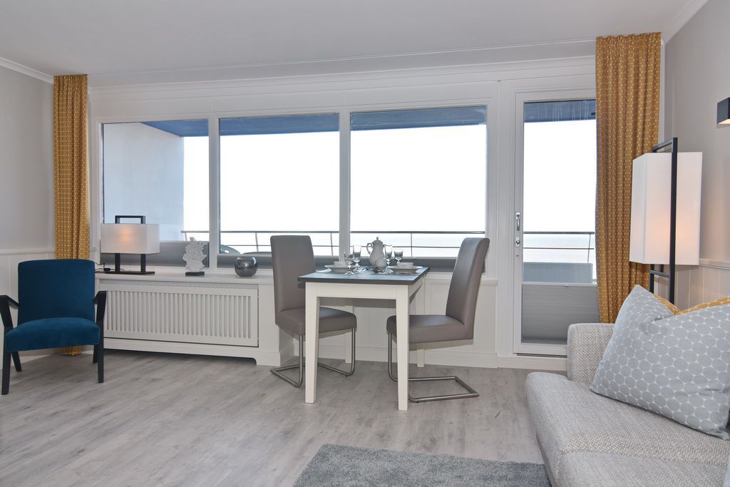 Exklusive 1-Zimmer-Wohnung im 4. OG des Hauses Sylter Welle. Genießen Sie den unverbaubaren Meeresblick von Bett, Sofa und Essplatz und dem möblierten Westbalkon. Auf 42 qm verteilt, verfügt die Wohnung über ein großzügiges Wohn-/ Schlafzimmer mit Doppelbett (2x80x200 cm), Couchecke, Kleiderschrank und Essplatz am Fenster. Vom Flur aus gelangen Sie in die separate Küche mit Geschirrspüler und in das neue Duschbad/WC. Rauchen sowie Tierhaltung sind nicht gestattet.Bettwäsche und Handtücher sind zur Anreise aufgezogen. Ein PKW-Stellplatz kann kostenpflichtig zugebucht werden.