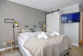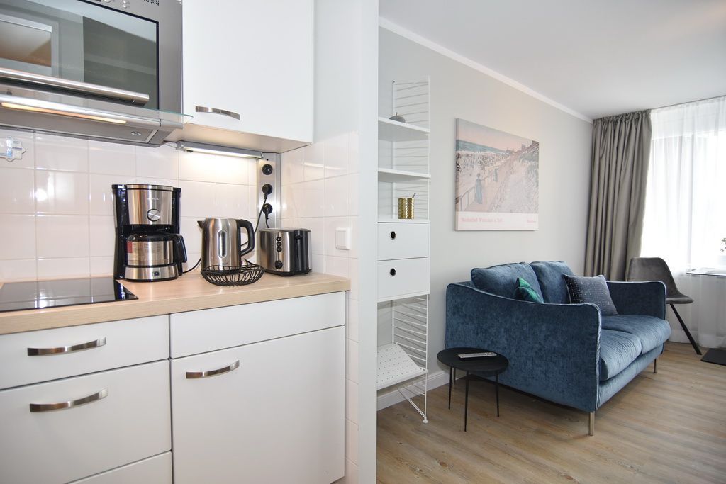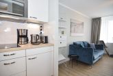 Modernes 1-Zimmer-Appartement im Haus Metropol, 3. OG mit Ostbalkon und Balkonmöbeln, ca. 30 m², Nichtraucher-Appartement. Wohn-/Schlafraum mit Doppelbett (Boxspringbett, 160x200) und Essplatz am Fenster, Sofa, Flat-TV, Radio und W-LAN ( ohne Gewähr ), Küchenzeile im Flurbereich mit Mikrowelle, Geschirrspüler und 2 Platten-Ceranfeld, Duschbad/WC. Tierhaltung ist nicht gestattet. Bettwäsche und Handtücher sind zur Anreise aufgezogen. Ein PKW-Stellplatz kann kostenpflichtig zugebucht werden.