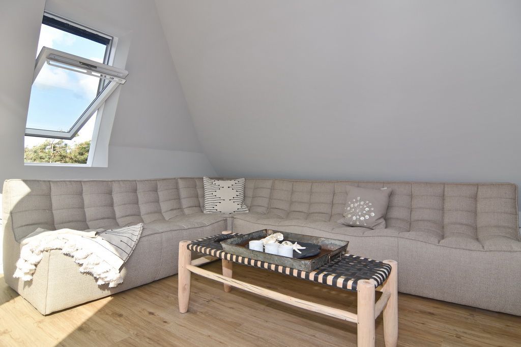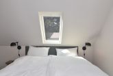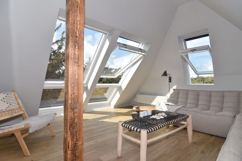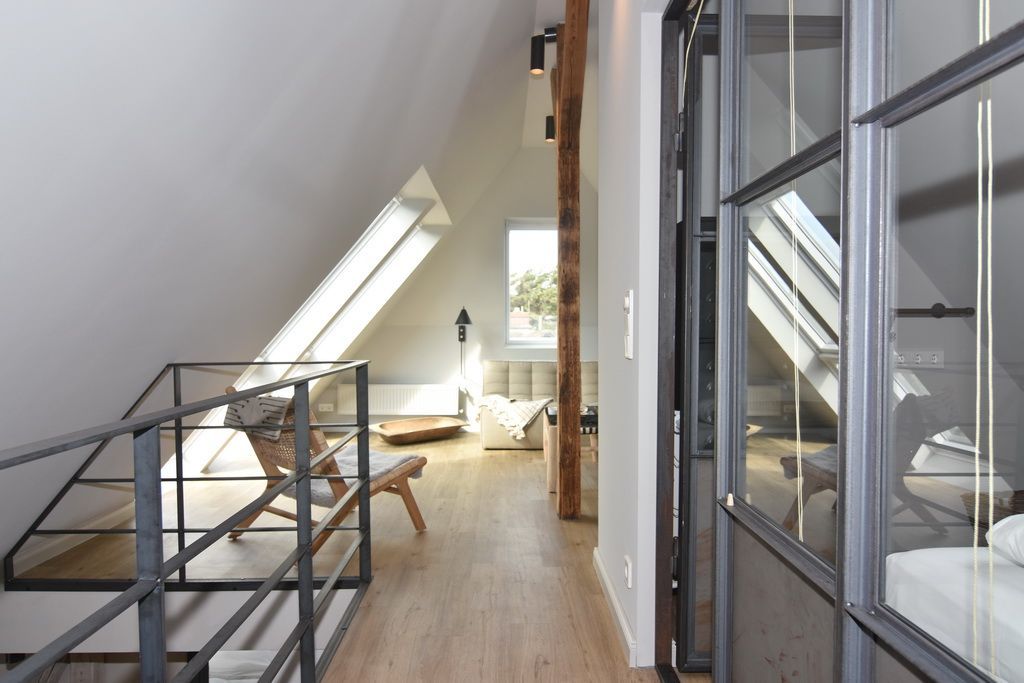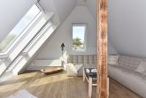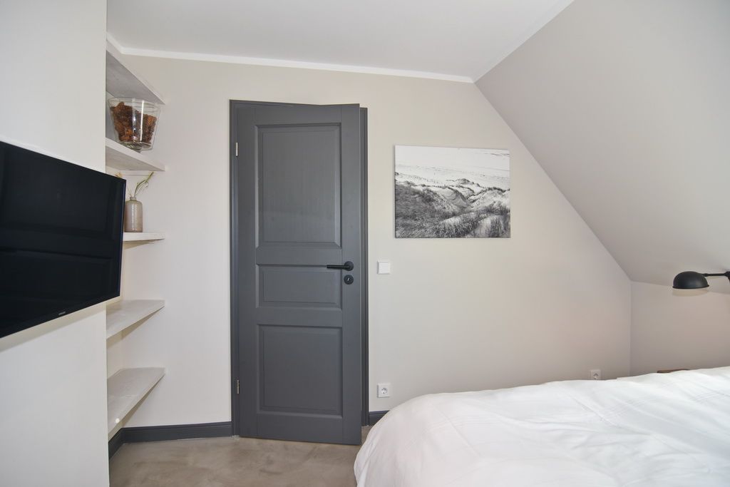 Direkt hinter den Dünen gelegen und dem Strand ganz nah.' Hier wohnen Sie in einer frisch renovierten 5-Zimmer-Maisonette-Wohnung mit ca. 74qm. Frei gelegte Deckenbalken, Naturtöne und liebevoll ausgewählte Möbel und Dekoration schaffen für Sie einen Ort der Ruhe und Entspannung. Im Obergeschoß befindet sich eine helle Wohnküche mit einem Essplatz für bis zu 6 Personen. Die Küche verfügt über Geschirrspüler, Backofen, großen Kühlschrank und separatem Gefrierschrank sowie eine Waschmaschine. Auf selber Ebene befinden sich ein Schlafzimmer mit Doppelbett (180x200), TV und großem, eigenen Bad mit Dusche, Wanne und Kleiderschrank; ein weiteres Schlafzimmer mit Doppelbett (160x200), Kleiderschrank und TV und ein separates Duschbad /WC. Aus der Wohnküche geht eine Metalltreppe ins Dachgeschoß (Achtung: offenes Geländer - nicht für Kleinkinder geeignet). Hier befindet sich ein weiterer Schlafraum (Jugendzimmer mit Doppelbett (160x200) und kleinem Spint - wunderschön hell, da hier eine Eisentrennwand mit Glas verbaut wurde - und der Wohnbereich mit gemütlicher Sitzecke, TV und großen, bodentiefen Veluxfenstern. Internet (ohne Gewähr) ist vorhanden. Bettwäsche und Handtücher sind zur Anreise aufgezogen. Parken in der Straße möglich. Kleiner, gemeinschaftlicher Außenbereich vor dem Haus. Fahrradständer am Haus. Tierhaltung und Rauchen sind im Objekt verboten.