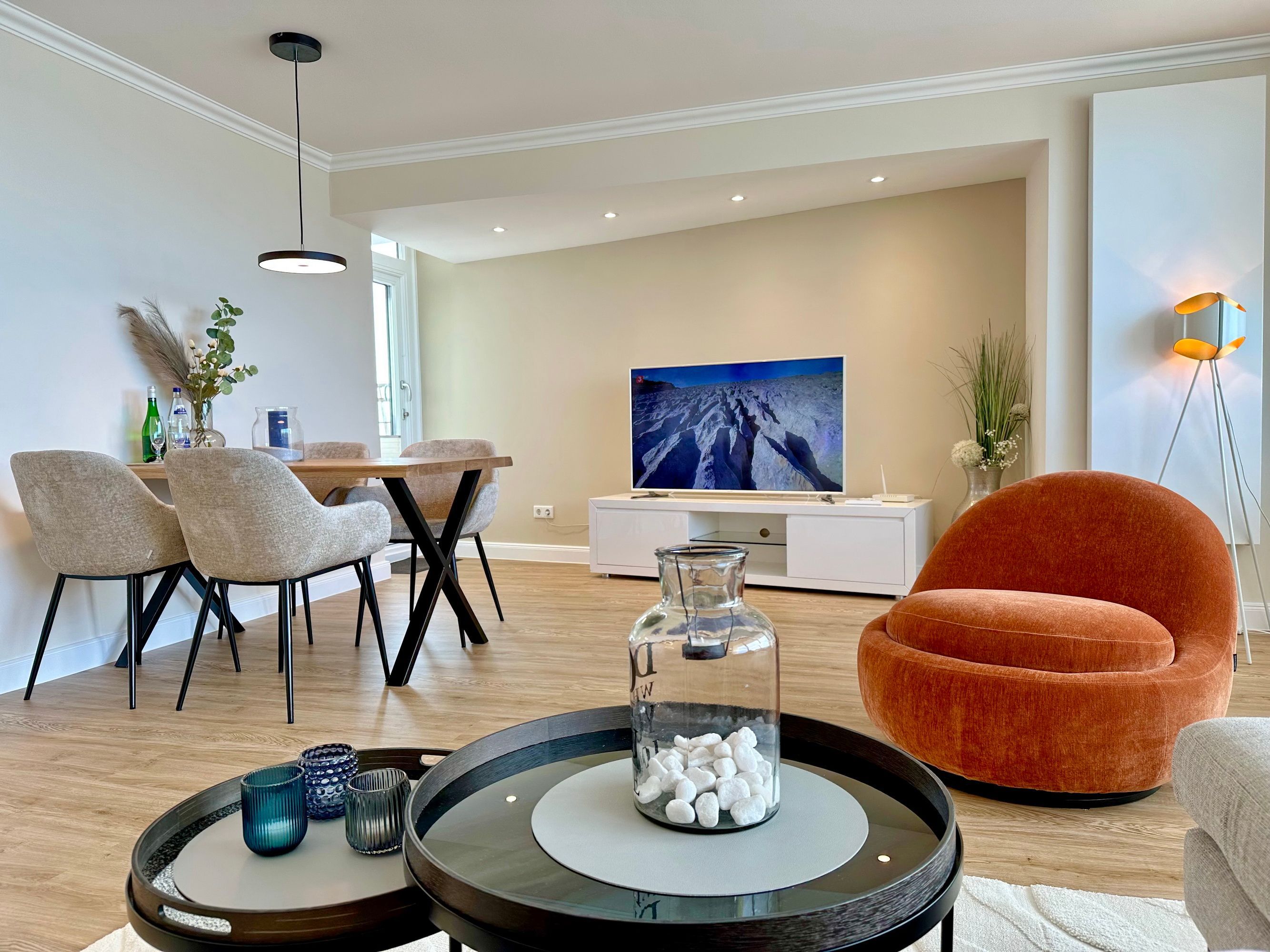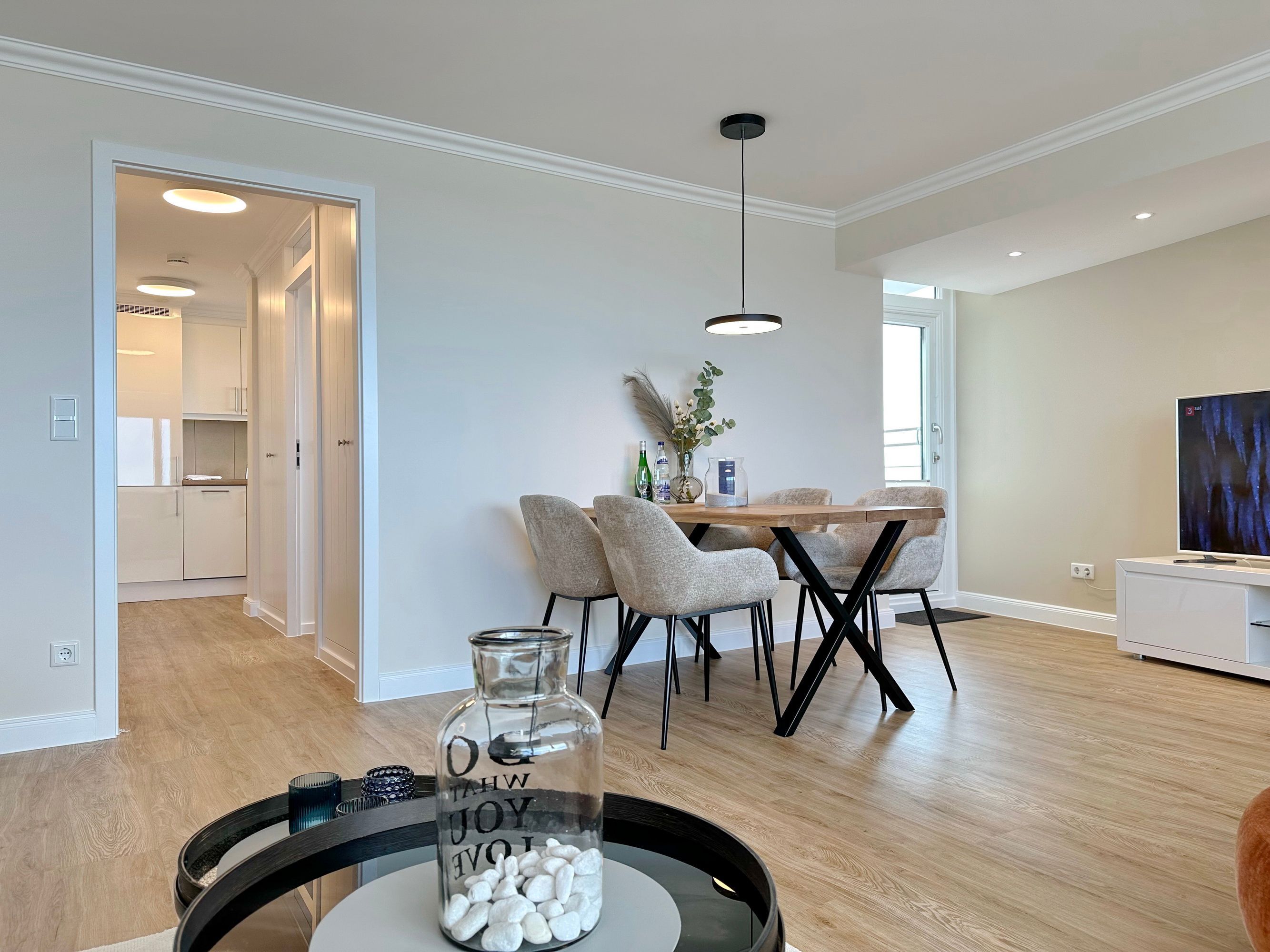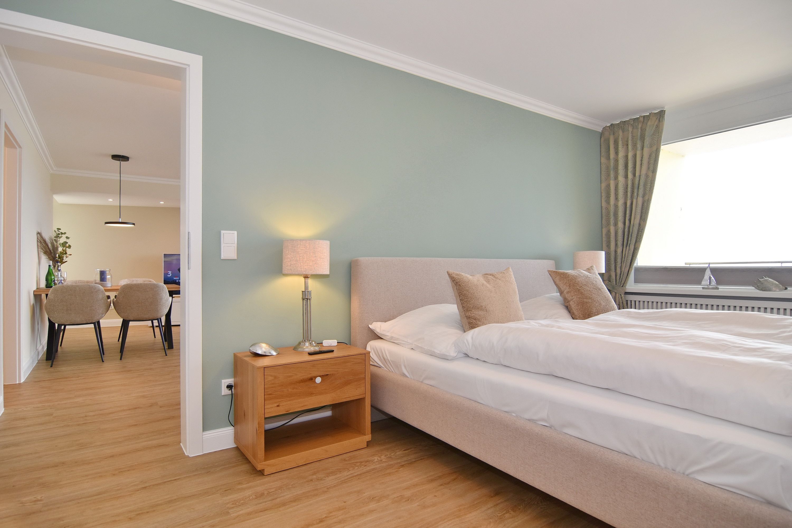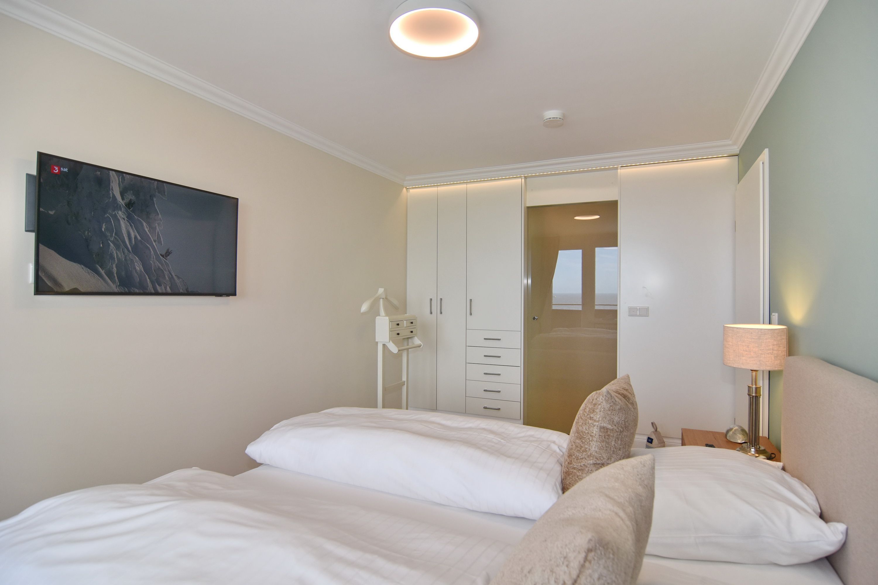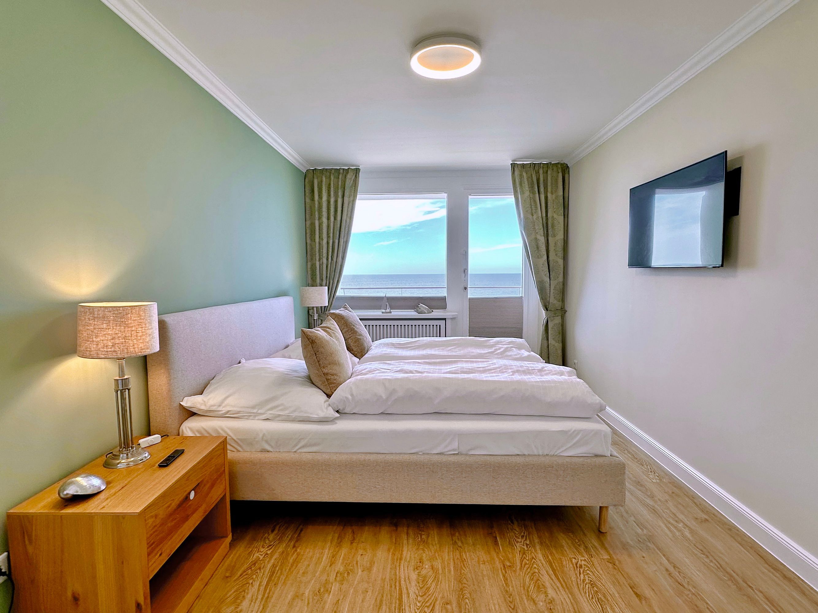 Exklusives 3-Zimmer-Apartment im 13.OG des Haus Metropol mit einem Süd- und 2 Westbalkonen. Genießen Sie einen Traumblick auf das Meer und die Dünenkette, ca. 88 m² Nichtraucher. Wohn- und Schlafräume sind mit Böden in Holzoptik ausgelegt. Wohnzimmer mit großer Sitzecke sowie TV und Stereoanlage. W-Lan (ohne Gewähr) 1 Schlafzimmer mit Doppelbett, Kleiderschrank, Flat-TV, Westbalkon und Bad ensuite. 1 kleines Schlafzimmer mit 2 Einzelbetten und TV, separates Duschbad/ WC. Separate Küche mit Backofen und Geschirrspüler. Tierhaltung und Rauchen ist nicht gestattet. Der dazugehörige Garagen-Stellplatz (Nr. 108) kann bei Buchungsabschluss zu € 15,--/Nacht gebucht werden. Waschküche und Fahrradkeller befinden sich im Haus. Bettwäsche und Handtücher sind zur Anreise aufgezogen.