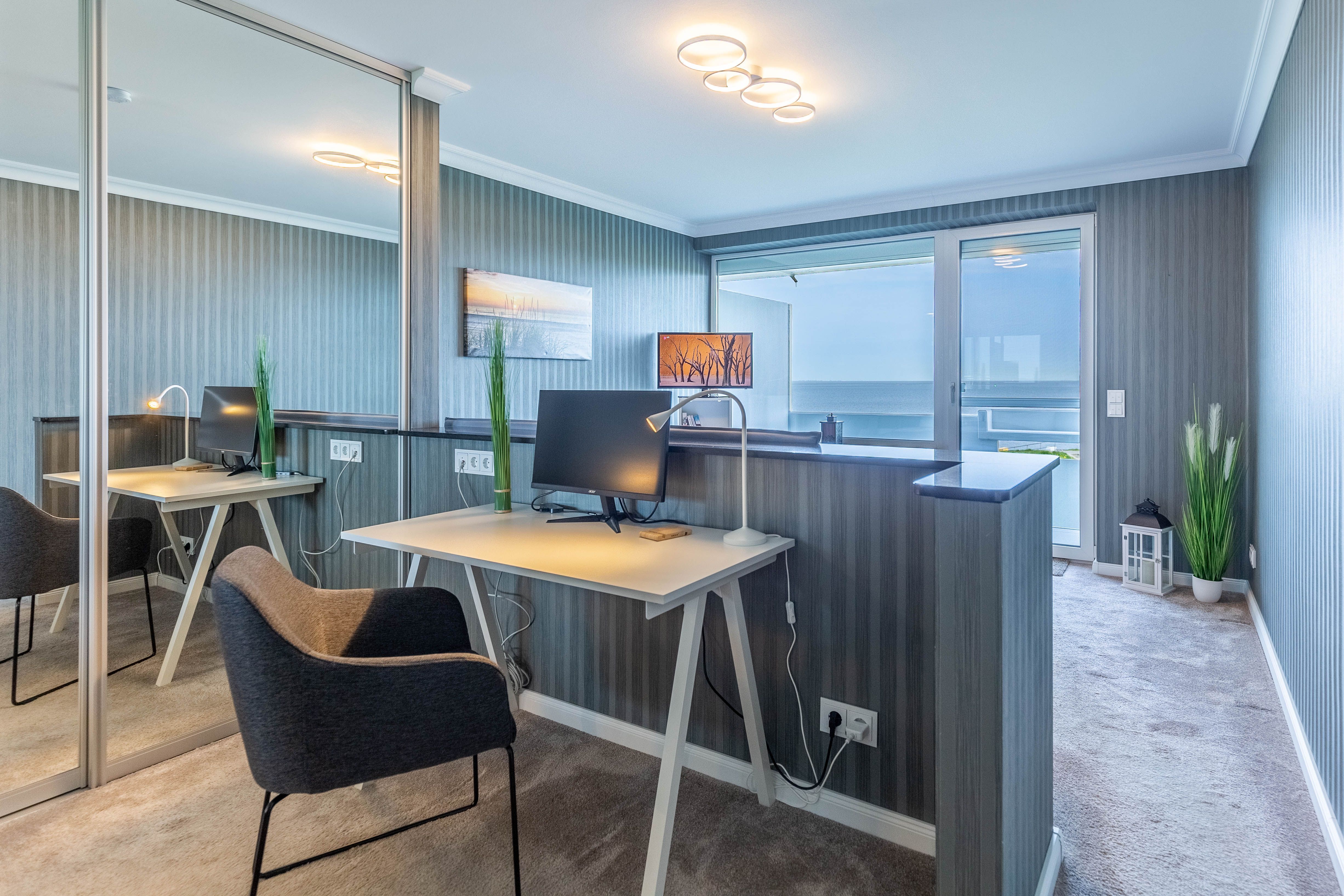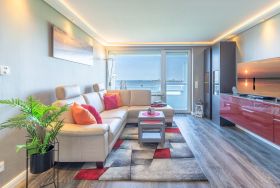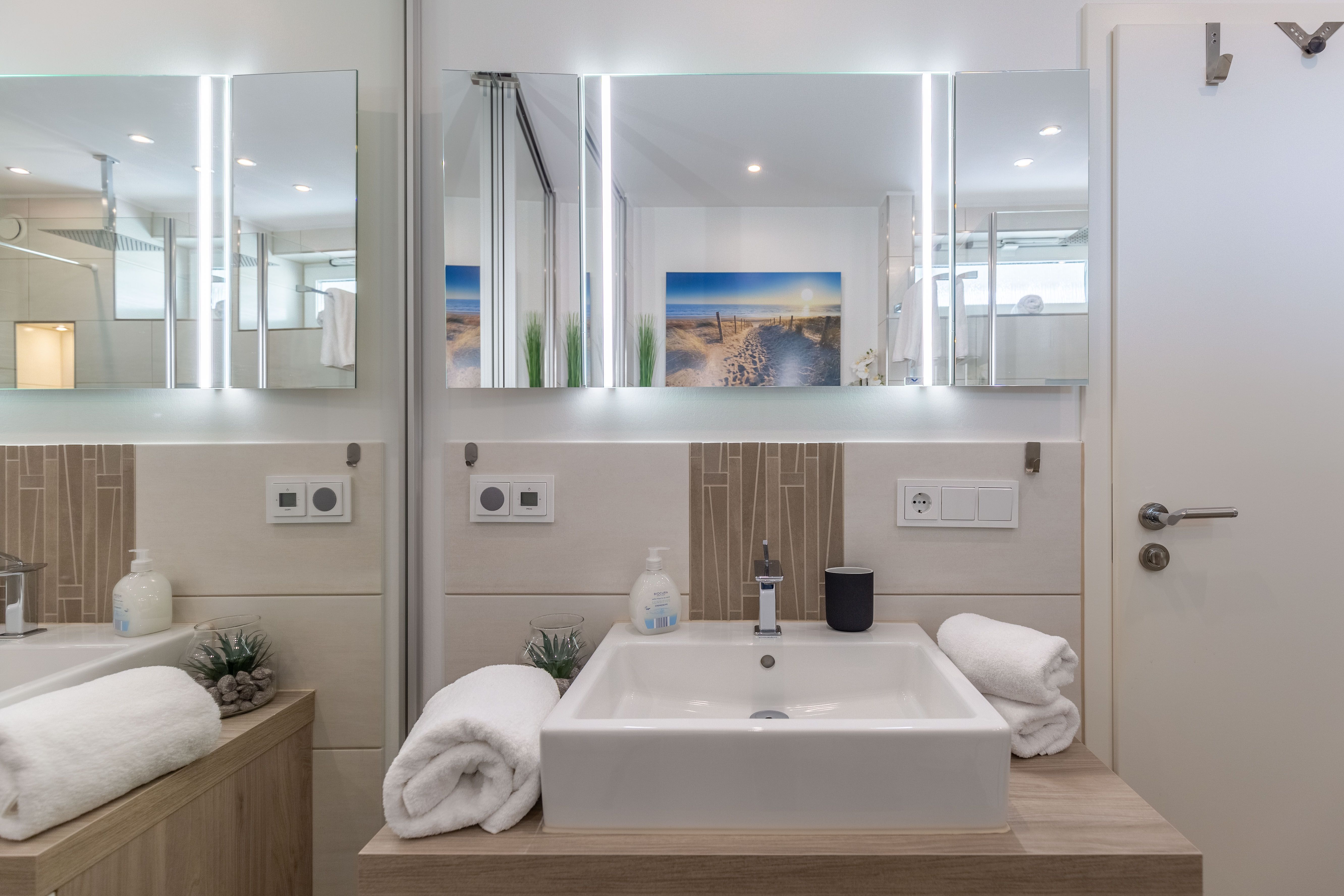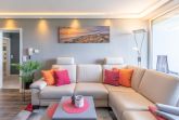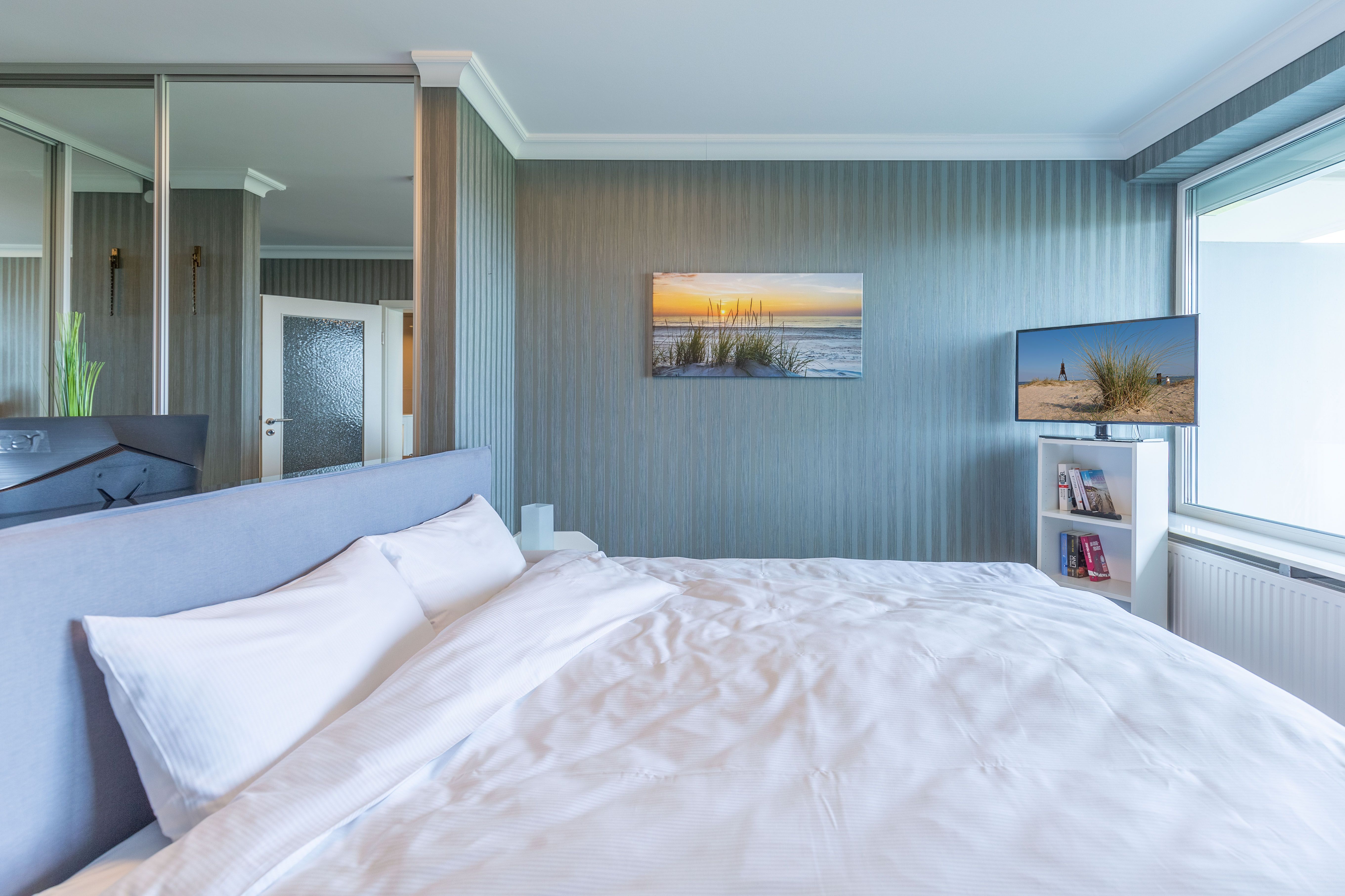 Nach einem erlebnisreichen Tag können Sie im kombinierten Wohn-/Esszimmer mit offener Küche entspannen. Beim Relaxen auf dem komfortablen Ecksofa genießen Sie einen traumhaften Blick auf den Weltschifffahrtsweg, die Grimmershörnbucht und den Hafen. Dank Flachbildfernseher im Wohn- und Schlafzimmer brauchen Sie auch im Urlaub nicht auf Ihre Lieblingsserie verzichten. Die hochwertige Küche mit Elektrogeräten von Miele und Bora lässt das Herz von Hobbyköchen höher schlagen. Das Bora-Kochfeld, der Miele-Kombidämpfer und der in Komforthöhe eingebaute Geschirrspüler lassen keine Wünsche offen. Das hochwertige Doppelbett im Schlafzimmer sorgt für einen erholsamen Schlaf. Elektrische Außenjalousien sorgen dafür, dass Sie nicht von der Morgensonne geweckt werden. Das große und moderne Bad verfügt neben einer komfortablen Regendusche, einem raumhohen Spiegel auch über ein WC und ein Urinal.