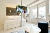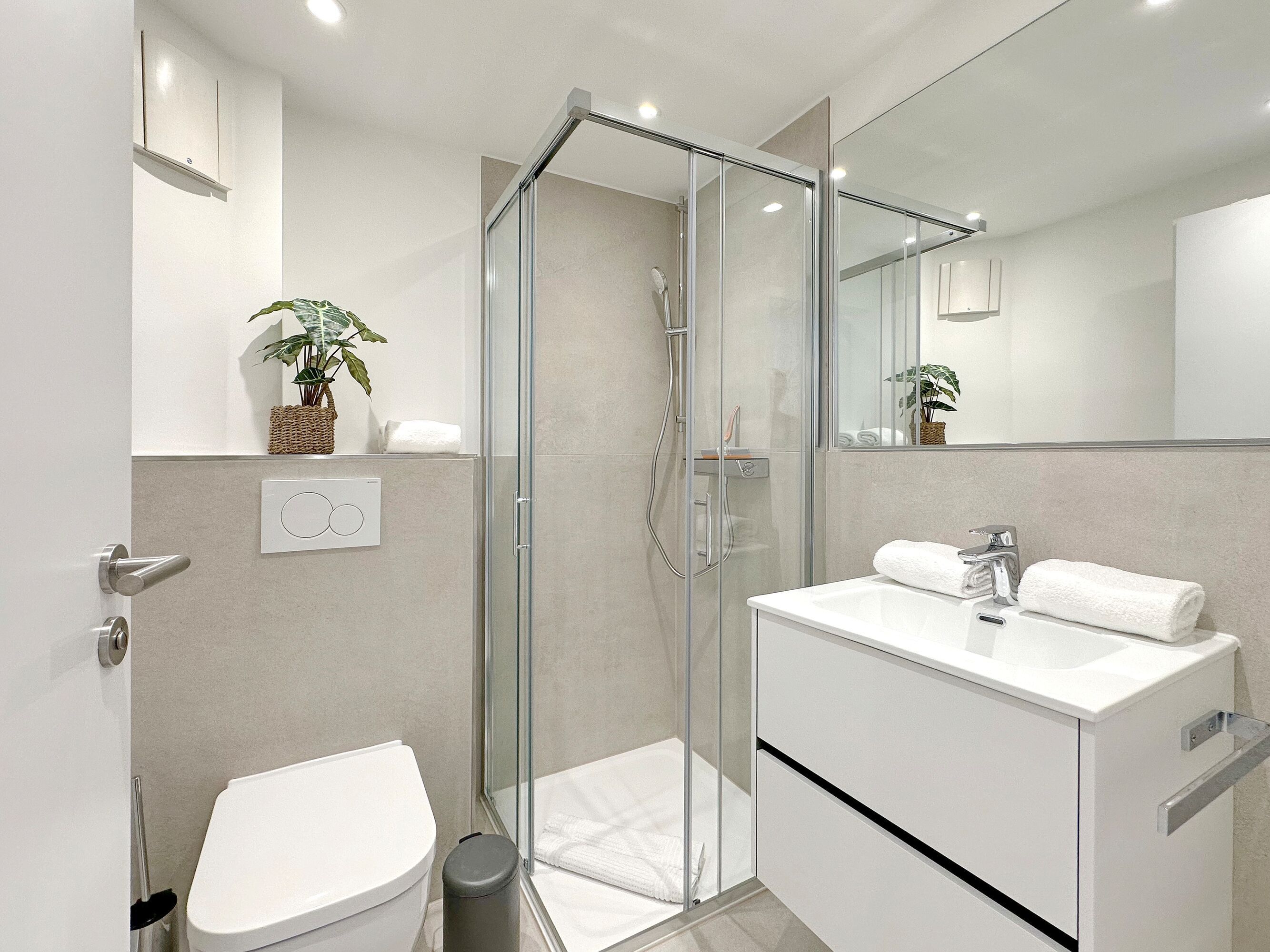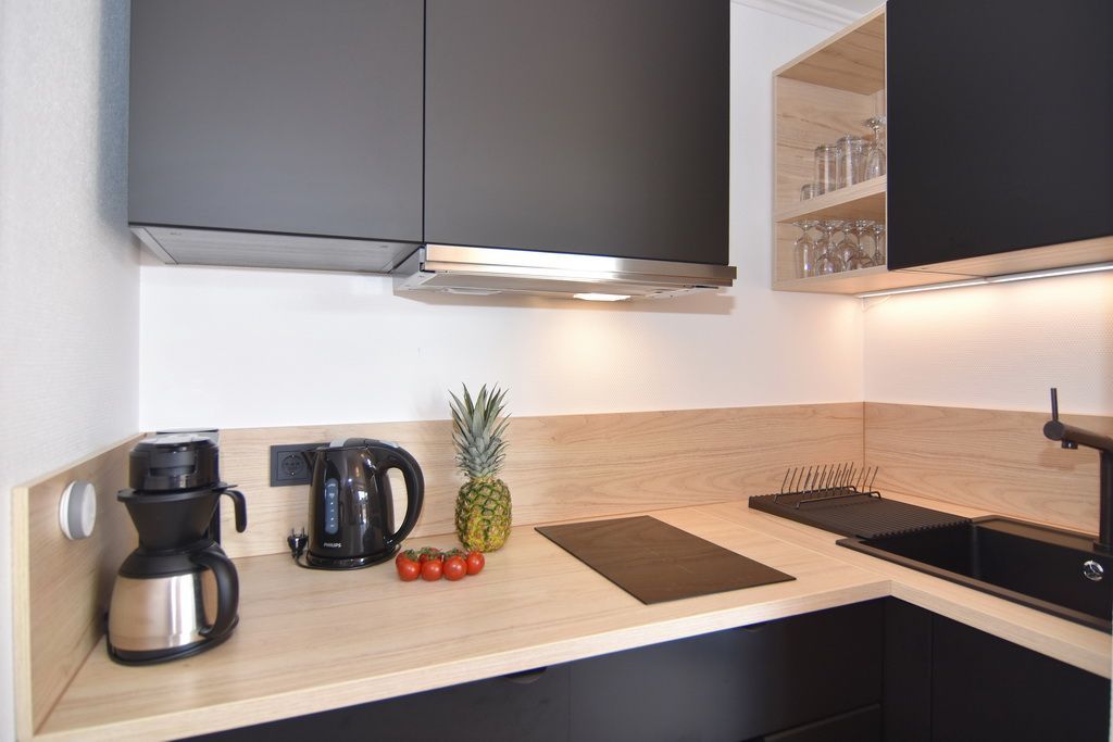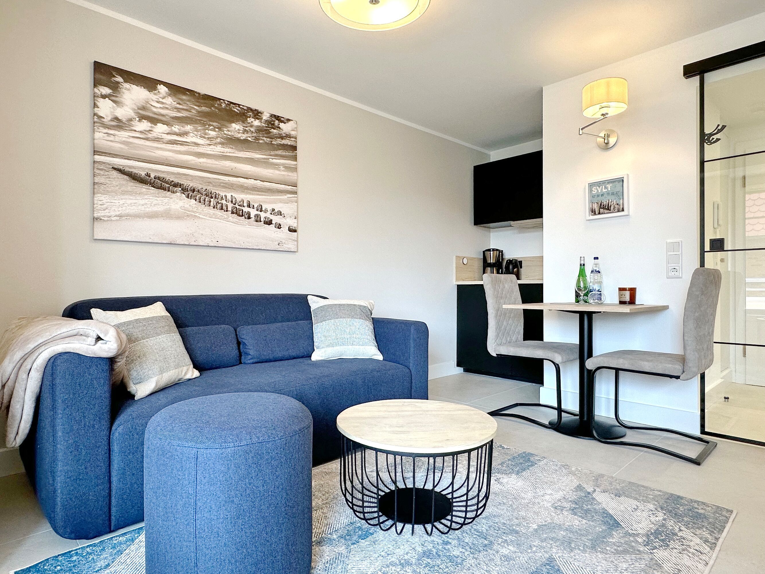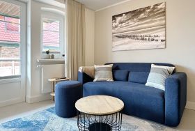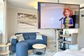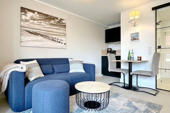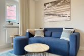 Geschmackvoll eingerichtete 1-Zimmer-Ferienwohnung im Haus Olympia 2. Nichtraucherwohnung. (1.OG). Ca. 30m². Wohn-/Schlafzimmer mit Friesenstilküche, Essplatz, 2-Sitzer-Couch, Doppelbett (160x200), Kleiderschrank, Flat-TV, Radio, W-LAN ohne Gewähr. Duschbad/WC. Südbalkon mit Balkonmöbeln. Tierhaltung nicht gestattet. Im Nebenhaus befinden sich das Schwimmbad, Dampfsauna und Finnische Sauna. Eine Waschküche mit Gemeinschaftswaschmaschine/Trockner ist vorhanden. Garagenstellplatz kann hinzugebucht werden. Bettwäsche und Handtücher sind zur Anreise aufgezogen.