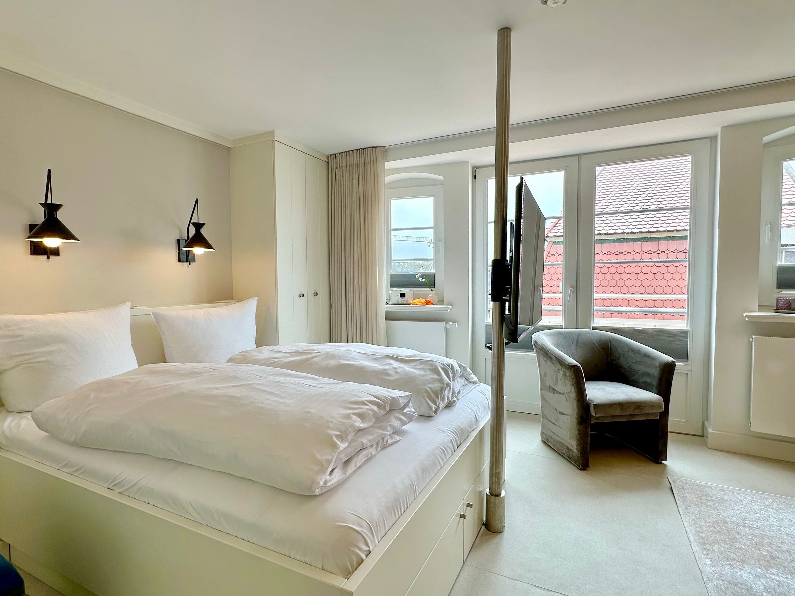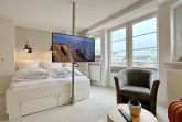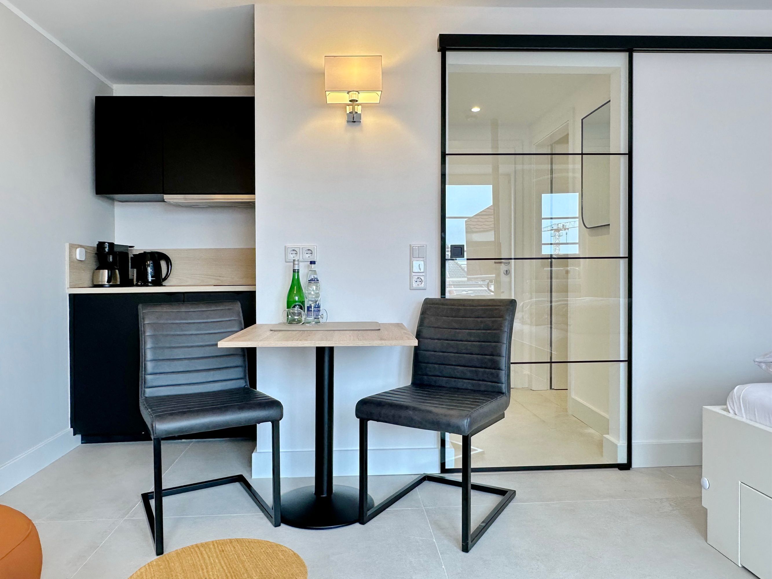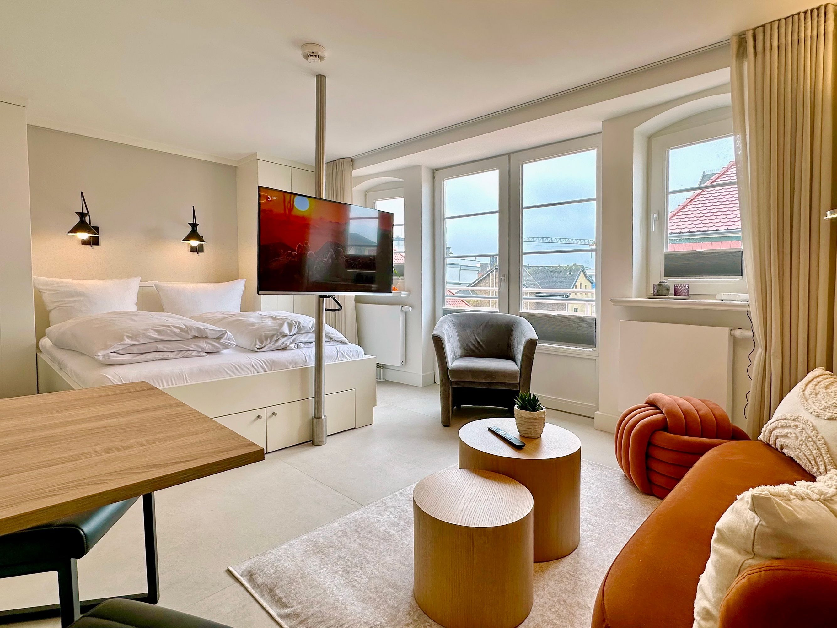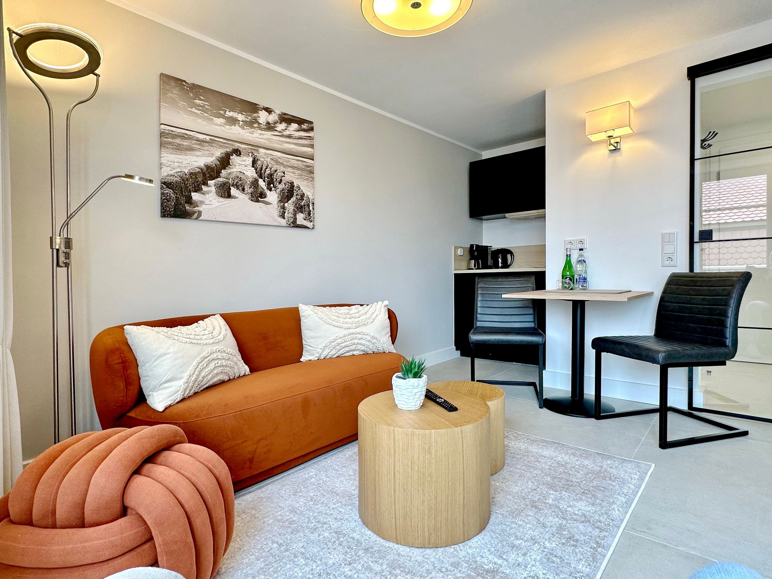 Hübsche 1-Zimmer-Ferienwohnung im Haus Olympia 2 (2.OG) mit Südbalkon. Nichtraucherwohnung. Ca. 30m². Wohn-/Schlafzimmer mit moderner Küchenzeile, Essplatz, 2-Sitzer-Couch, Doppelbett (2x80x200), Kleiderschrank, Flat-TV, Radio. Duschbad/WC. Balkon mit Balkonmöbeln. Tierhaltung nicht gestattet. Unter Haus 4 befindet sich das Schwimmbad mit Finnischer Sauna. Unter Haus 2 befindet sich ein separater Wellnessbereich mit Dampfsauna, Finnischer Sauna und Ruhebereich. Eine Waschküche mit Gemeinschaftswaschmaschine/Trockner ist vorhanden. Offenes W-LAN-Netzwerk steht zur Verfügung (ohne Gewähr). Bettwäsche und Handtücher sind zur Anreise aufgezogen. Ein Garagenstellplatz kann kostenpflichtig gebucht werden!