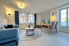 Geschmackvoll eingerichtete 2-Zimmer-Ferienwohnung im Haus Olympia 2 mit Westbalkon. Nichtraucherwohnung. Ca. 43 m² im 2. Obergeschoß. Wohnzimmer mit offener Küche mit Induktionsherd, Geschirrspüler und Mikrowelle mit Grillfunktion , Essplatz, Sitzecke, Flat-TV und Radio. Schlafzimmer mit Doppelbett, Duschbad/WC, Flur. Tierhaltung nicht gestattet. Unter Haus 4 befindet sich das Schwimmbad mit Finnischer Sauna. Unter Haus 2 befindet sich ein separater Wellnessbereich mit Dampfsauna, Finnischer Sauna und Ruhebereich. Offenes W-LAN-Netzwerk steht zur Verfügung (ohne Gewähr). Bettwäsche und Handtücher sind zur Anreise aufgezogen. Ein Garagenstellplatz kann kostenpflichtig gebucht werden!