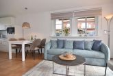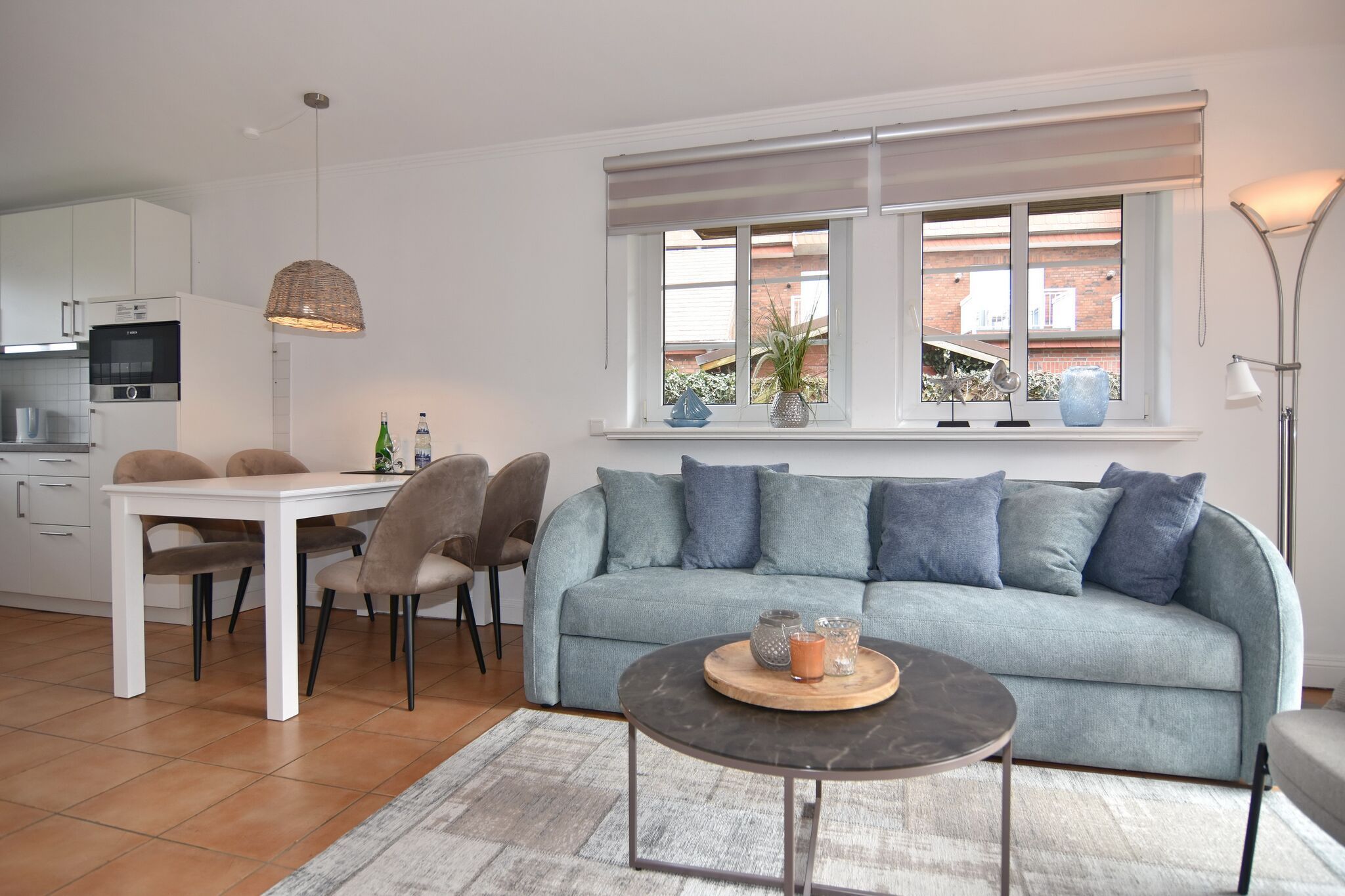 Großzügige und geschmackvolle 3-Zimmer-Ferienwohnung mit Südterrasse im Haus Olympia I, Strandkorb (Apr.-Okt.). Ca. 71m². EG: Wohnzimmer mit Sitzecke, Essecke und offener Küche mit Geschirrspüler und Mikrowelle, Kabel-TV / Stereo-Anlage mit CD, W-LAN ohne Gewähr. UG: 1 Schlafzimmer mit Doppelbett (2x90x200), 1 Schlafzimmer mit 2 Einzelbetten (2x90x190) Duschbad/WC. Nichtraucherwohnung. Tierhaltung verboten. Unter Haus 4 befindet sich das Schwimmbad mit Finnischer Sauna. Unter Haus 2 befindet sich ein separater Wellnessbereich mit Dampfsauna, Finnischer Sauna und Ruhebereich. Eine Waschküche mit Gemeinschaftswaschmaschine/Trockner ist vorhanden. Offenes W-LAN-Netzwerk steht zur Verfügung (ohne Gewähr). Bettwäsche und Handtücher sind zur Anreise aufgezogen. Ein Garagenstellplatz kann kostenpflichtig gebucht werden!