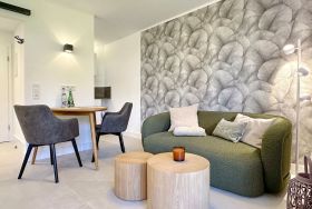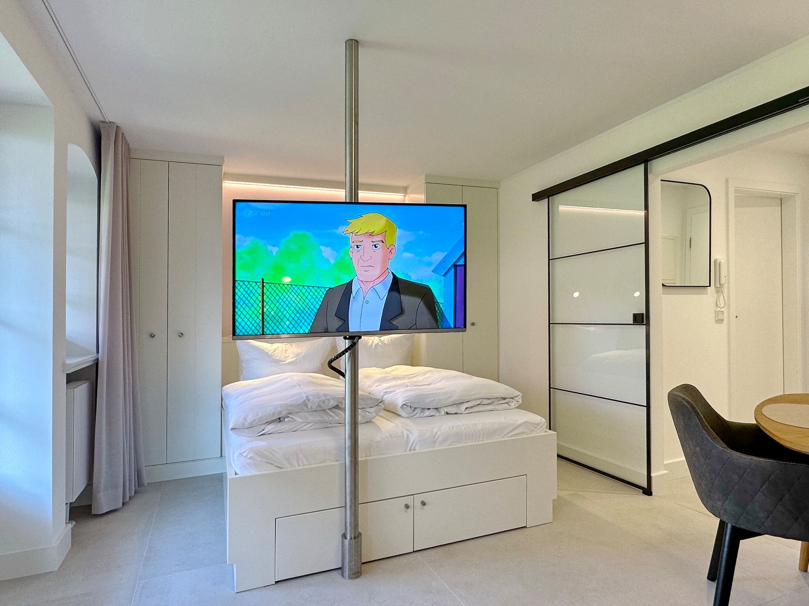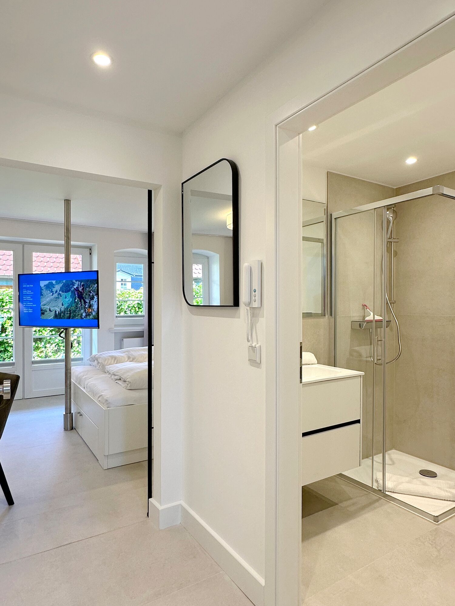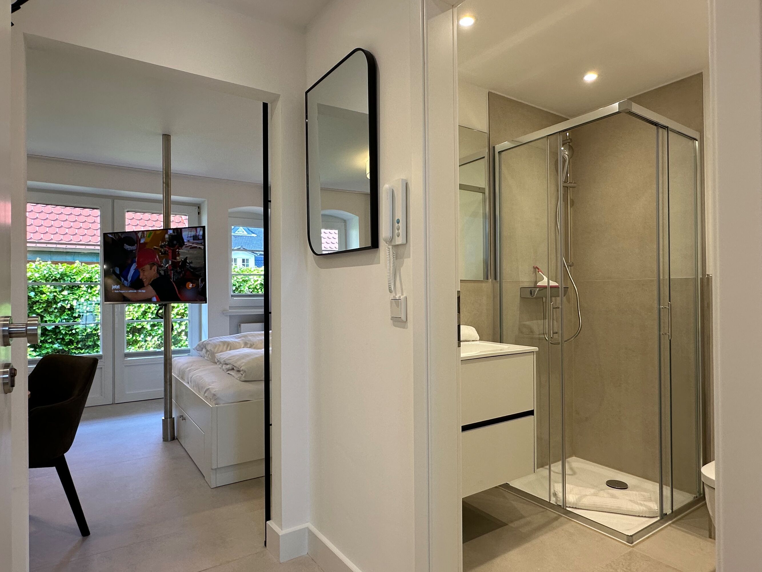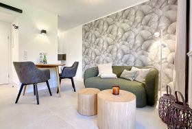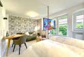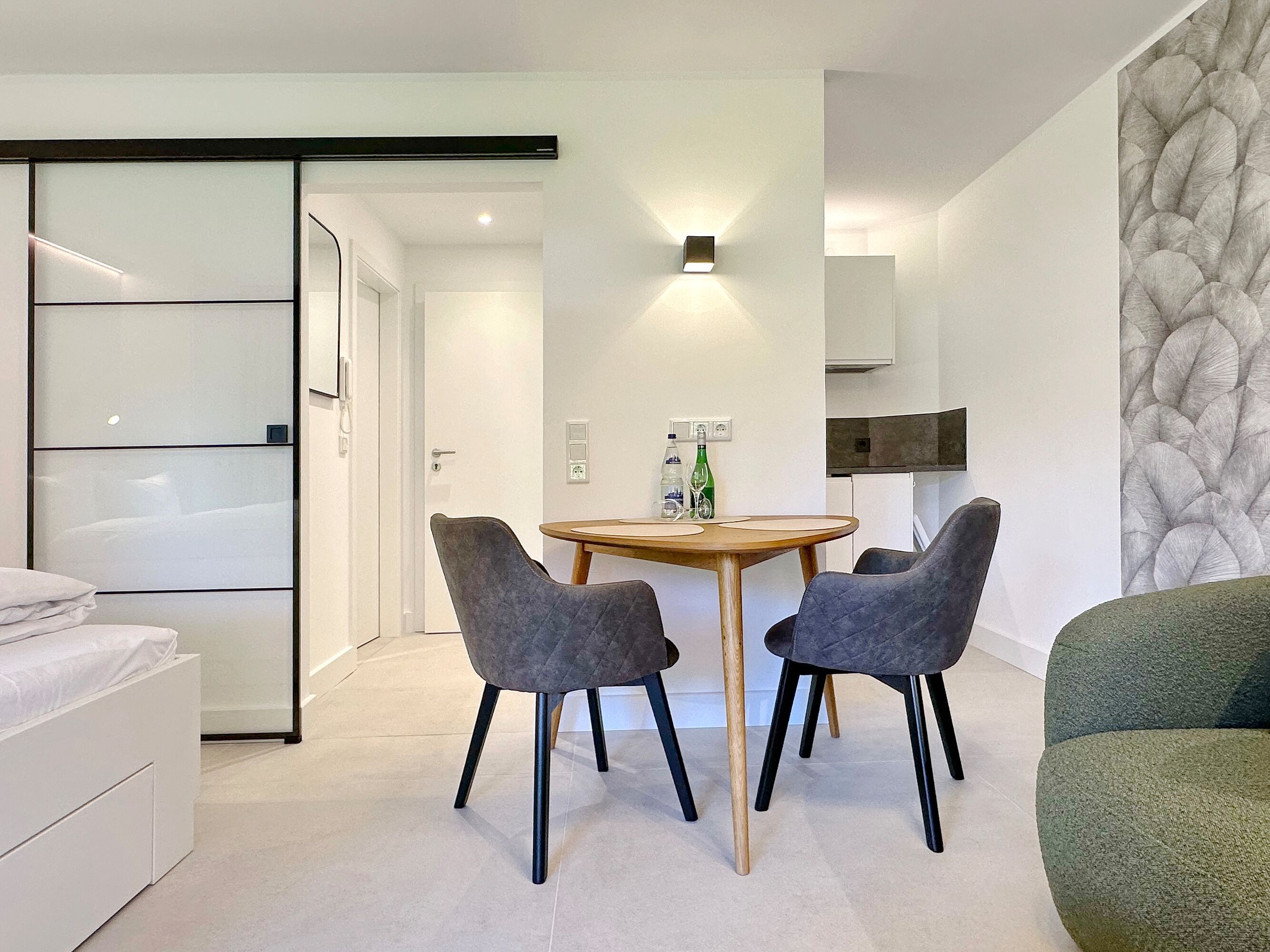 Geschmackvoll eingerichtete 1-Zimmer-Ferienwohnung von ca. 30 qm im Haus Olympia 2. Nichtraucherwohnung! Wohn-/Schlafraum mit Doppelbett (160x200), Essplatz, 2-Sitzer-Couch, Kleiderschrank, weiße Einbauküche mit Geschirrspüler und Induktionsherd, Unterbaukühlschrank mit Gefrierfach, Flat-TV, Radio, W-LAN ohne Gewähr, Duschbad/WC. Südterrasse mit Terrassenmöbeln. Unter Haus 4 befindet sich das Schwimmbad mit Finnischer Sauna. Unter Haus 2 befindet sich ein separater Wellnessbereich mit Dampfsauna, Finnischer Sauna und Ruhebereich. Eine Waschküche mit Gemeinschaftswaschmaschine/Trockner ist vorhanden. Offenes W-LAN-Netzwerk steht zur Verfügung (ohne Gewähr). Bettwäsche und Handtücher sind zur Anreise aufgezogen. Ein Garagenstellplatz kann kostenpflichtig gebucht werden!