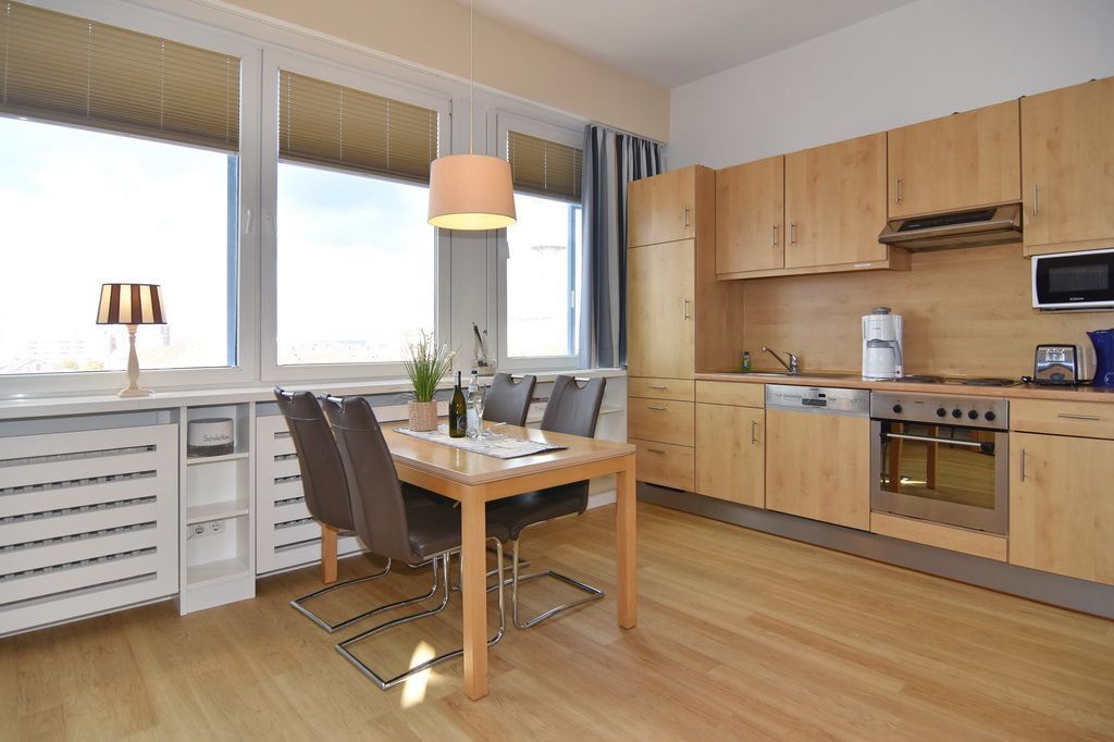 Gepflegte 2-Zimmer-Ferienwohnung im 4.OG des Hauses Mauritius. Auf ca. 46m² verfügt die Wohnung über einen Wohn-/Schlafraum mit Doppelschlafcouch und Sessel sowie einem Essplatz für 4 Personen. Im Wohnraum befindet sich die voll ausgestattete Küchenzeile mit Backofen, Mikrowelle und Geschirrspüler. Vom Wohnraum aus gelangt man auf einen kleinen möblierter Südbalkon. Weiterhin bietet die Wohnung ein Schlafzimmer mit Doppelbett, Kleiderschrank und Flat-TV sowie ein Duschbad/WC mit Kosmetikspiegel und Föhn. Sowohl Wohnzimmer als auch Schlafzimmer sind mit Verdunklungsplissee ausgestattet. Das Rauchen und die Haltung von Tieren ist hier nicht gestattet. Ein geräumiger Fahrradkeller und eine hauseigene Waschküche befindet sich im Haus. Pkw-Stellplatz kann kostenpflichtig hinzugebucht werden. Bettwäsche und Handtücher sind zur Anreise aufgezogen! Internet ist im Haus vorhanden und wird ohne Gewähr angeboten.