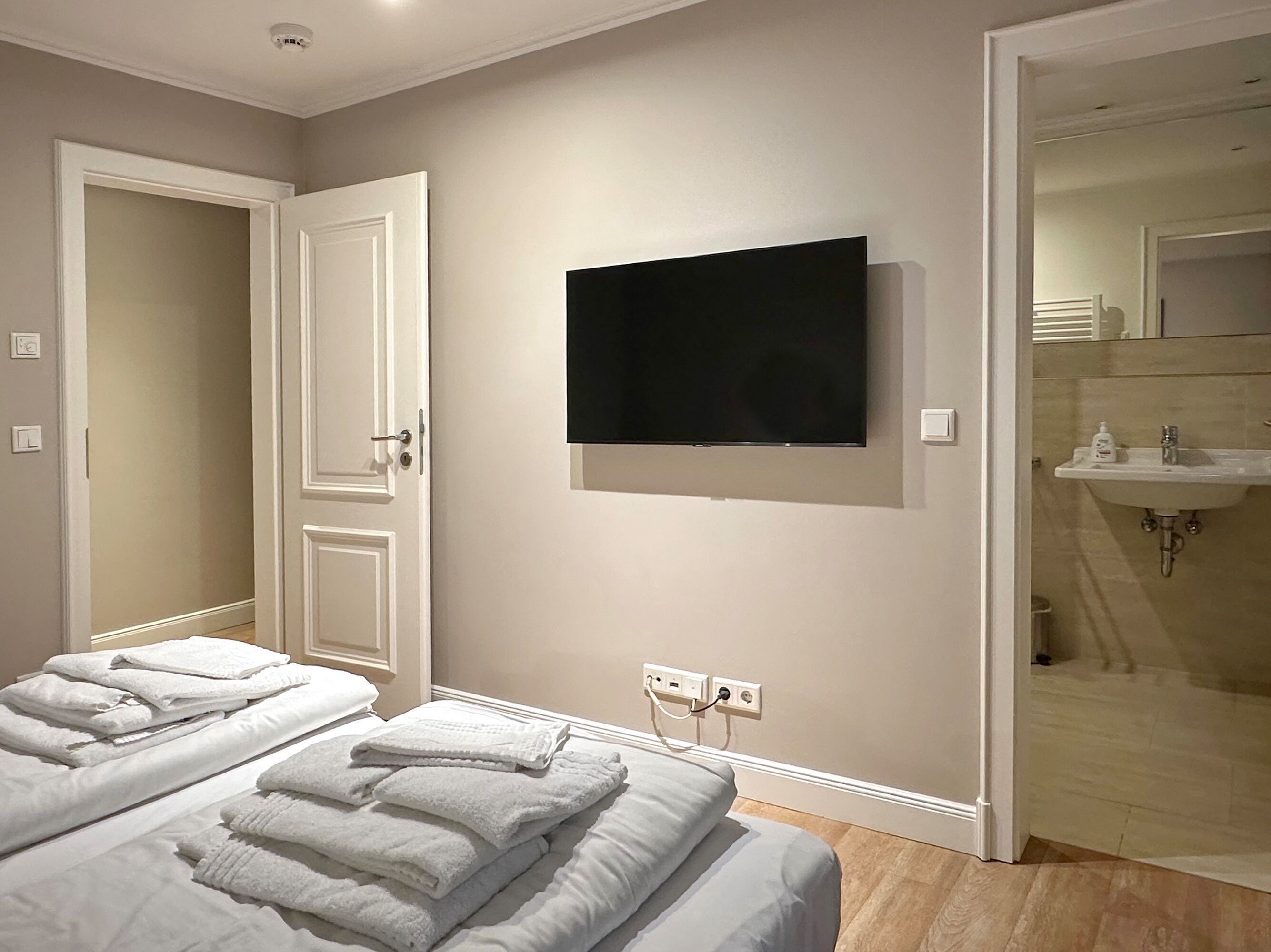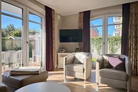 Exklusive 4-Zimmer-Ferienwohnung in der Residenz Alva mit Wellnessbereich (Pool, Sauna, Dampfsauna) unweit des Badestrands und der Fußgängerzone. Nichtraucher, ca. 108m².EG.: Wohnraum mit Sitzecke und Sessel, Essplatz, Flat-TV, Stereo-Anlage (CD und Bluetooth), W-LAN (ohne Gewähr), Süd-/Westterrasse mit Gartenmöbeln, offene Küche mit Mikrowelle, Backofen und Geschirrspüler, Duschbad/WC, Schlafzimmer mit Doppelbett/Flat-TV UG: 2 Schlafzimmer mit Doppelbetten, Flat-TV`s und 2 Duschbädern. Direkter Zugang zum Schwimmbadbereich. PKW-Stellplatz Nr.5. Waschküche (gegen Gebühr). Bettwäsche und Handtücher sind zur Anreise aufgezogen. Tierhaltung ist nicht gestattet! Auf dem östlich angrenzenden Nachbargrundstück entsteht ab März 2024 ein Neubauvorhaben, hier kann es zu Lärmbelästigungen kommen.