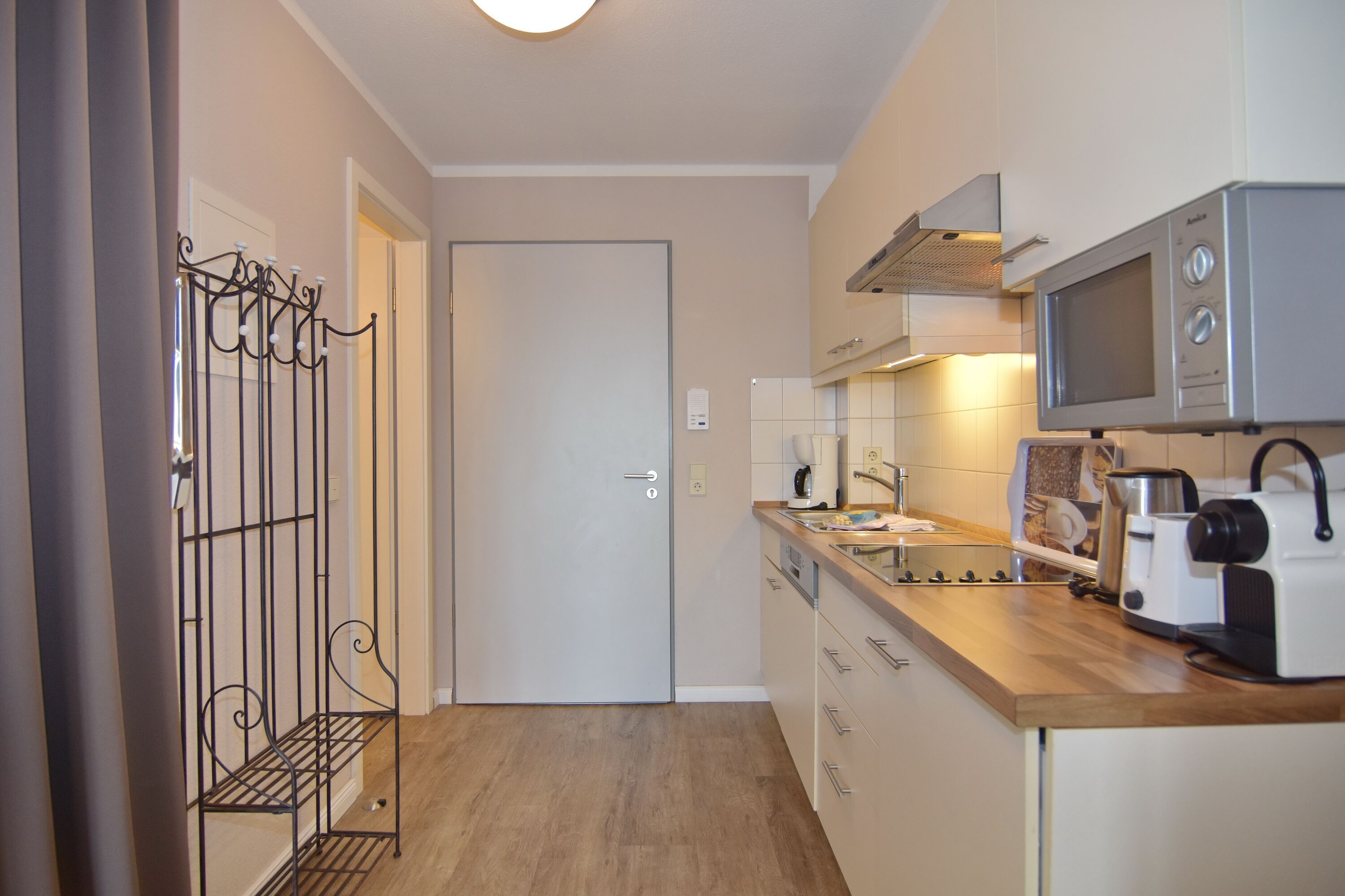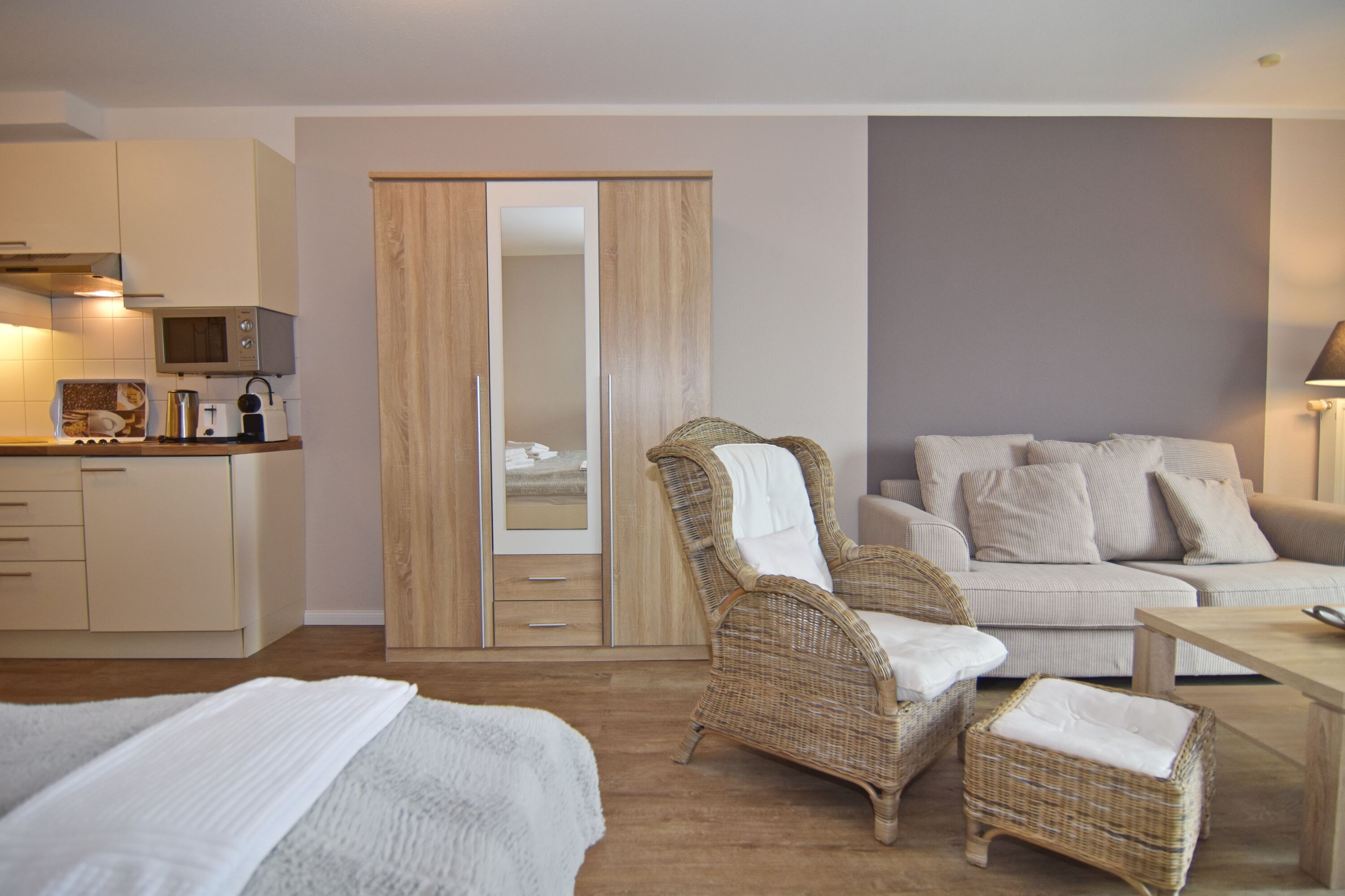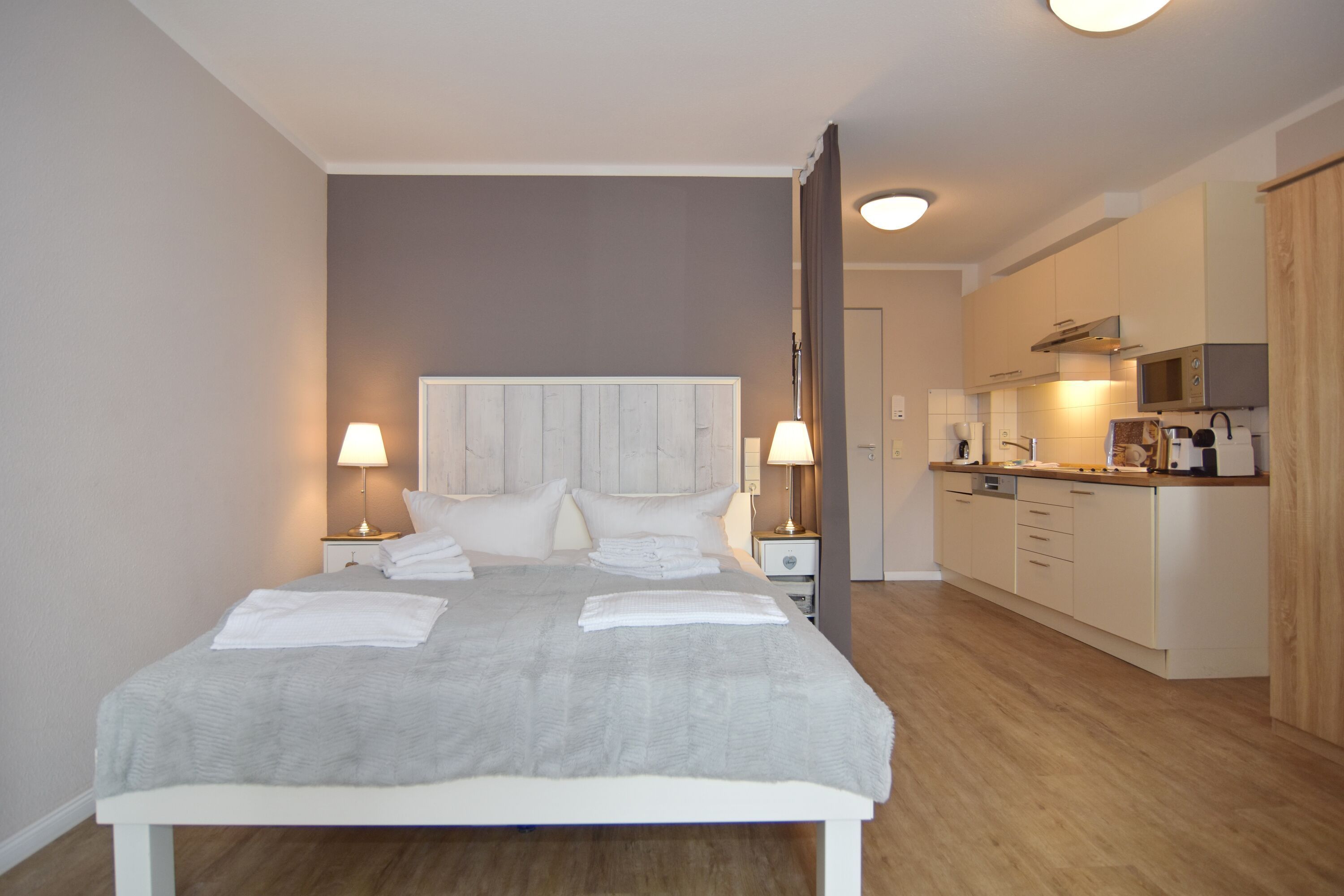Moderne 1-Zimmer-Ferienwohnung im roten Haus, ca. 36m², 2. OG. Nichtraucher-Whg.! Wohn-/Schlafraum mit Südbalkon, Doppelbett, Essplatz, 2-Sitzer-Couch und Sessel, Kabel-TV, Küchenzeile mit Geschirrspüler und Mikrowelle, Nespressomaschine, Duschbad/WC. Internetanschluß (ohne Gewähr). Waschküche und Fahrradkeller im Nebenhaus Mauritius. Pkw-Stellplatz kann kostenpflichtig hinzugebucht werden. Bettwäsche und Handtücher sind zur Anreise aufgezogen! Tierhaltung ist nicht gestattet.