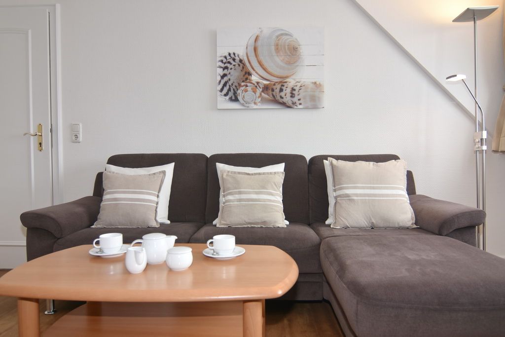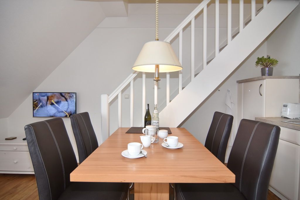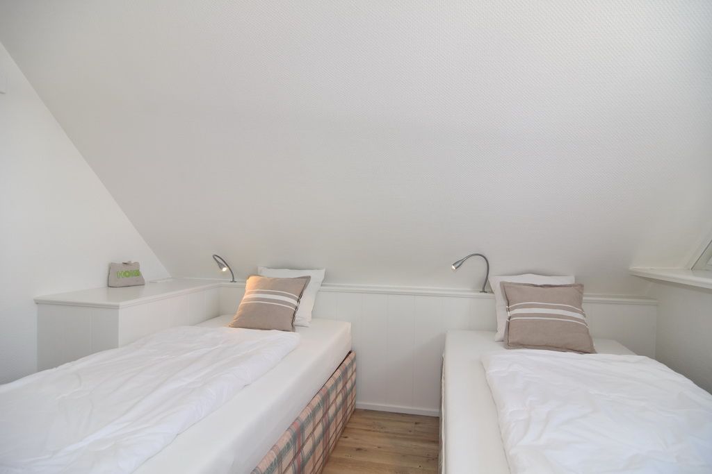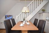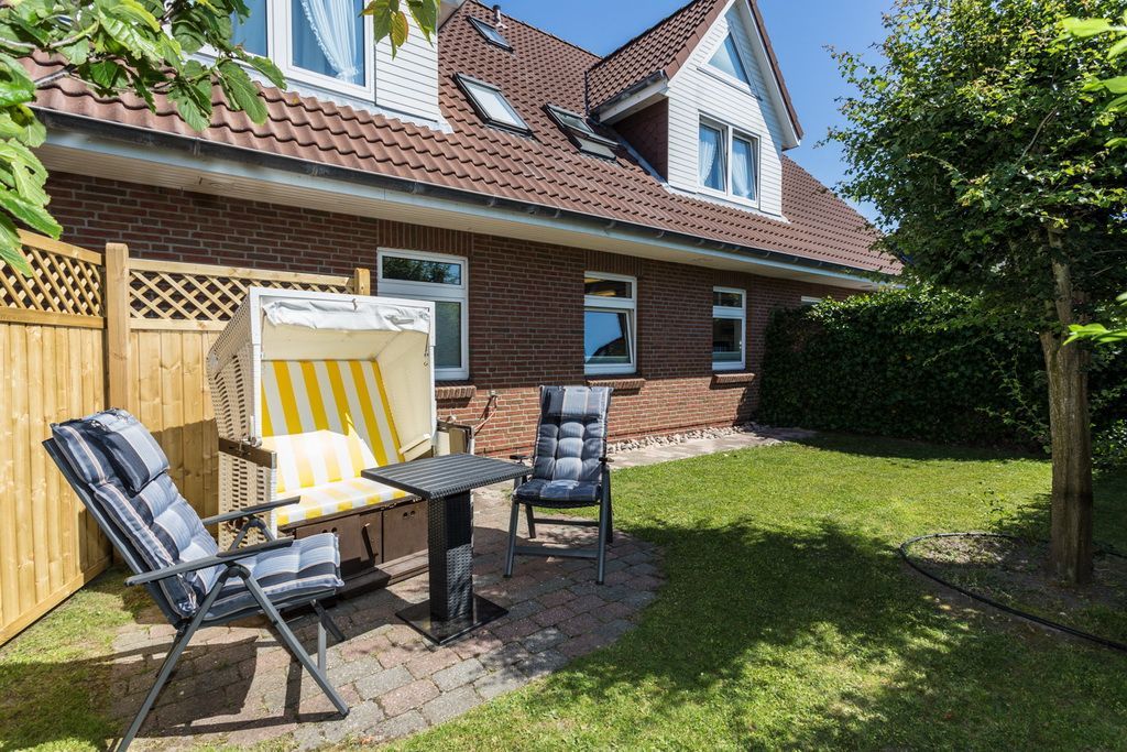Die moderne und geräumige 3-Zimmer-Ferienwohnung für 4 Personen, ca. 65m², erstreckt sich über zwei Ebenen. Im Obergeschoss befinden sich ein Duschbad / WC, Wohnzimmer mit Essplatz sowie Sitzgruppe, Flat-TV, Radio, Telefon und kostenfreiem W-Lan. Die Küchenzeile ist zum Wohnraum offen mit Geschirrspüler und Mikrowelle ausgestattet. Waschmaschine sowie Trockner sind gemeinschaftlich auf der gleichen Ebene im Obergeschoß nutzbar. Eine Treppe ins Dachgeschoss führt zu zwei separaten Schlafzimmern (alle Betten sind wahlweise als Einzel- oder Doppelbetten stellbar) und einem kleinen Abstellraum. Ein Pkw-Stellplatz befindet sich vor dem Haus. Der gemeinschaftliche Außenbereich bietet einen Terrassenplatz mit Strandkorb und Gartenmöbeln, einen überdachten Sitzbereich, einen großzügigen Fahrradunterstand sowie Schränke für Ihre Golfbags. Tierhaltung ist gestattet und muss kostenpflichtig angmeldet werden. v