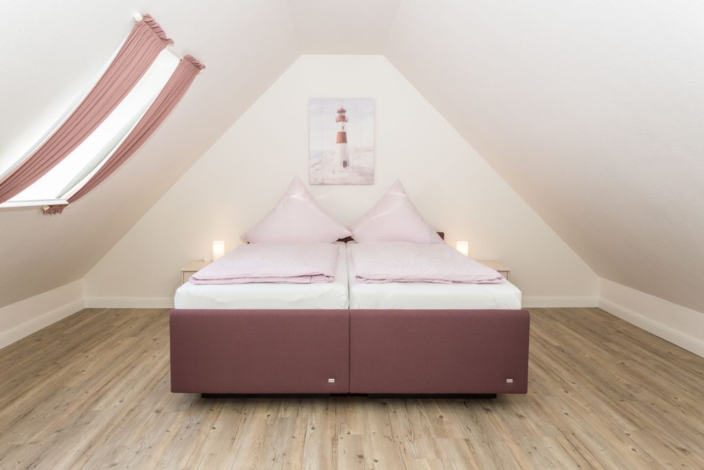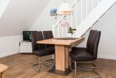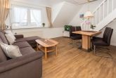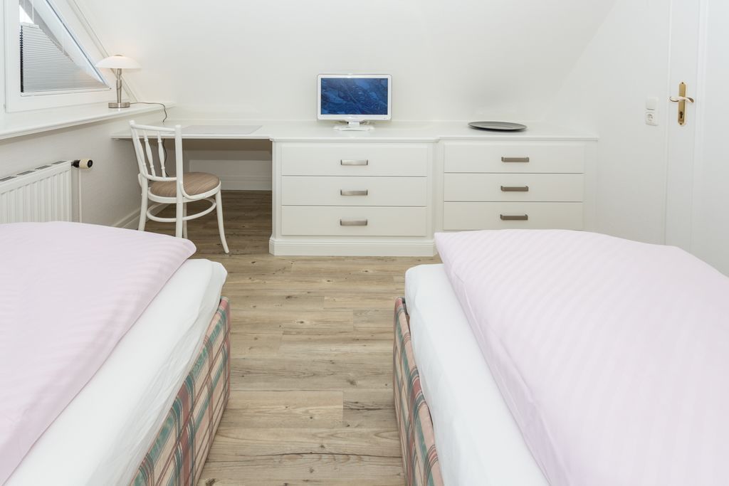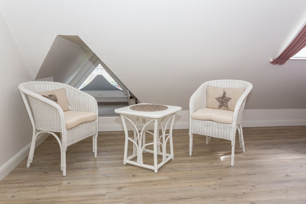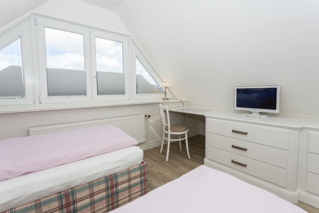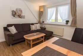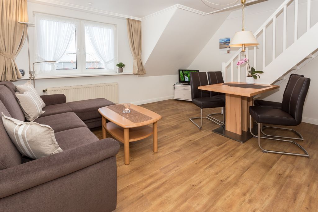 Die geräumige 3-Zimmer-Ferienwohnung für 4 Personen, ca. 65m², erstreckt sich über zwei Ebenen. Im Obergeschoss befinden sich ein Duschbad / WC, Wohnzimmer mit Essplatz sowie Sitzgruppe, Flat-TV, Radio, Telefon und kostenfreiem W-Lan. Die Küchenzeile ist zum Wohnraum offen mit Geschirrspüler und Mikrowelle ausgestattet. Waschmaschine sowie Trockner sind gemeinschaftlich auf der gleichen Ebene im Obergeschoß nutzbar. Eine Treppe ins Dachgeschoss führt zu zwei separaten Schlafzimmern (alle Betten sind wahlweise als Einzel- oder Doppelbetten stellbar) und einem kleinen Abstellraum. Ein Pkw-Stellplatz befindet sich vor dem Haus. Der gemeinschaftliche Außenbereich bietet einen Terrassenplatz mit Strandkorb und Gartenmöbeln, einen überdachten Sitzbereich, einen großzügigen Fahrradunterstand sowie Schränke für Ihre Golfbags. Tierhaltung ist nicht gestattet.
