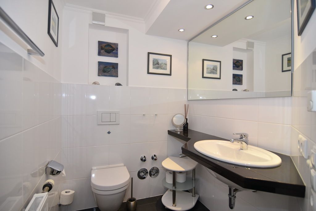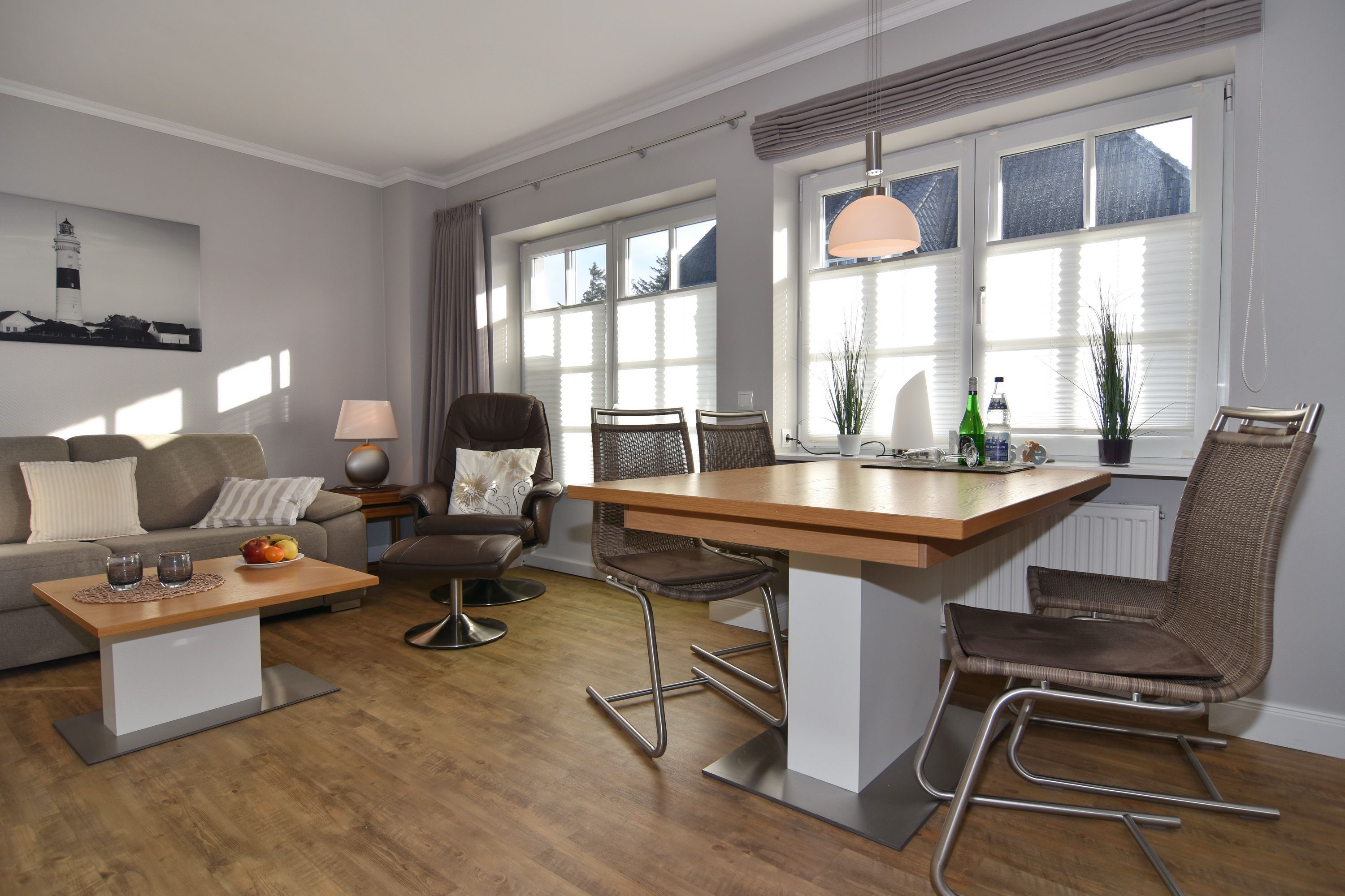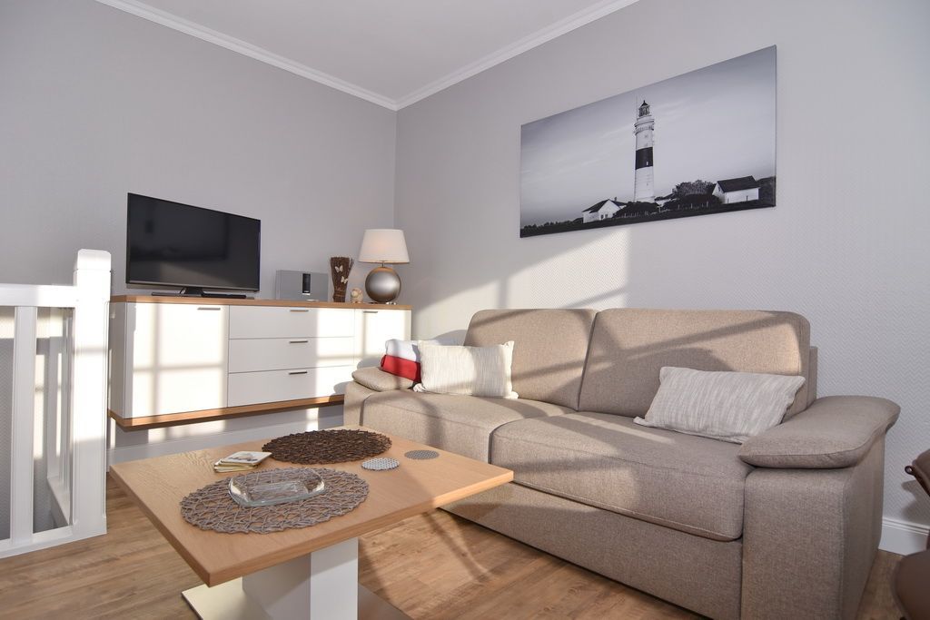 Schicke 2-Zimmer-Ferienwohnung in der Anlage Witthüs. Ca. 50 m². EG: Wohnzimmer mit Sitz- und Essecke und Zugang zur Ostterrasse, Flat-TV, Radio, Internet, separate Küche mit Ceranherd, Mikrowelle und Geschirrspüler. UG: Schlafzimmer mit Doppelbett (180x200), Einbauschrank und Abseite, neues Duschbad/WC. Im Nebengebäude steht Ihnen eine gemeinschaftliche Sauna zur Verfügung. Zur Wohnung gehört ein Pkw-Aussenstellplatz. In der Gemeinschaftsanlage gibt es eine Waschküche (gegen Gebühr). Bettwäsche und Handtücher können kostenpflichtig gebucht werden.