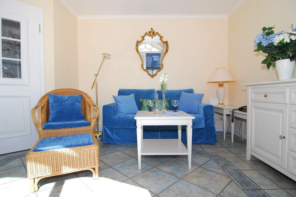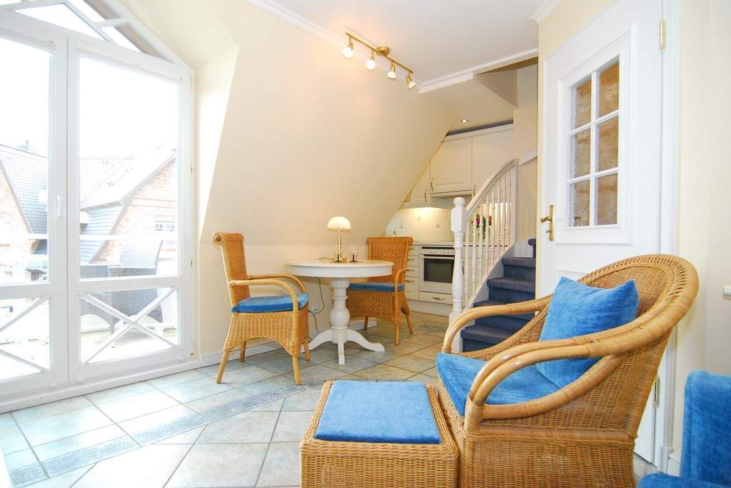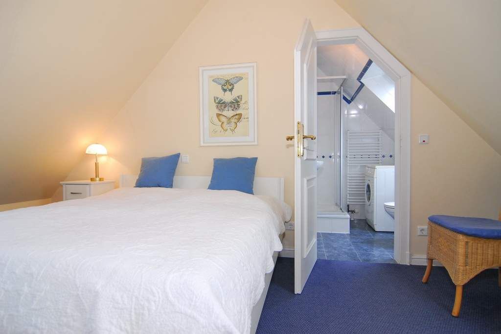 Elegante 2-Zimmer-Ferienwohnung, OG/DG, 42m² ,Hopfengarten, OG: ist gefliest und mit Fußbodenheizung, Wohnraum mit Couch und Rattansessel, Eßtisch, HD-Flat-TV, W-Lan und Telefonflatrate ins deutsche Festnetz (ohne Gewähr), Radio mit CD, auf dem Südbalkon mit Balkonmöbeln und Sonnenschirm sitzen Sie geschützt vor dem Westwind, offene Küche mit Geschirrspüler, Mikrowelle und Backofen. DG: offenes Schlafzimmer mit Doppelbett (160x200) und HD-Flat-TV, Duschbad/WC, Waschmaschine / Trockner. PKW-Stellplatz Nr. 12, gemeinschaftlicher Fahrradabstellraum. Tierhaltung ist nicht gestattet. Bettwäsche und Handtücher sind zur Anreise aufgezogen. Nichtraucher-Appartement!