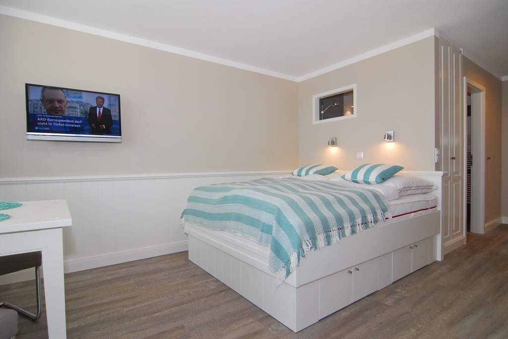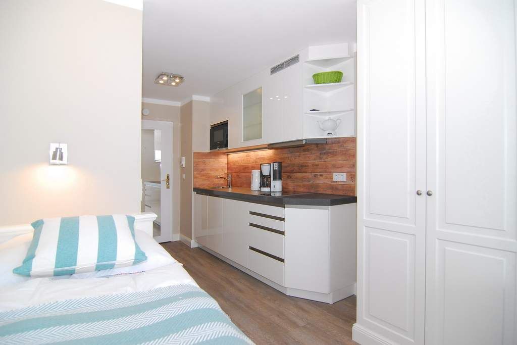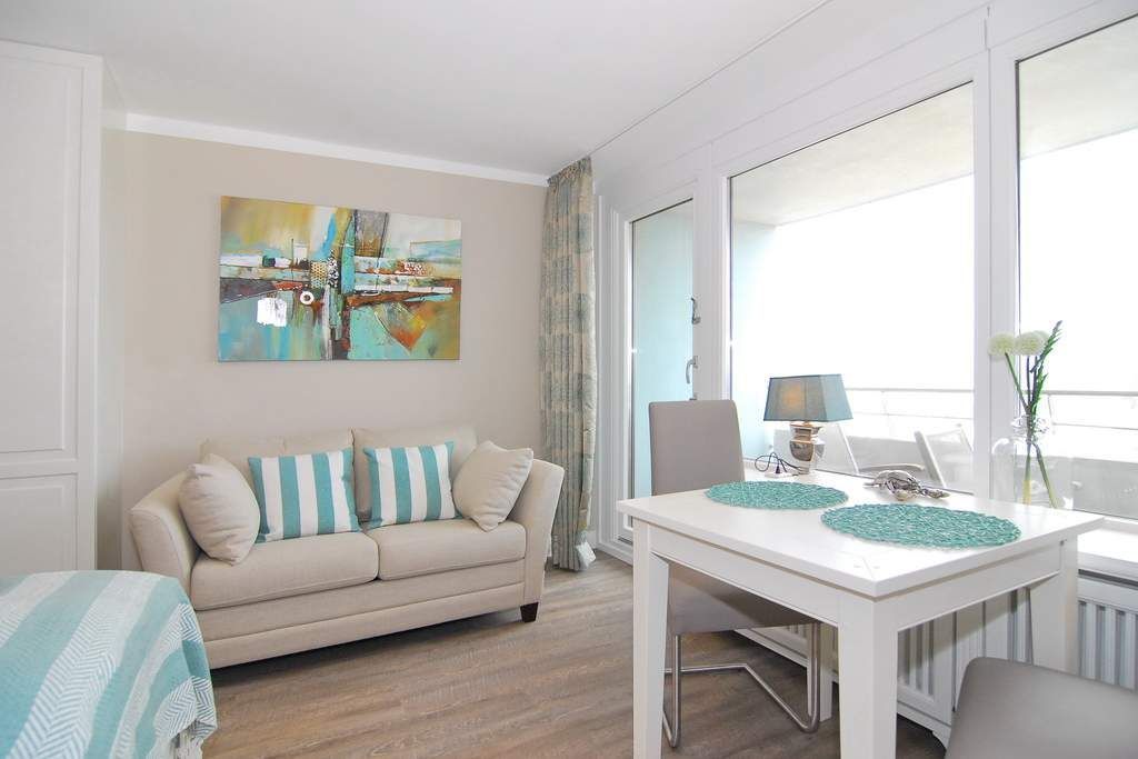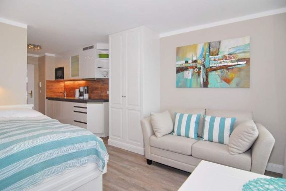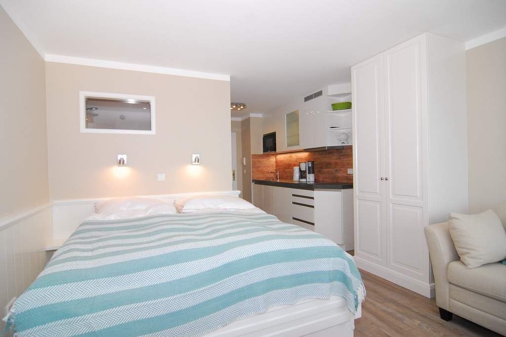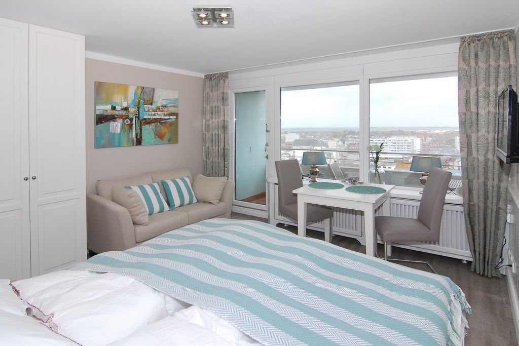 Exklusive 1-Zimmer-Ferienwohnung mit traumhaften Blick über die Insel im Haus Metropol. Ca. 30m², 12. OG, Nichtraucher-Wohnung! Wohn-/Schlafraum mit Doppelbett (160x200, 2 Matratzen), 2-Sitzer-Sofa, Essplatz am Fenster, Flat-TV, Radio mit CD und USB. Internet ( ohne Gewähr ), Ostbalkon mit Blick über die Insel bis zum Rantum Becken, Küchenzeile mit Geschirrspüler und Mikrowelle, Duschbad/WC (inkl. großem Spiegel) Tierhaltung ist nicht gestattet. Bettwäsche und Handtücher sind zur Anreise aufgezogen. Ein PKW-Stellplatz kann kostenpflichtig zugebucht werden.