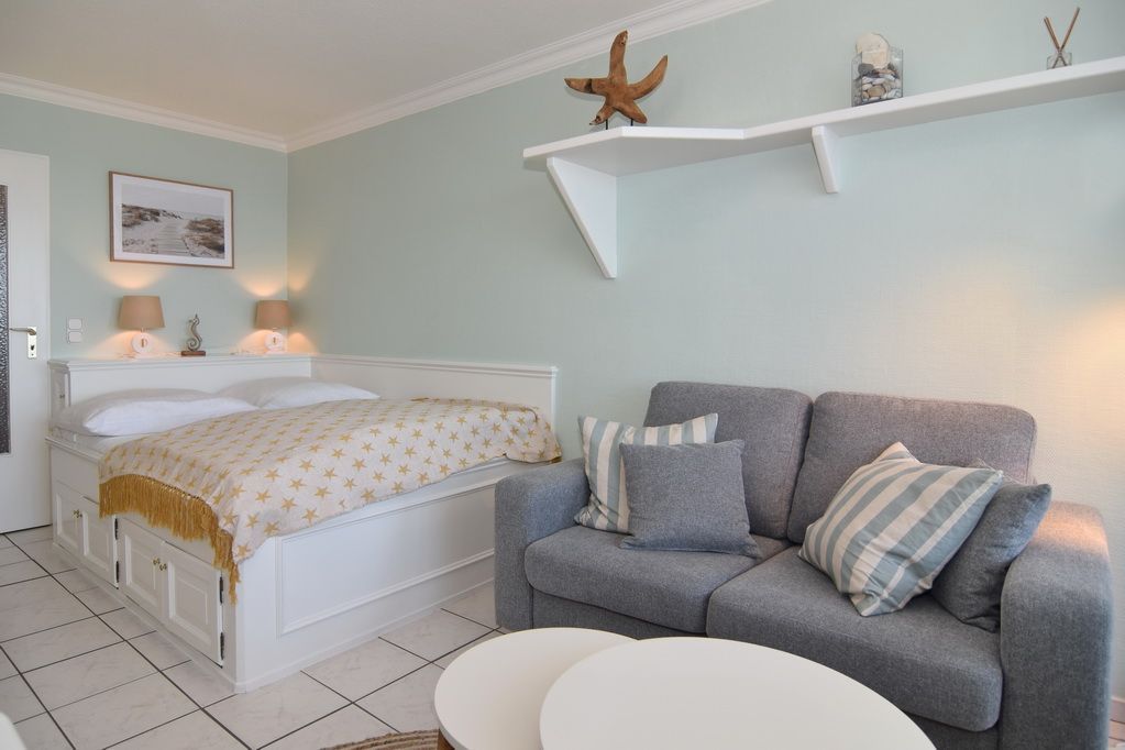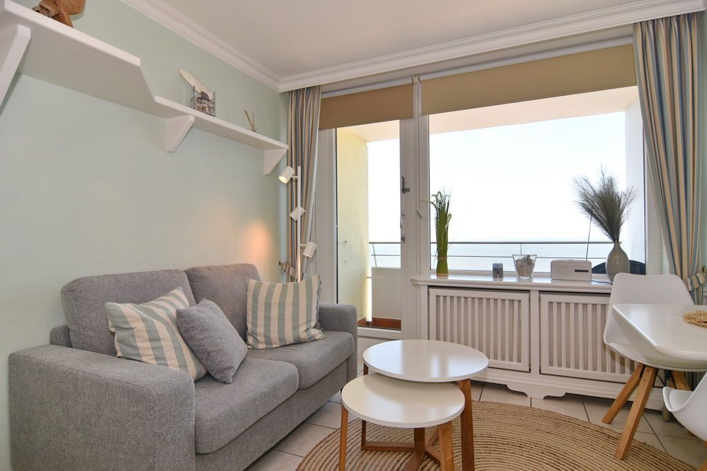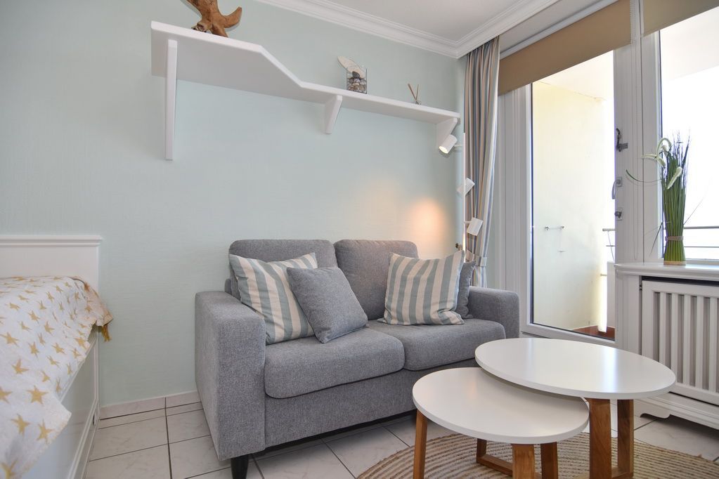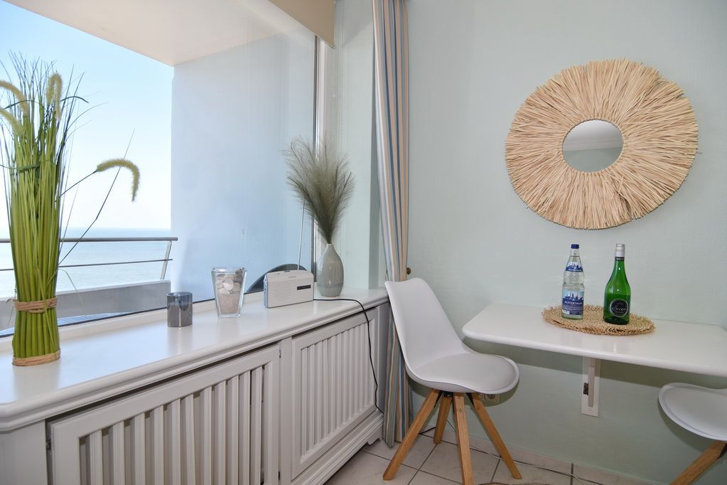 1-Zimmer-Ferienwohnung, 25 qm, 13. OG im Haus Metropol, zur Seeseite. Herrlich freier Blick aufs Meer. Wohn-/Schlafraum mit Doppelbett (140x200, 2 Matratzen), Sitzecke, Eßplatz, Farb-TV, Radio, W-Lan (ohne Gewähr), Küchenzeile im Flurbereich mit Geschirrspüler und Microwelle, Garderobe, Dusche/WC.Bettwäsche und Handtücher sind zur Anreise aufgezogen. Ein PKW-Stellplatz kann kostenpflichtig zugebucht werden. - Tierhaltung und Rauchen ist nicht gestattet!