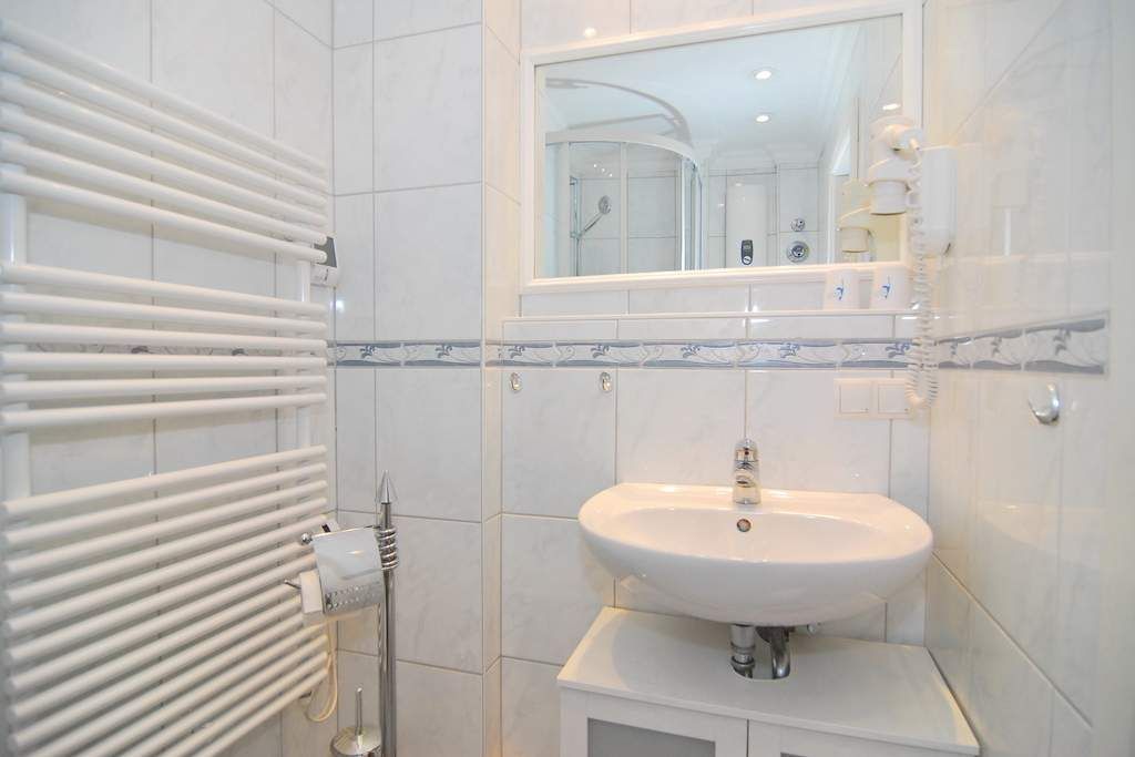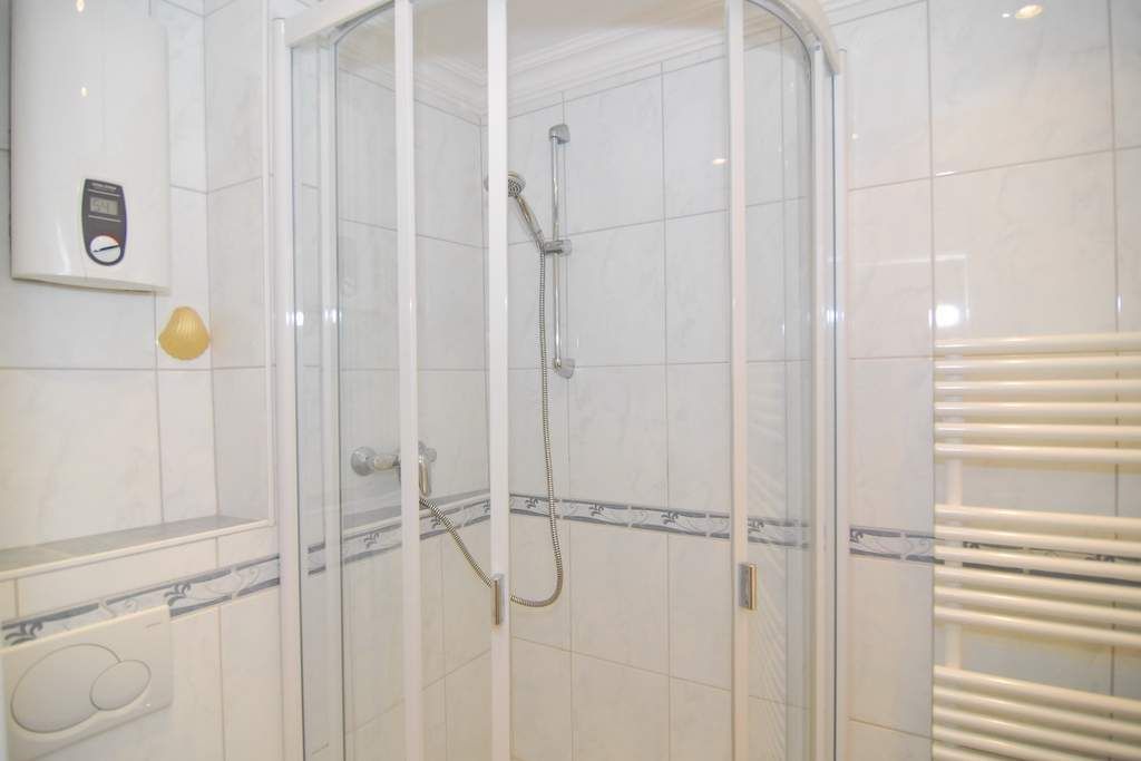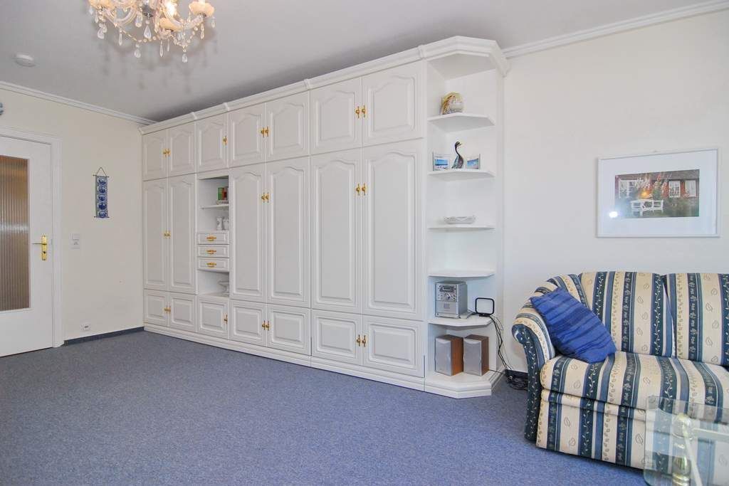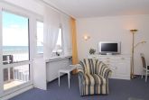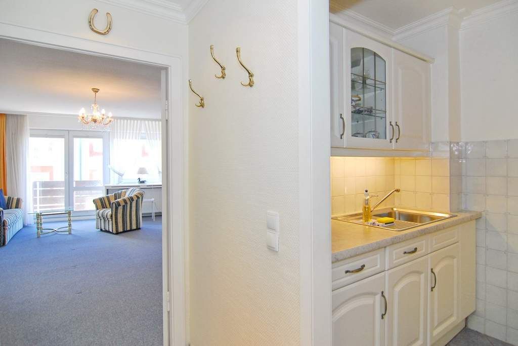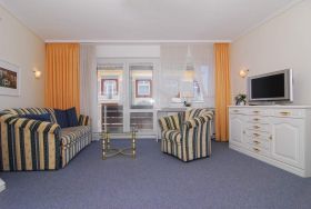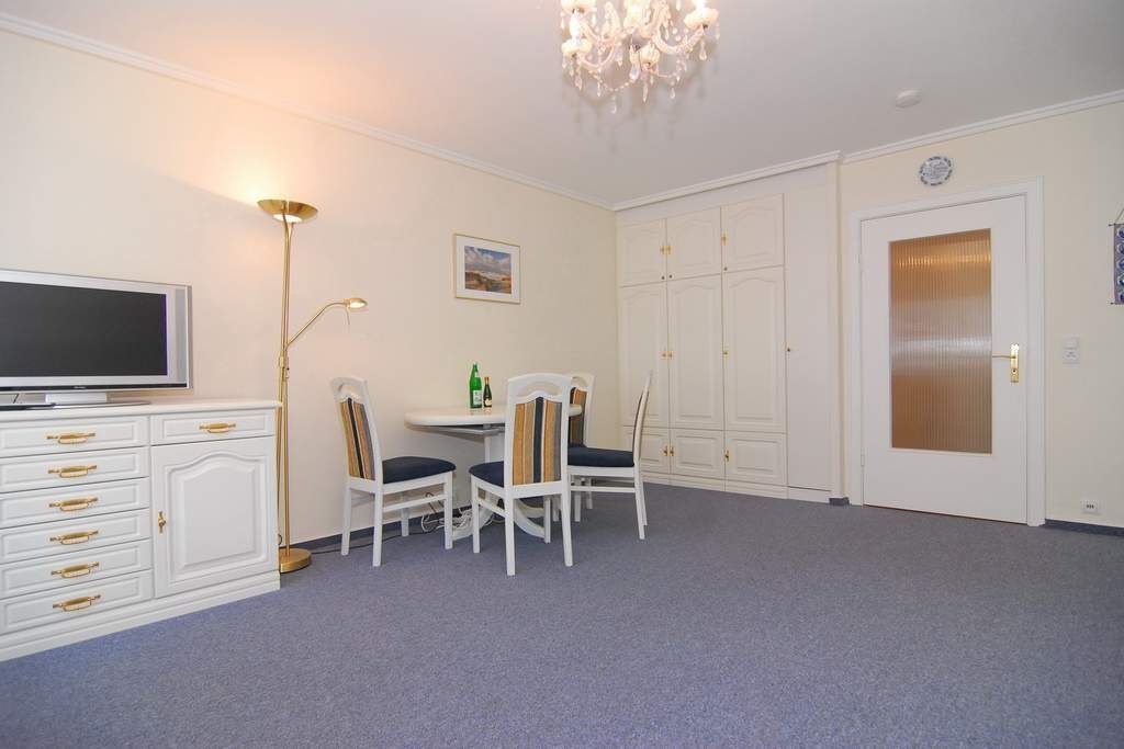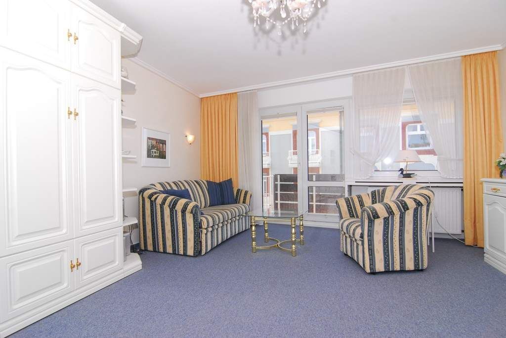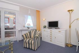 1-Zimmer-Ferienwohnung, ca. 40 m², 4. OG. Nichtraucher. Wohn-/Schlafraum mit kleinem Westbalkon und teilweisem Meeresblick, Schrankwand mit Einzelschrankbetten, Eßtisch mit 3 Stühlen, 2 Sitzer-Couch, Sessel und Couchtisch, Sideboard, Kabel-Flat-TV, Radio, separate Küche mit 2 Platten Cerankochfeld, Mikrowelle und Geschirrspüler, Duschbad mit kleiner Runddusche, Fön und WC. Fahrstuhl vorhanden. Tierhaltung ist nicht gestattet. Pkw-Stellplatz kann kostenpflichtig hinzugebucht werden. Bettwäsche und Handtücher sind zur Anreise aufgezogen!