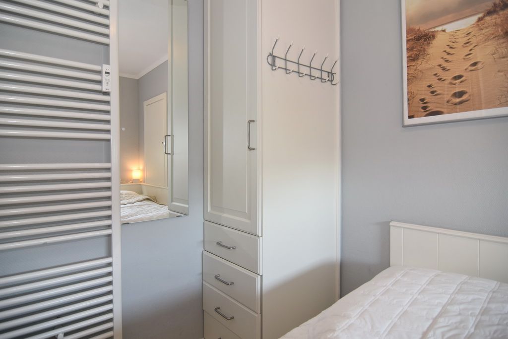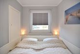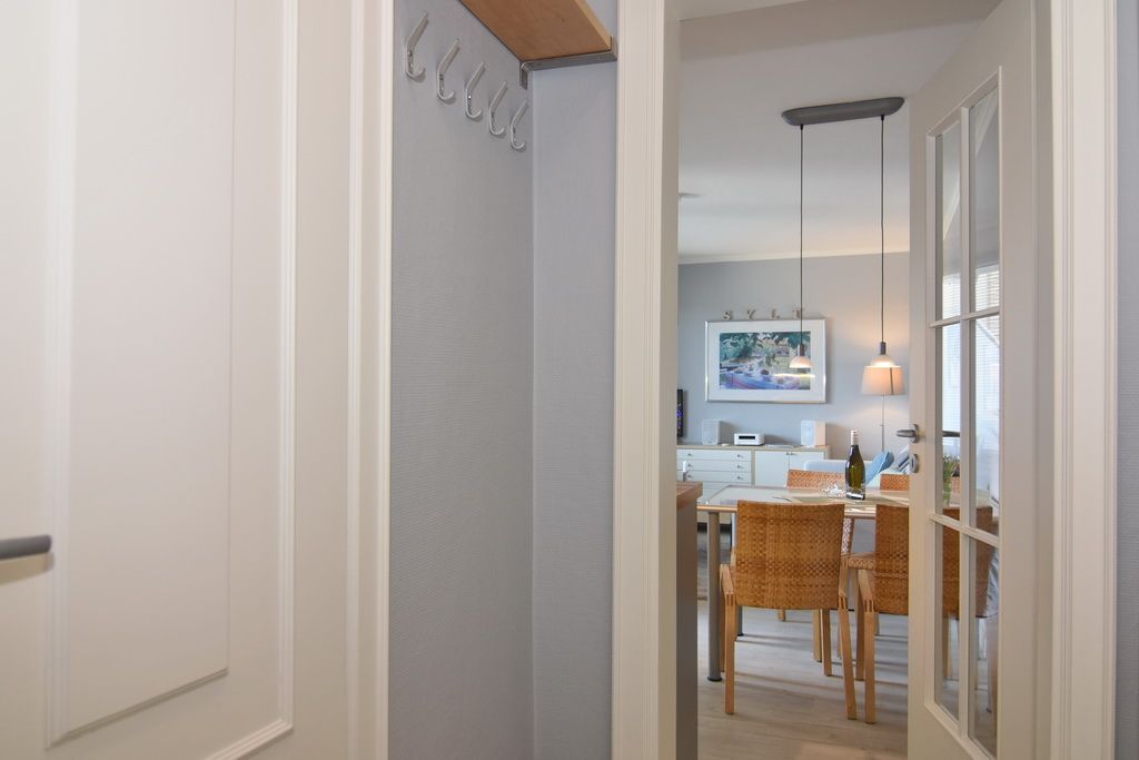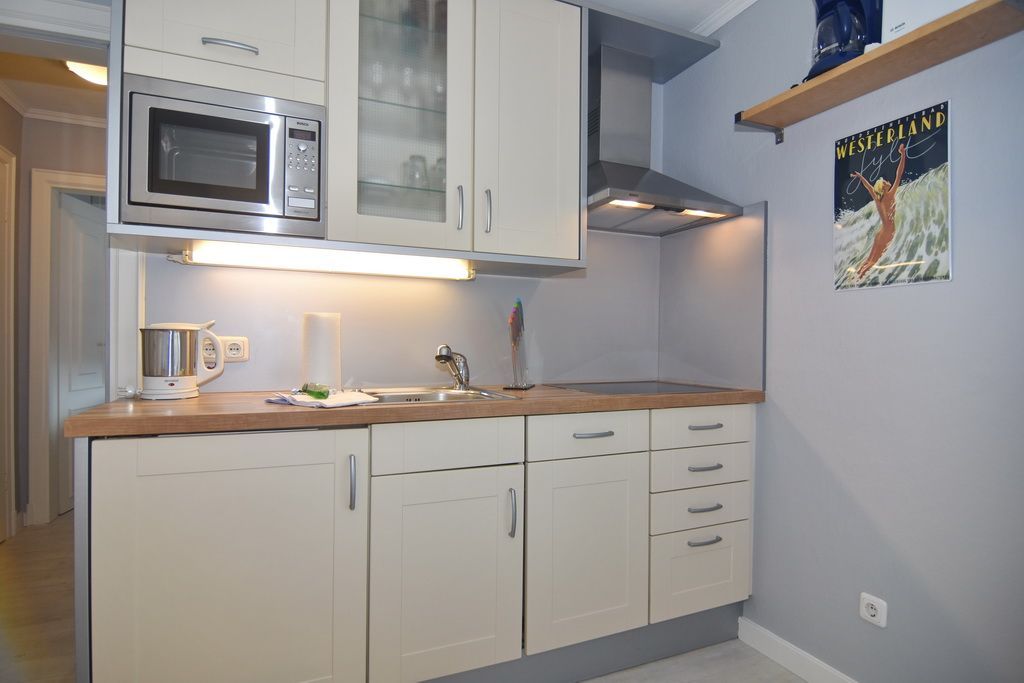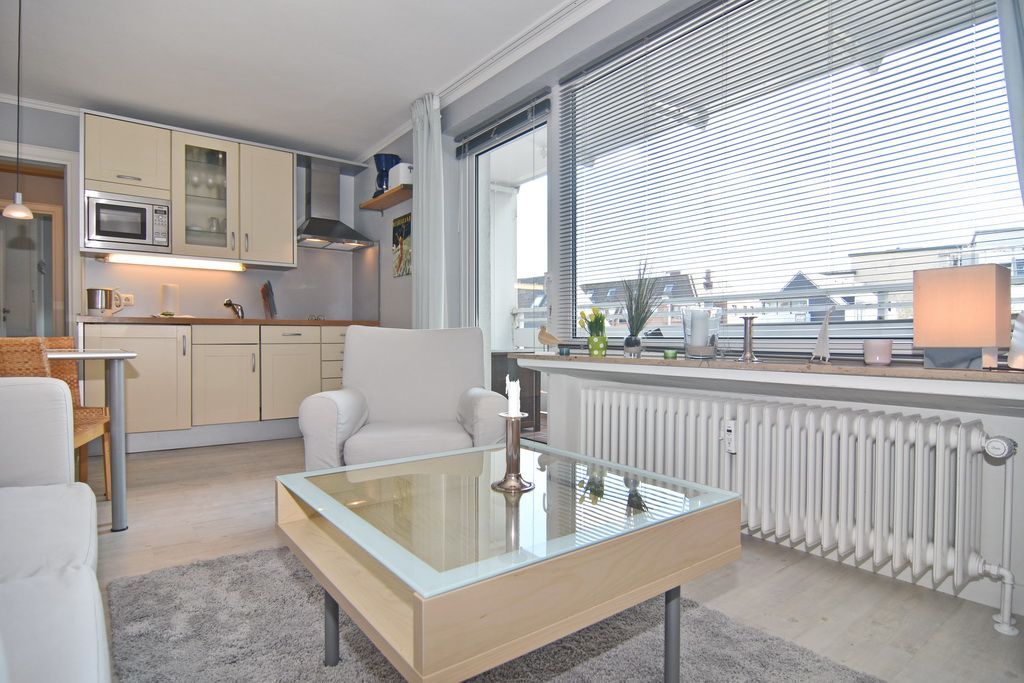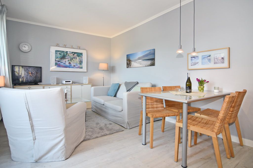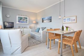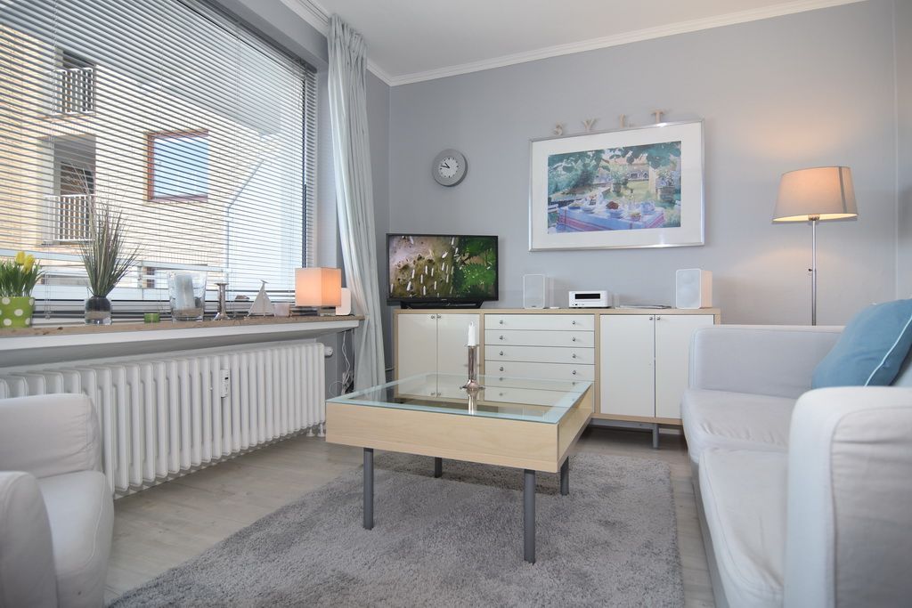 Moderne 1 1/2 Zimmer-Ferienwohnung im 1.OG. Nichtraucher, ca. 34 m², max. 3 Personen. Wohnraum mit Schlafcouch (140x200 cm) und Sessel, Flat-TV, Bluetooth-Stereoanlage, WLAN (ohne Gewähr), Eßplatz, offene Küchenzeile mit Geschirrspüler und Mikrowelle, Ostbalkon mit Balkonmöbeln, kleines Schlafzimmer mit Doppelbett (2x90x200 cm), Duschbad/WC. Kostenloser Saison-Strandkorb am Hauptstrand von Westerland. Das Apartment ist komplett mit einem Designboden ausgelegt. Tierhaltung ist nicht gestattet. Bettwäsche und Handtücher sind zur Anreise aufgezogen. Ein PKW-Stellplatz kann kostenpflichtig zugebucht werden. Fahrstuhl vorhanden, Treppenstufen im Eingangsbereich.