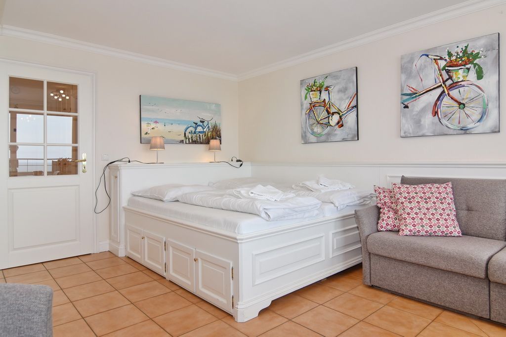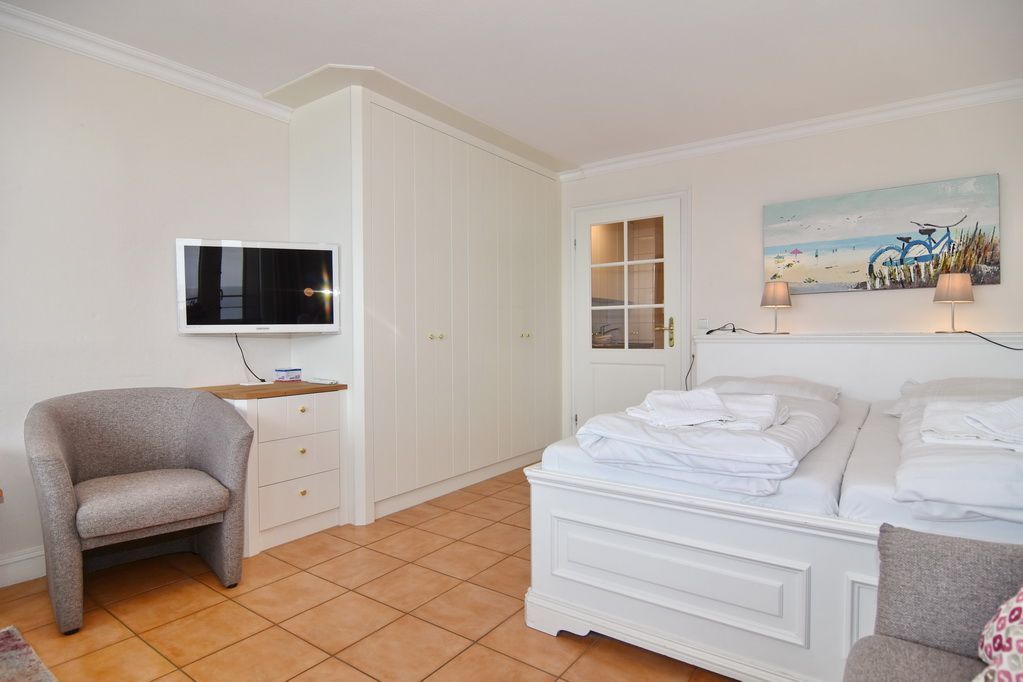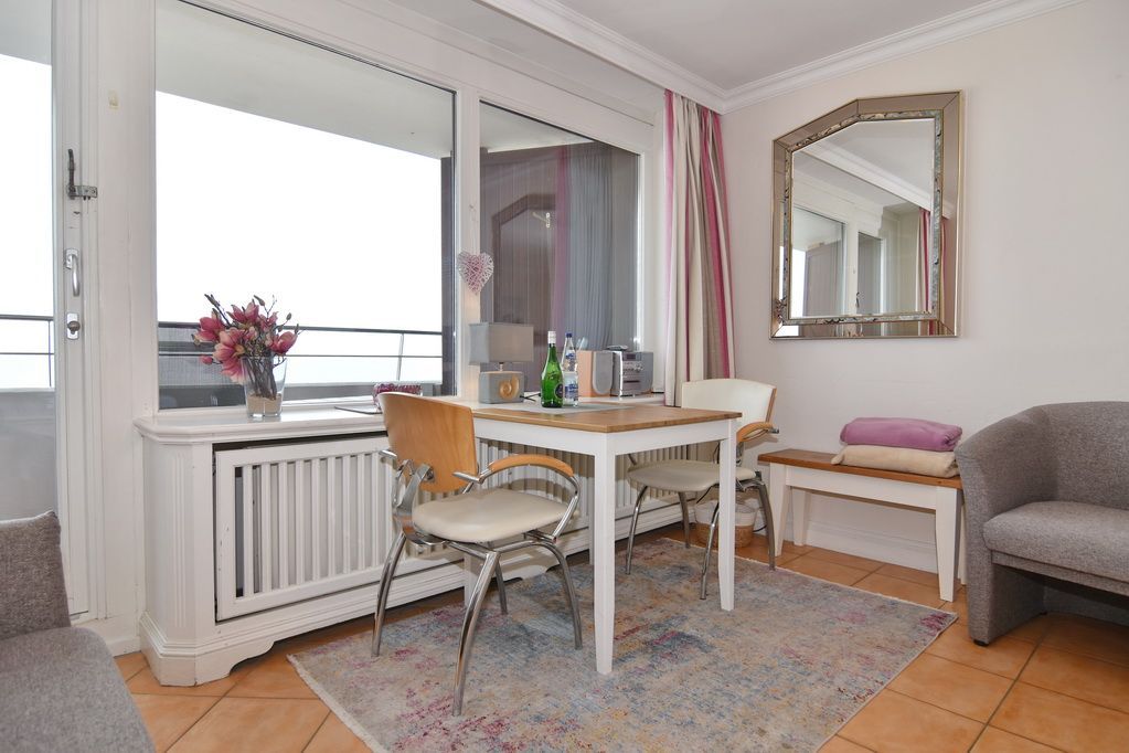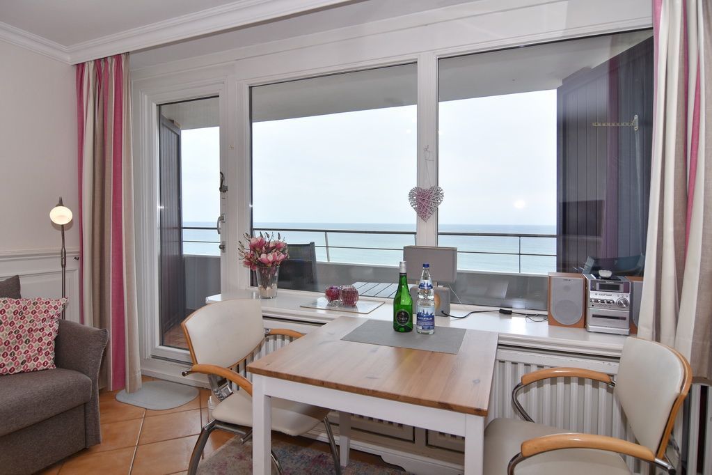 1-Zimmer-Ferienwohnung im Haus Metropol, 7. OG. ca. 34 m², max. 2 Personen. Wohn-/Schlafraum mit Podestdoppelbett (2x90x200), Dreisitzer-Couch und Eßplatz am Fenster, Kabel-TV, Radio, W-Lan (ohne Gewähr), Westbalkon mit herrlichen Meeresblick, Küchenzeile im Flur mit Geschirrspüler, Kühlschank und Ceranfeld, Duschbad/WC. Apartment ist komplett mit Terrakotta-Fliesen ausgelgegt. Nichtraucher-Apartment! WBettwäsche und Handtücher sind zur Anreise aufgezogen. Ein PKW-Stellplatz kann kostenpflichtig zugebucht werden.