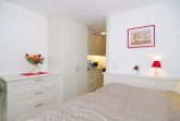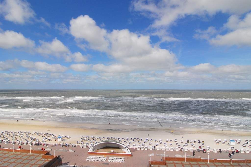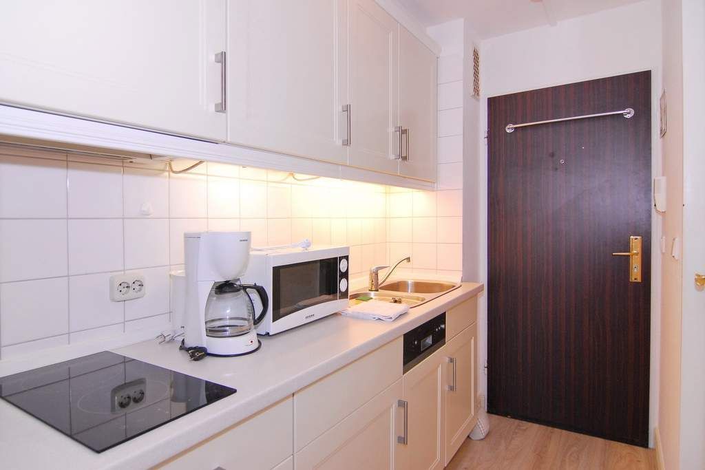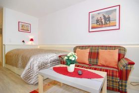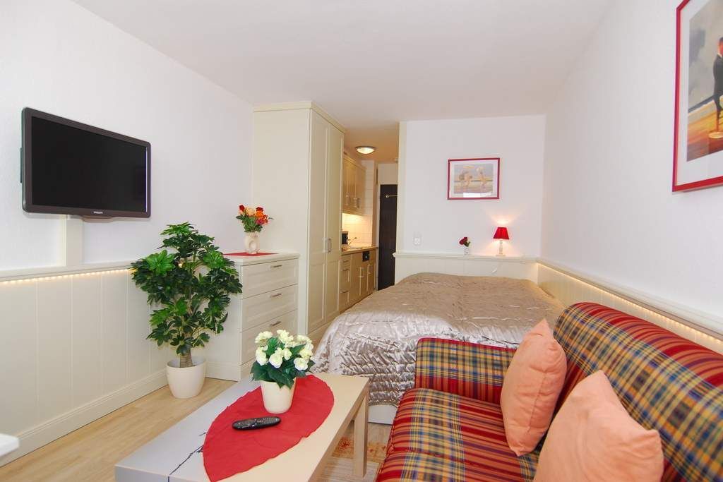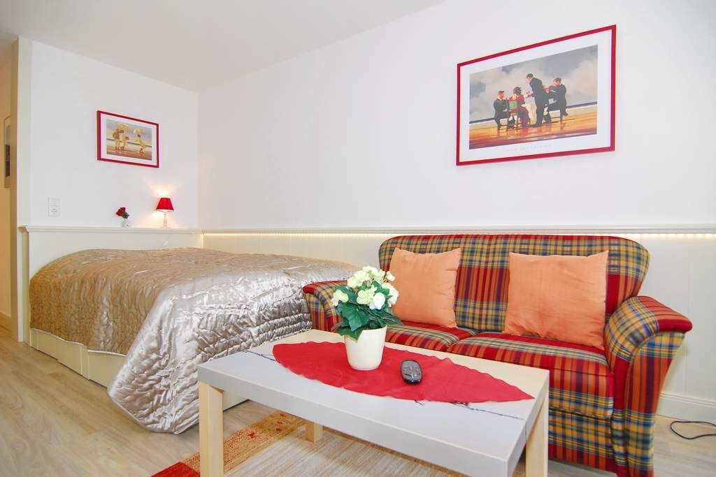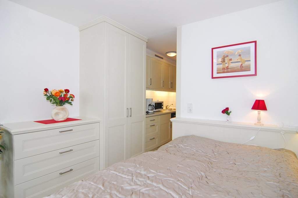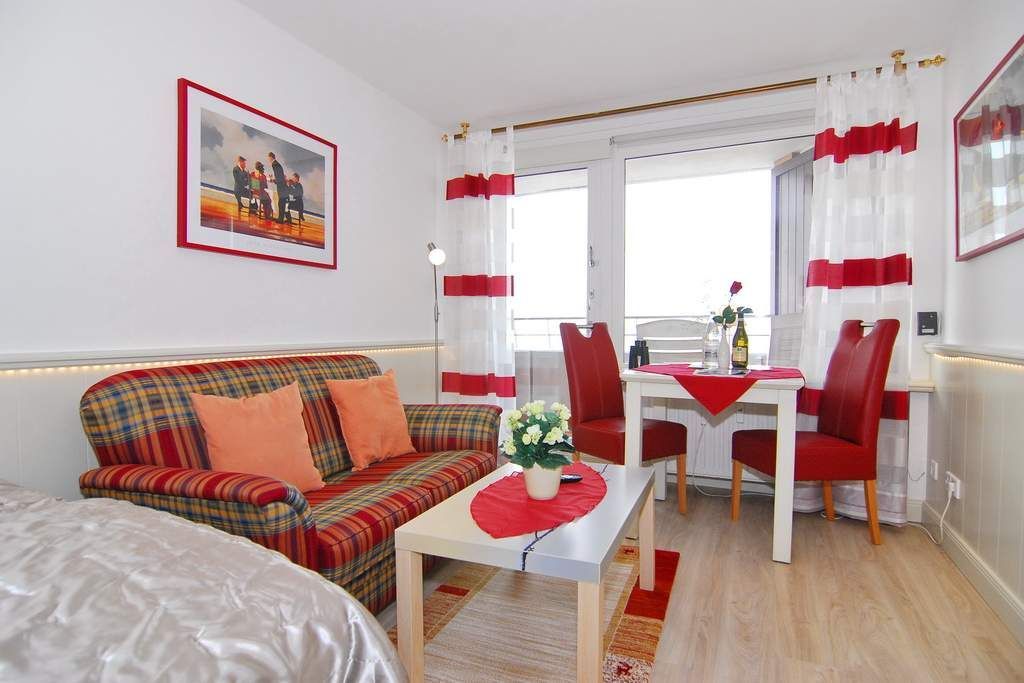 1-Zimmer-Ferienwohnung zur Meerseite im 7. OG des  Haus Metropol, ca. 25 m², Nichtraucher. Wohn-/ Schlafraum mit Westbalkon mit freiem Blick auf die Nordsee, Esstisch am Fenster, Couch und Einbauschrank, Doppelbett (140x200), Radio, Flat-TV, W-Lan (ohne Gewähr), offene Küchenzeile im Flurbereich mit Geschirrspüler, Duschbad/ WC. Das Appartement ist mit Design-Fußboden ausgelegt. Tierhaltung ist nicht gestattet. Bettwäsche und Handtücher sind zur Anreise aufgezogen. Ein PKW-Stellplatz kann kostenpflichtig zugebucht werden.