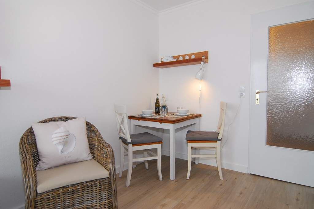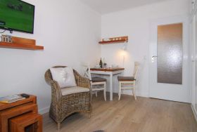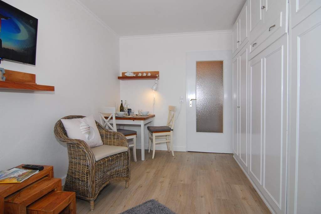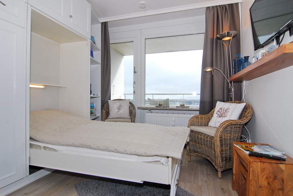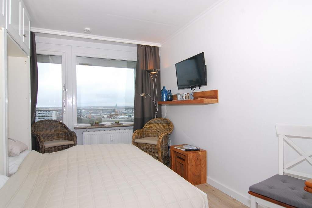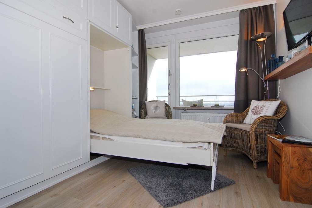 1-Zimmer-Wohnung mit Ostbalkon und herrlichem Blick über die Insel im 9.OG. des Haus Metropol. Ca. 23m². Wohn- und Schlafraum mit Einzelschrankbetten (2x90x190), Essplatz für 2 Personen, 2 Korbsessel, Flatscreen-TV, Radio, W-LAN (ohne Gewähr), Küche im Flurbereich mit Cerankochfeld. Neues Duschbad/WC. Das Apartment ist für Tierhaltung freigegeben. (Keine Kampfhunde). Bettwäsche und Handtücher sind zur Anreise aufgezogen. Ein PKW-Stellplatz kann kostenpflichtig zugebucht werden. Rauchen ist in der Wohnung nicht erlaubt.