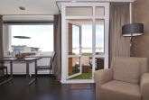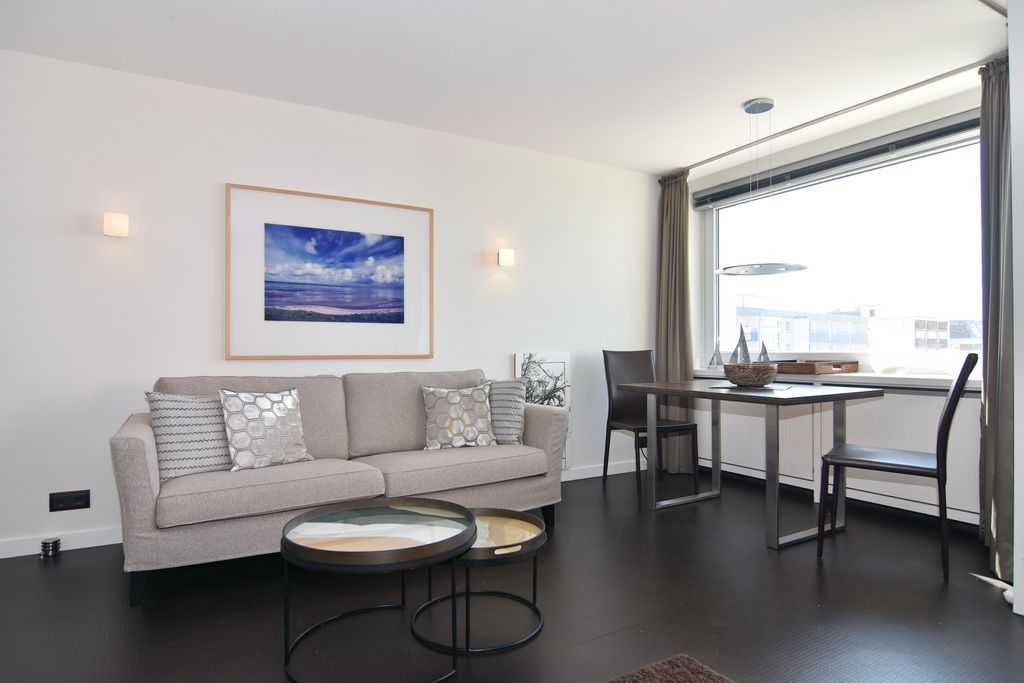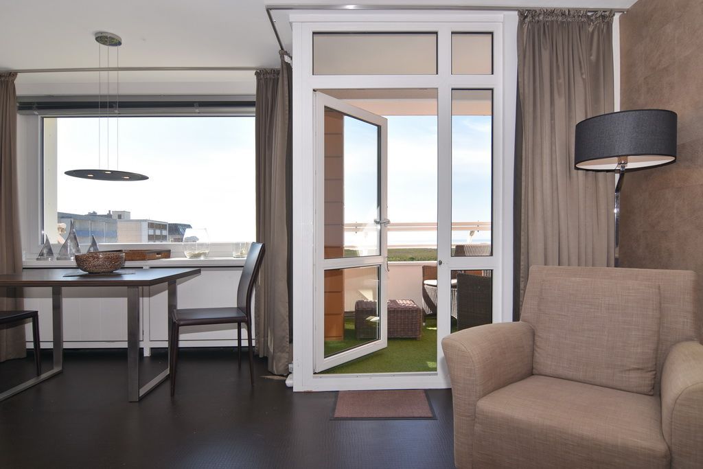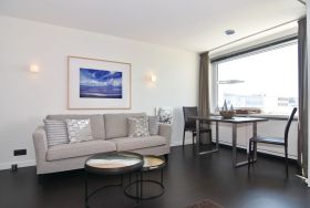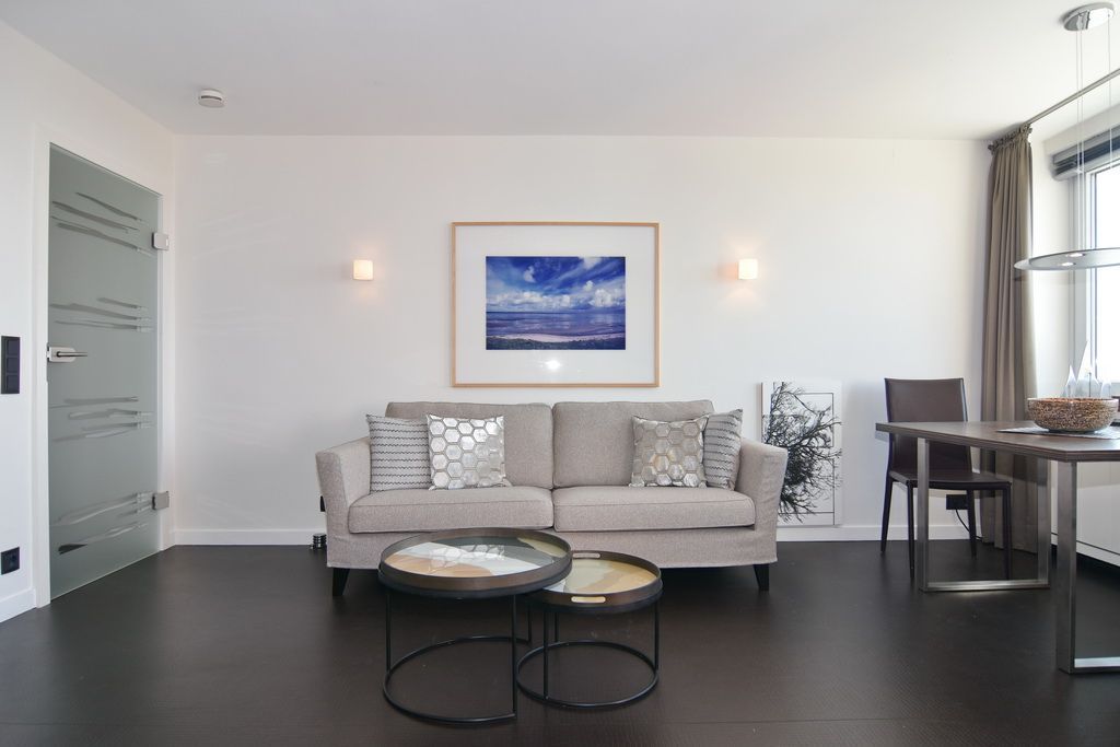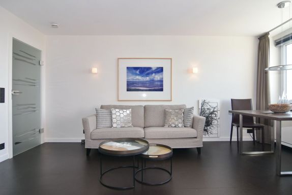 Tö Fiirens - friesisch für In der Ferne. Exklusive 1-Zimmer-Ferienwohnung im Windhuk. Ca. 44m² im 5. OG mit freiem Seeblick. Die perfekt gestaltete Wohnung bietet ein erhöhtes Doppelbett mit Seeblick, eine Couchecke sowie einen Essplatz am Fenster. Die separate Küche ist mit Geschirrspüler und Mikrowelle ausgestattet, großzügiges Duschbad/WC. Flat-Screen, Stereoanlage mit Dockingstation, Internet/dt. Festnetzflat, Safe, Westbalkon mit Balkonmöbeln, Pkw-Stellplatz Nr. 37. Bettwäsche und Handtücher sind zur Anreise aufgezogen. Waschküche im Haus!