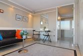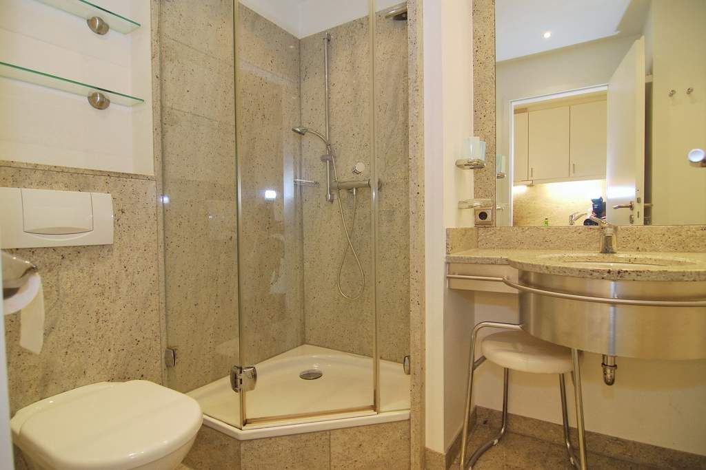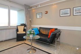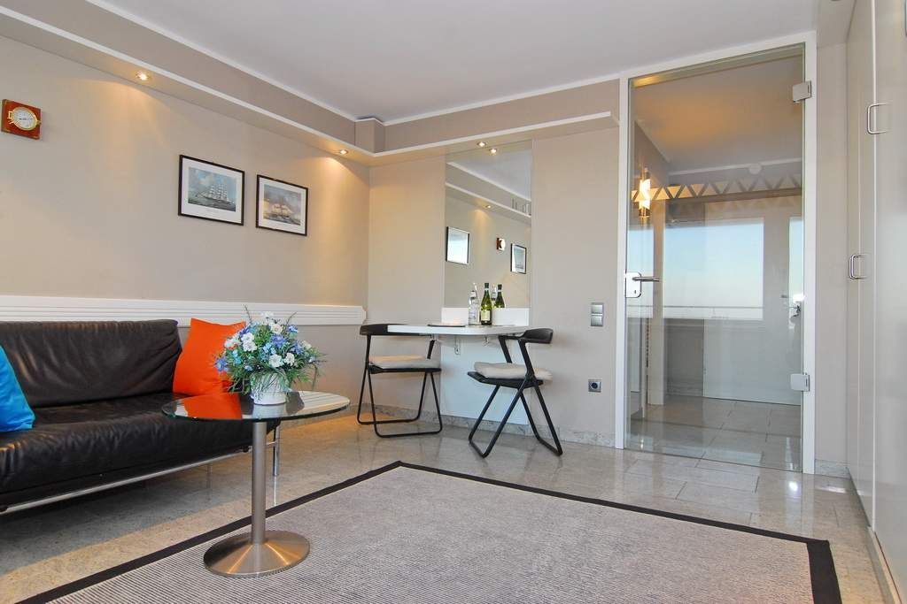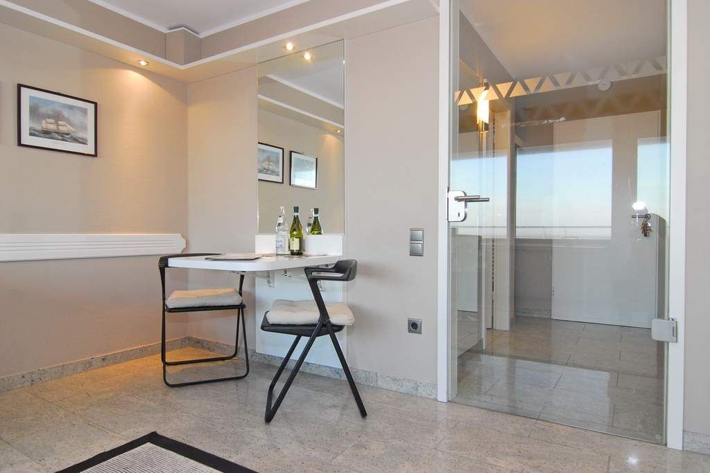 Exklusive 1-Zimmer-Ferienwohnung im 10. OG des Haus Metropol. Wohn-/Schlafraum mit 1 Einzelschrankbett und Couch, hübsche Küche im Flur mit Mikrowelle und Geschirrspüler, schickes Duschbad/WC, Garderobe. Kabel-TV/Radio, WLAN (ohne Gewähr), Ostbalkon mit Balkonmöbeln und Blick über die Insel. Nichtraucherwohnung. Die Wohnung ist komplett gefliest. Tierhaltung ist nicht gestattet. Bettwäsche und Handtücher sind zur Anreise aufgezogen. Ein PKW-Stellplatz kann kostenpflichtig zugebucht werden.