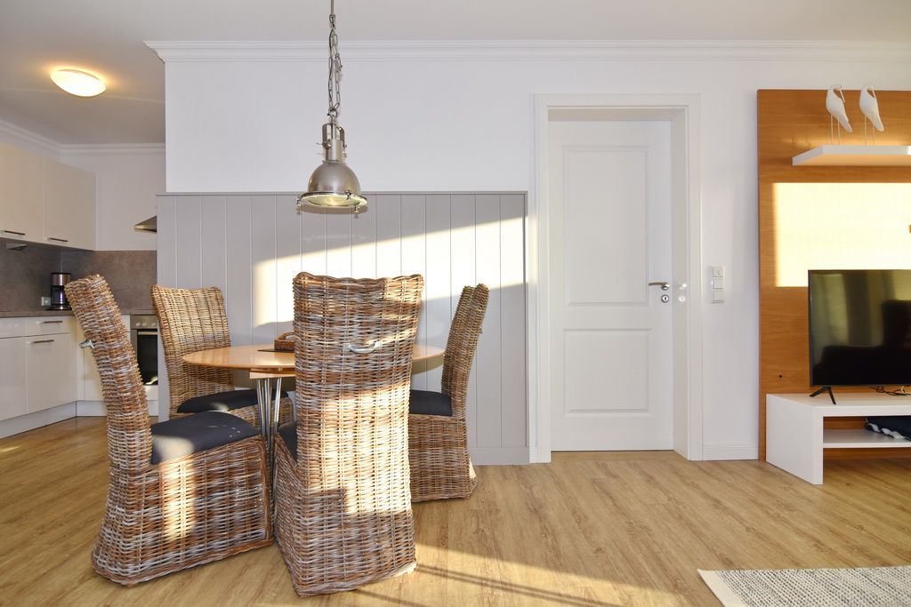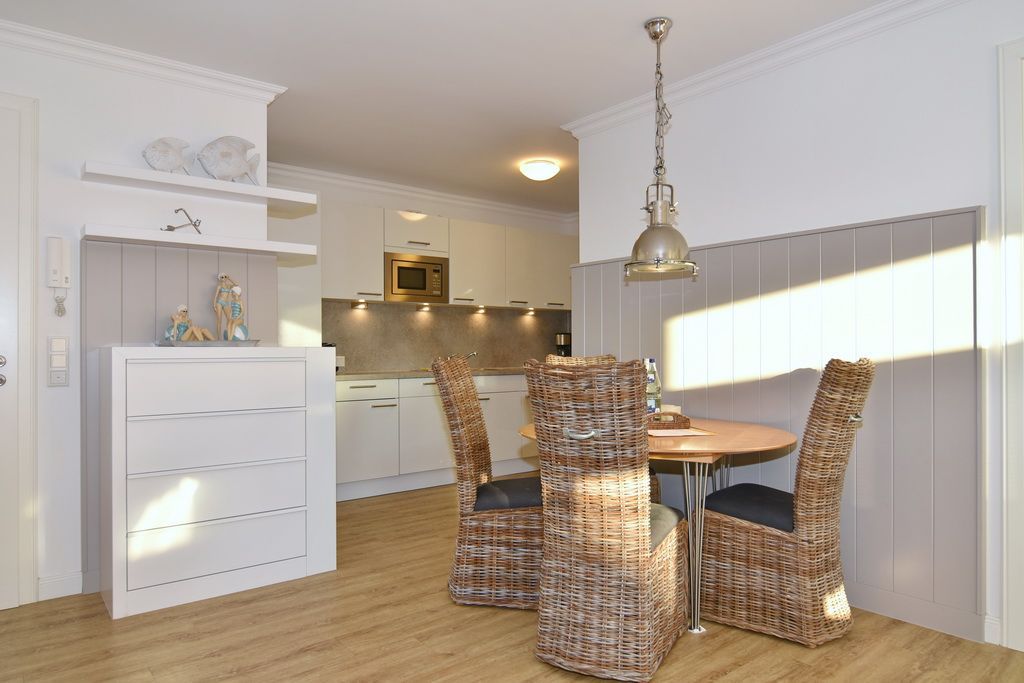 Exklusive 2-Zimmer-Ferienwohnung, 1. OG, ca. 68 m², Nichtraucher, Wohnzimmer mit Schlafcouch (160x190), Sessel, Esstisch mit 4 Stühlen, Flat-TV, Stereoanlage, offene Küche m. Geschirrspüler, Mikrowelle und Backofen, Nespresso-Maschine, Schlafzimmer mit Doppelbett (200x200), Einbauschrank und Flat-TV (mit Netflix-Funktion), W-LAN ( ohne Gewähr ), Südbalkon, Duschbad / WC, Flur mit Garderobe. Fußboden mit Design Belag. Tierhaltung ist nicht gestattet. Ab 2026 ist Tierhaltung gestattet und muss kostenpflichtig angemeldet werden. Garagen-Parkbox Nr.20 ( nicht für jeden PKW geeignet, max. Höhe 1,50m, max. Gewicht 2t, Länge 5 m, Breite 1,90 m,vor Nutzung muss die Bedienanleitung gelesen werden. Anleitung befindet sich vor Ort!). Bettwäsche und Handtücher sind zur Anreise aufgezogen.